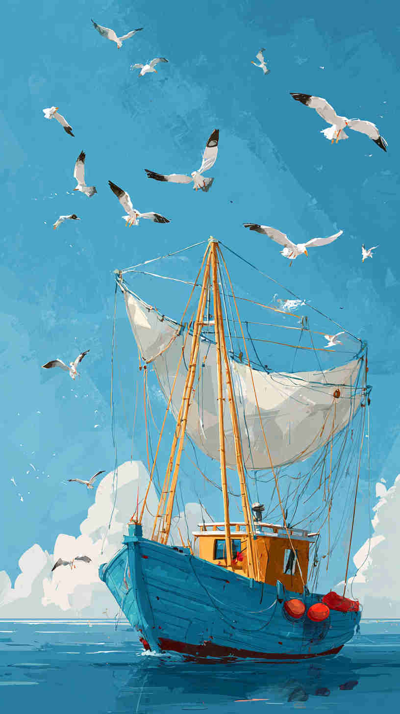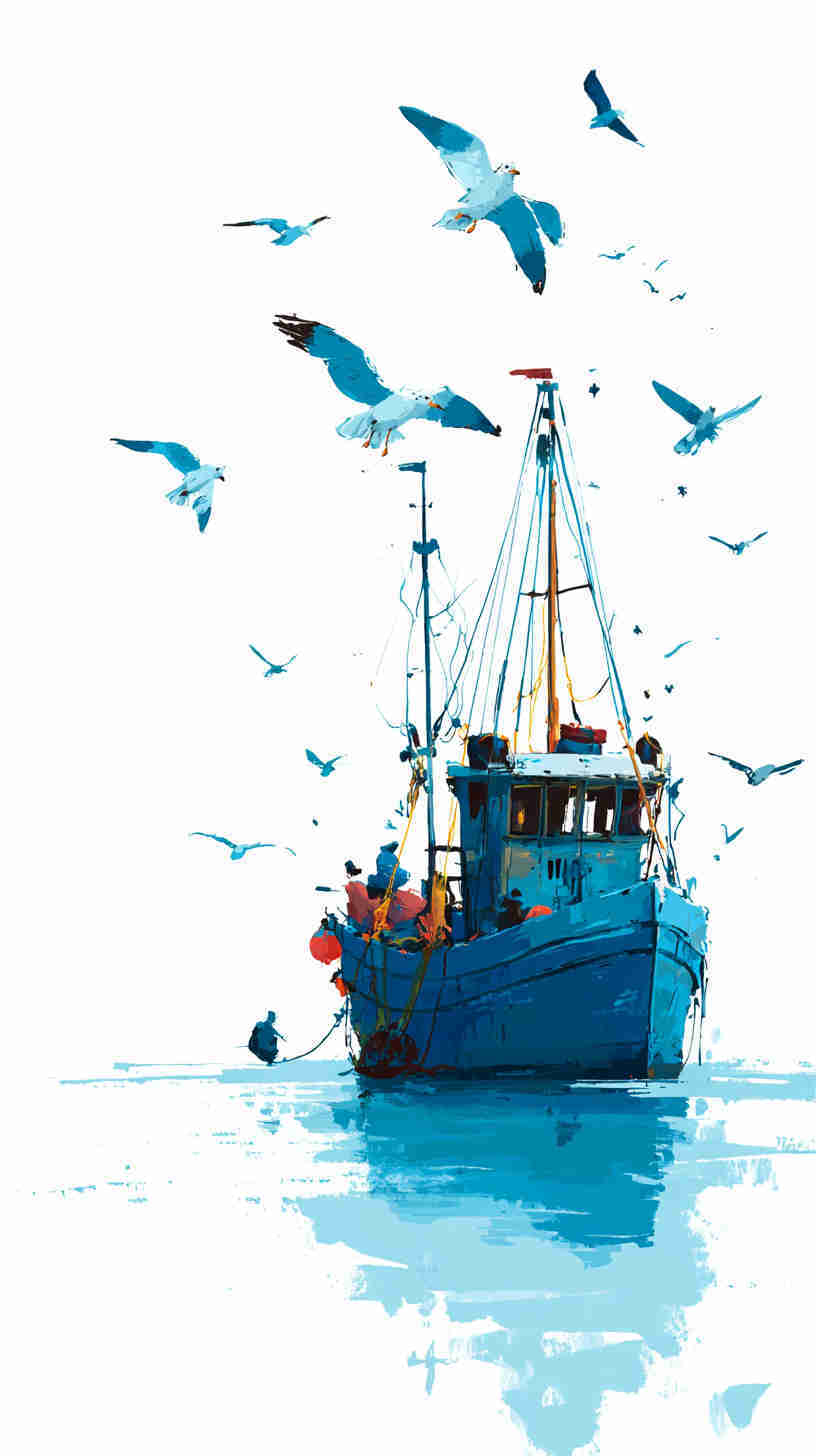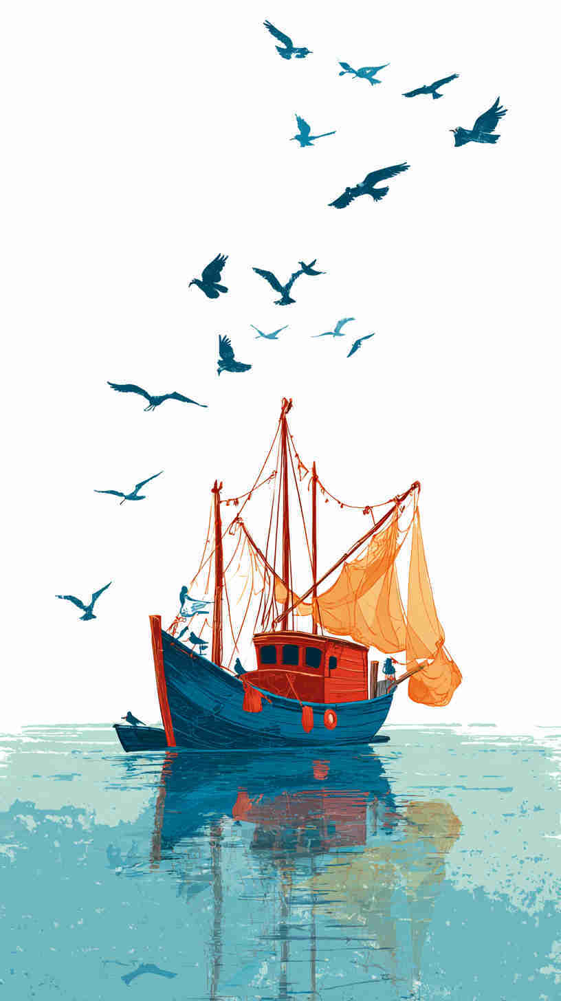 - Stormy Sea Adventures: Dramatic illustrations of fishing boats battling choppy waves, with bold colors and dynamic energy.