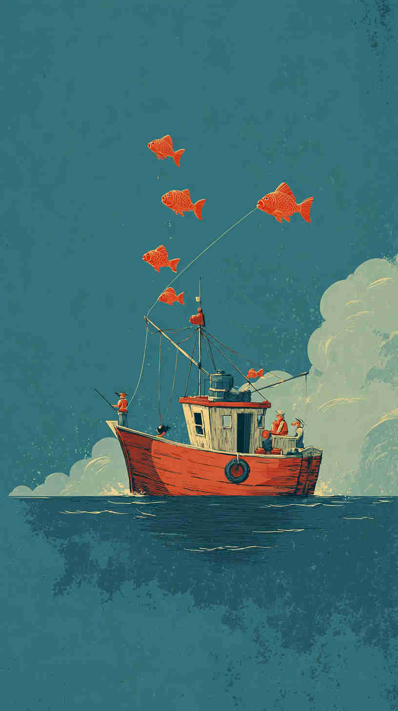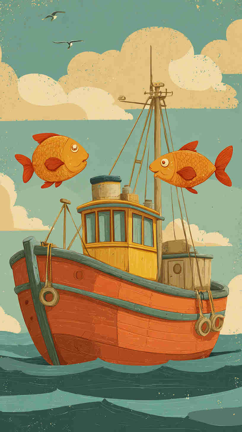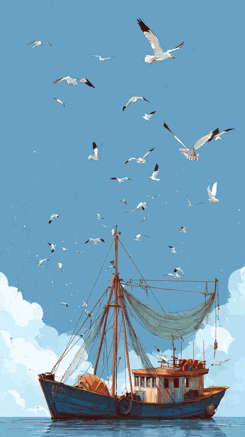 - Stormy Sea Adventures: Dramatic illustrations of fishing boats battling choppy waves, with bold colors and dynamic energy.