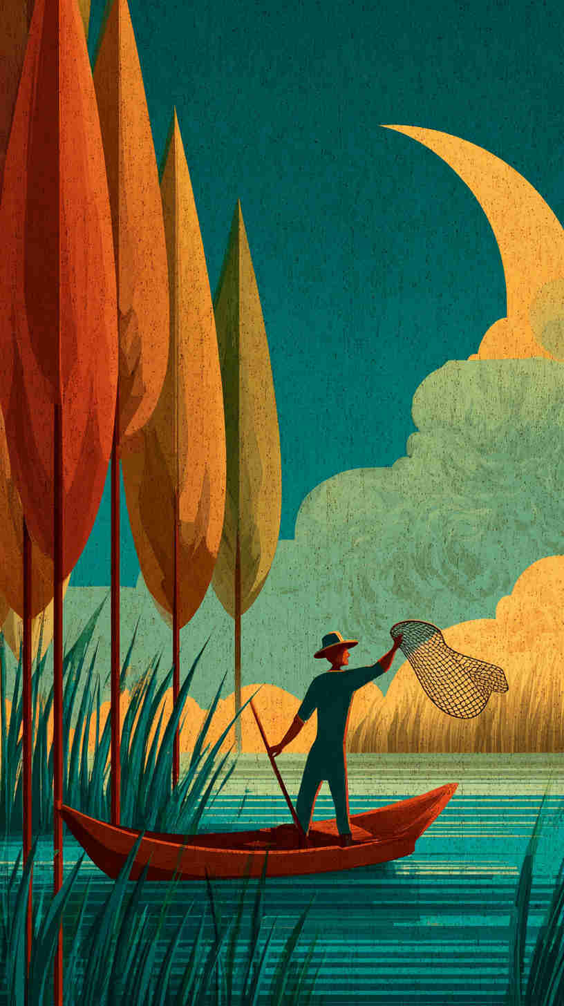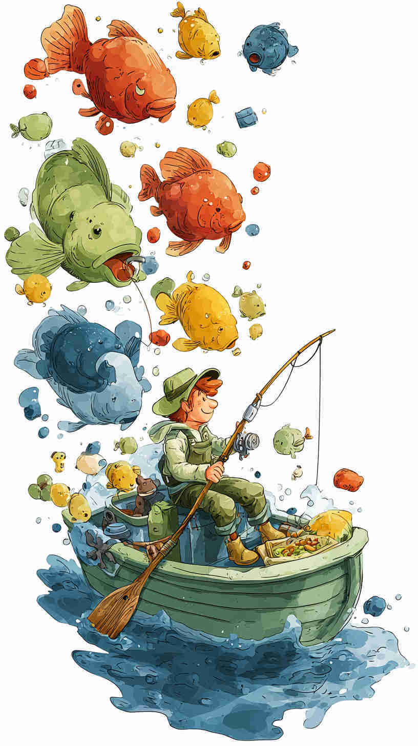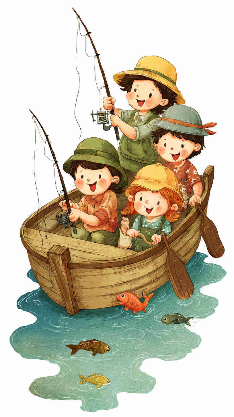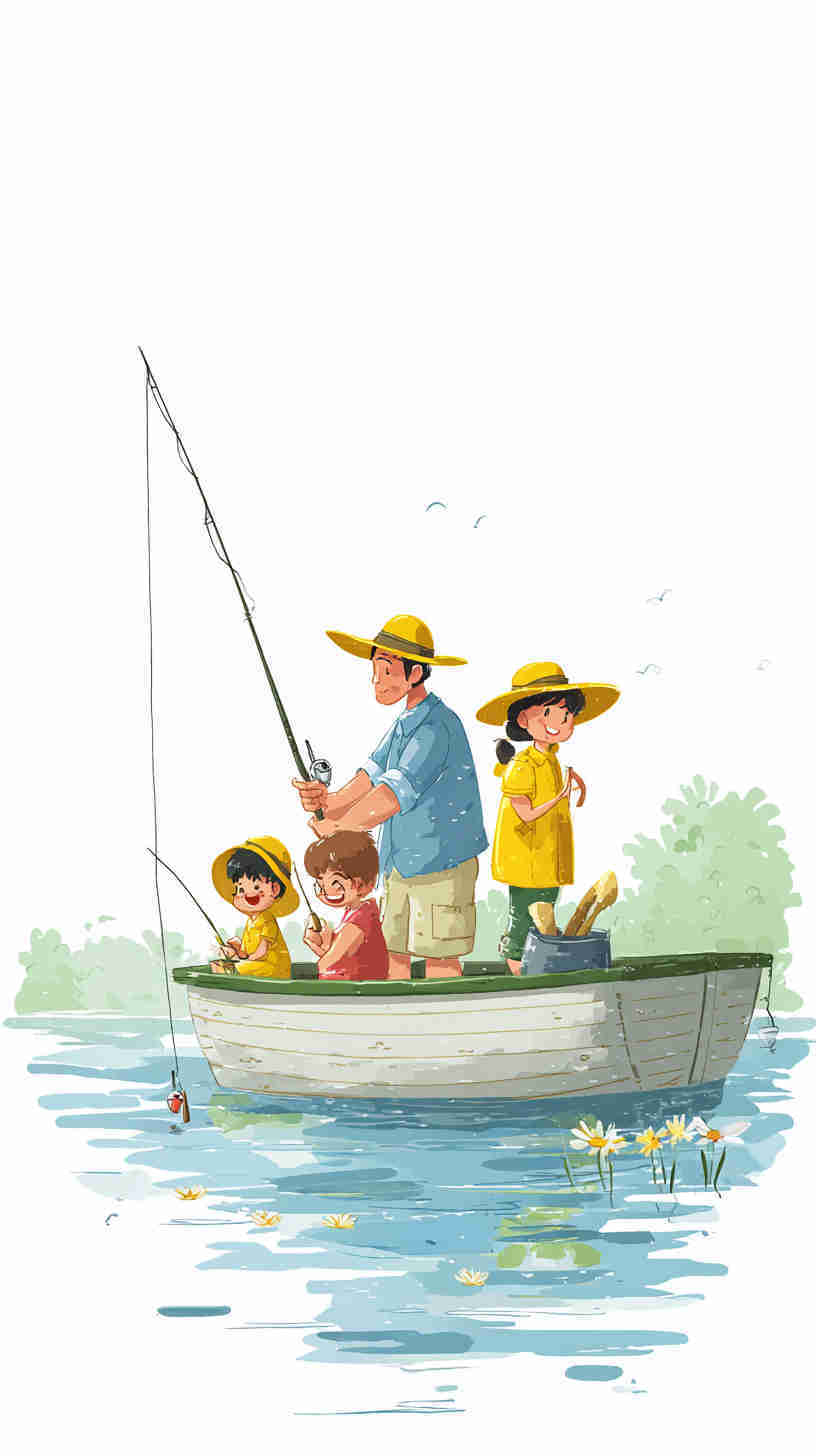 - Cartoonish Fishing Boats: Playful, exaggerated boats with smiling fish or oversized nets, set against vibrant lakes for a fun, lighthearted vibe.