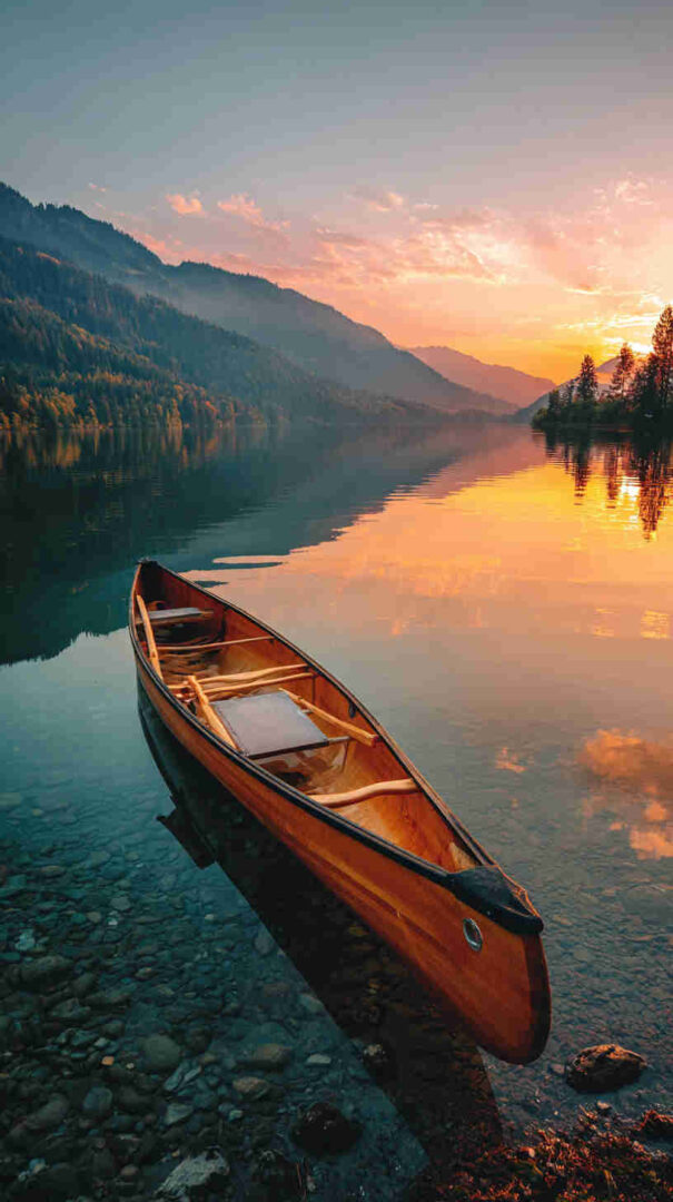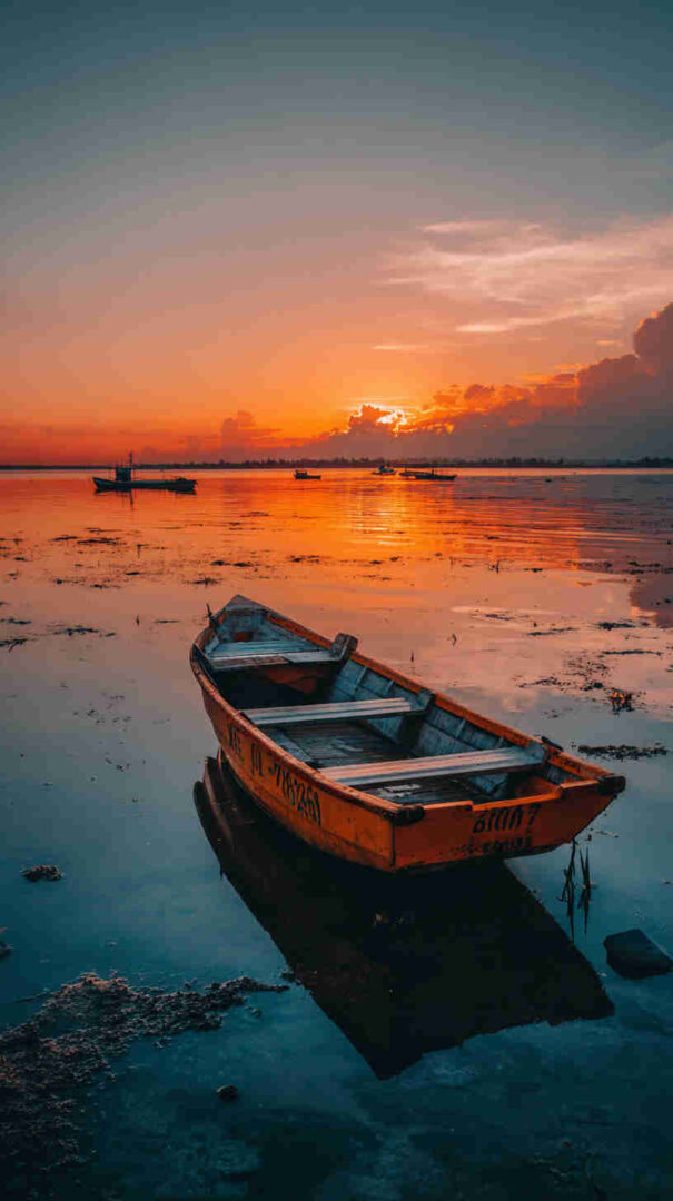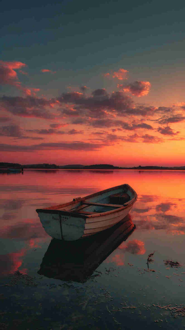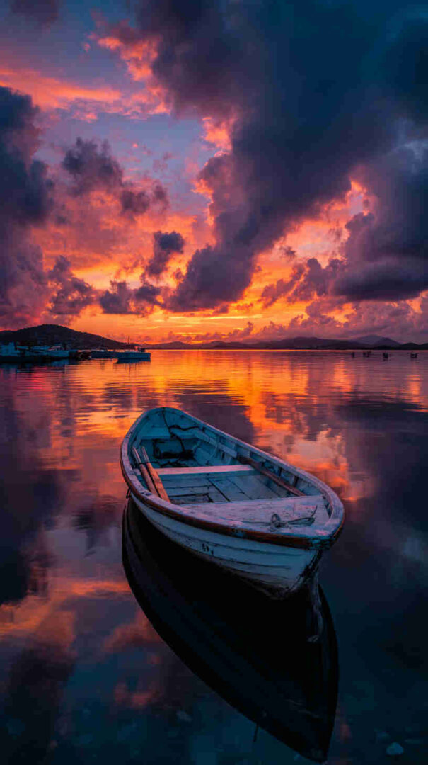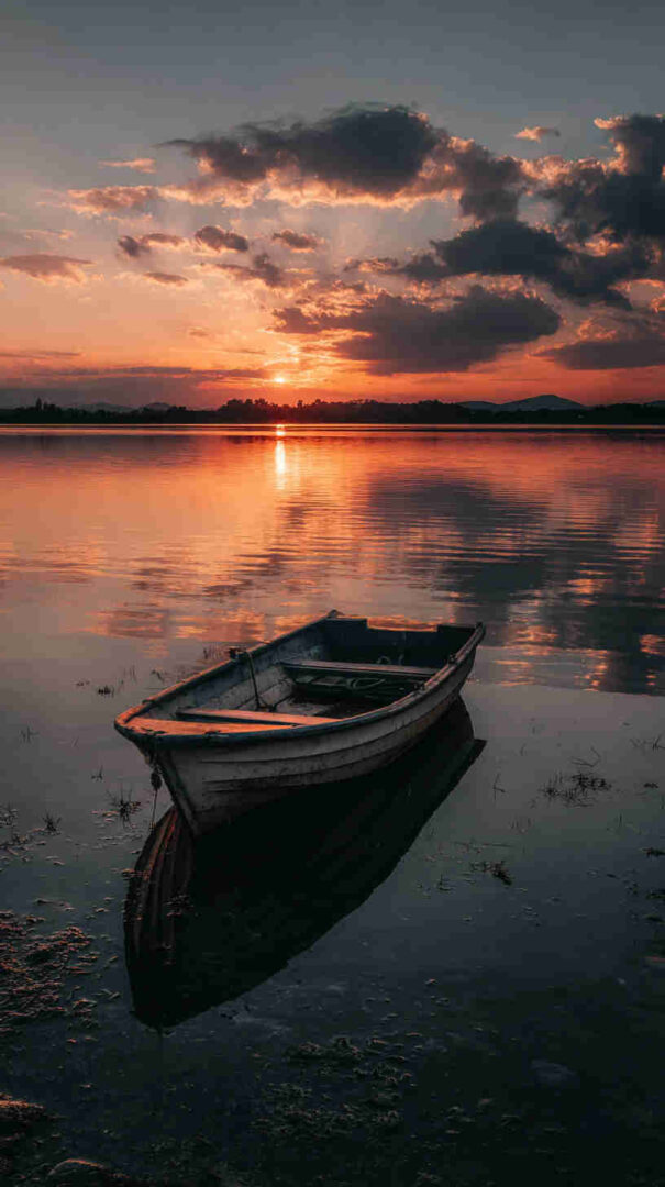 - Rustic Rowboat Serenity: Weathered rowboats on calm waters with vibrant sunset reflections, reflecting a simple, pastoral vibe.