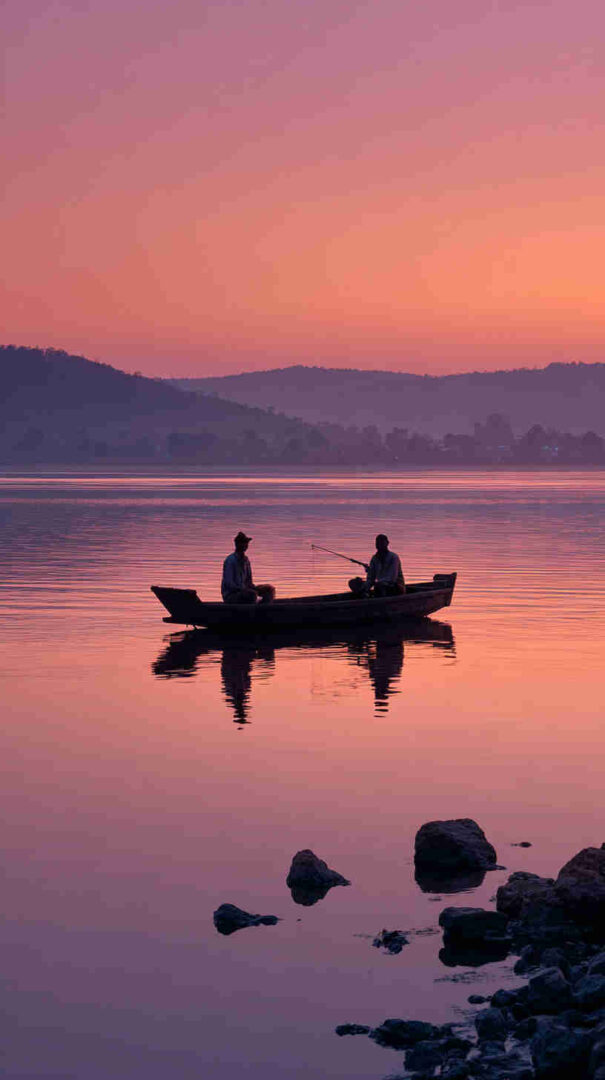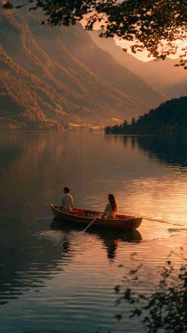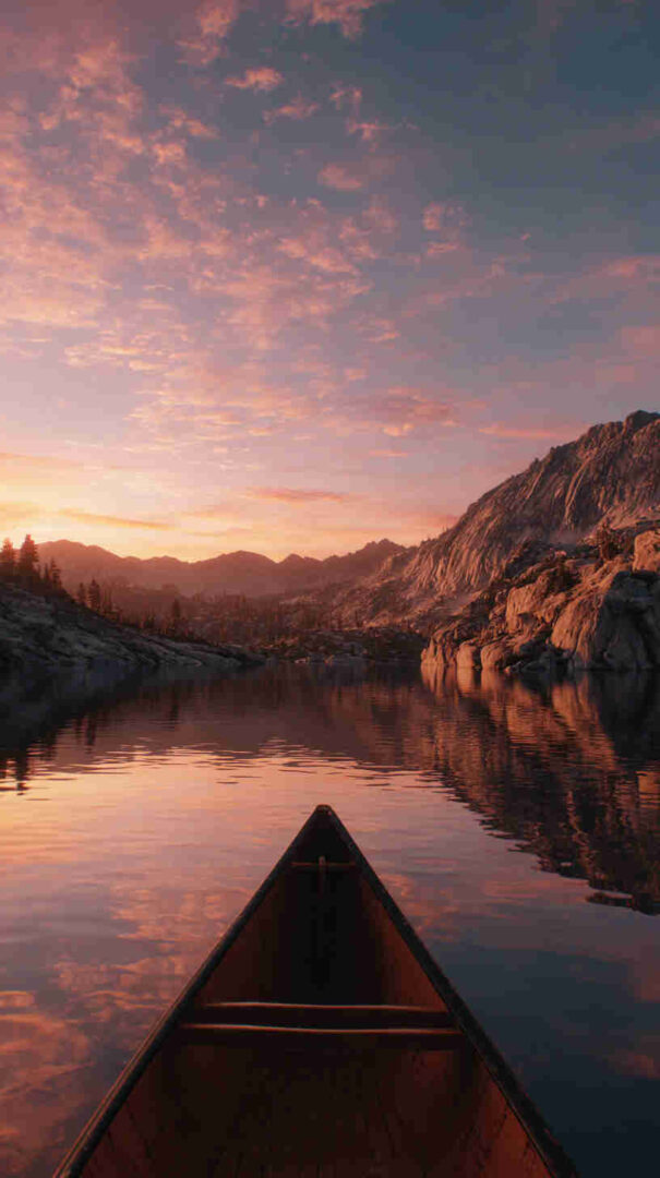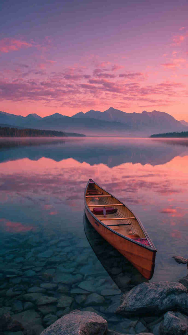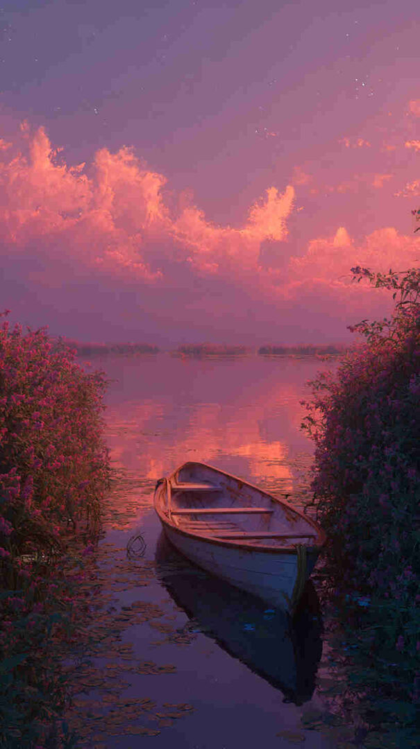 - Rustic Rowboat Serenity: Weathered rowboats on calm waters with vibrant sunset reflections, reflecting a simple, pastoral vibe.
