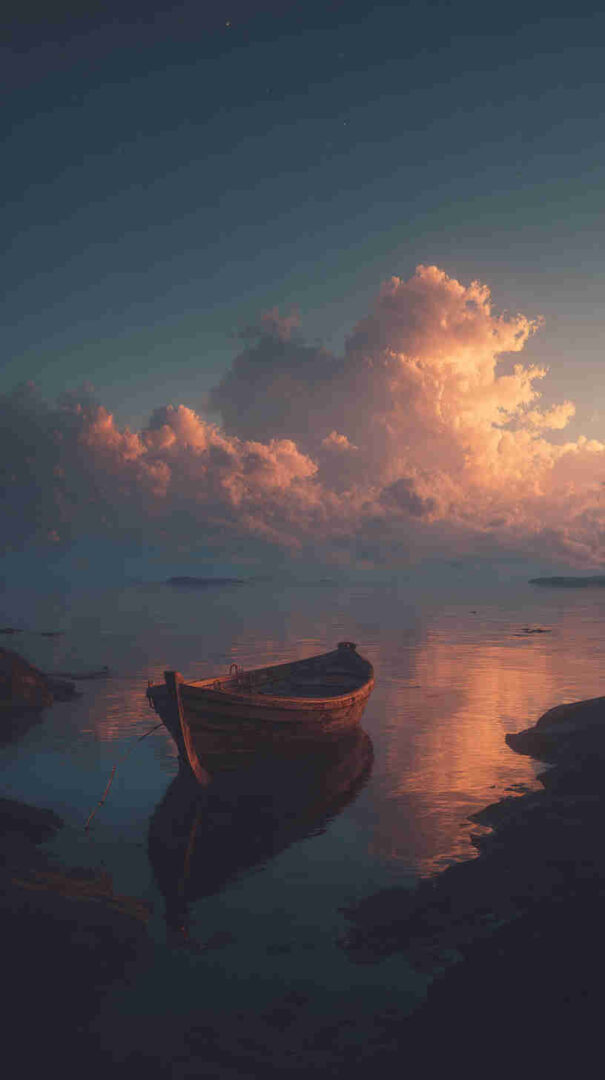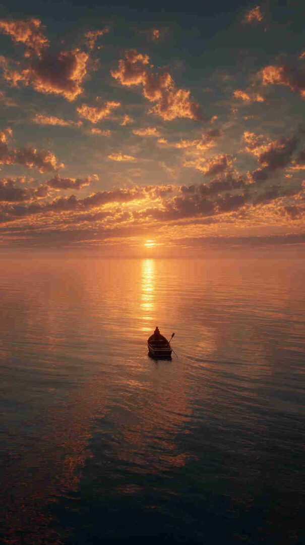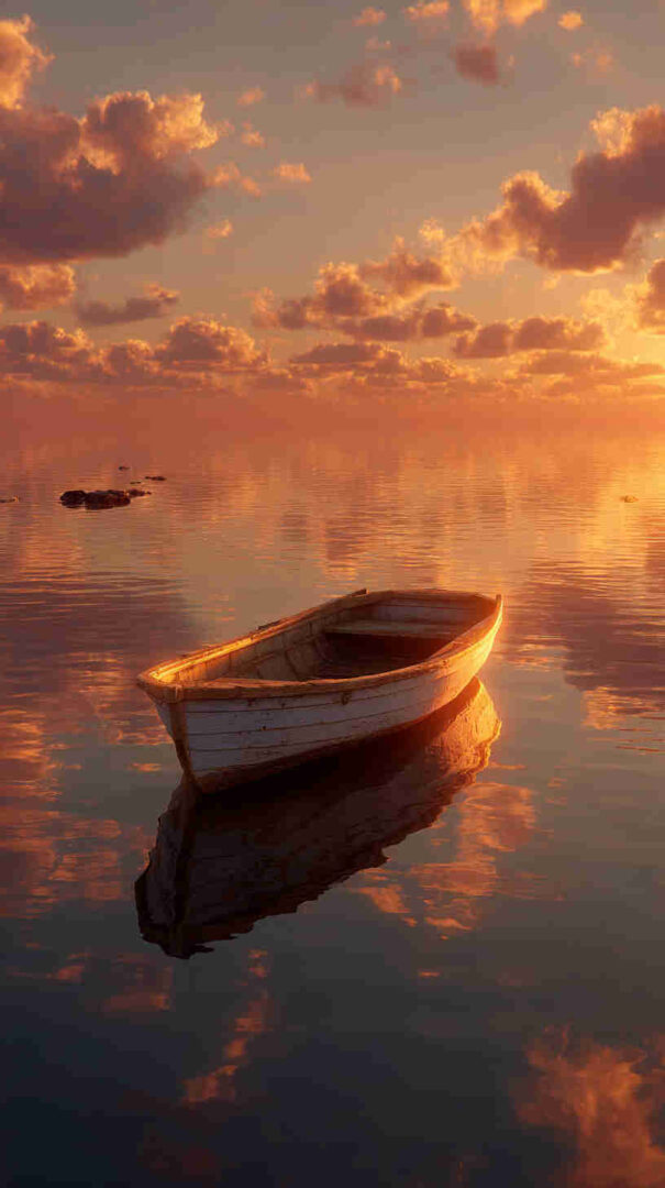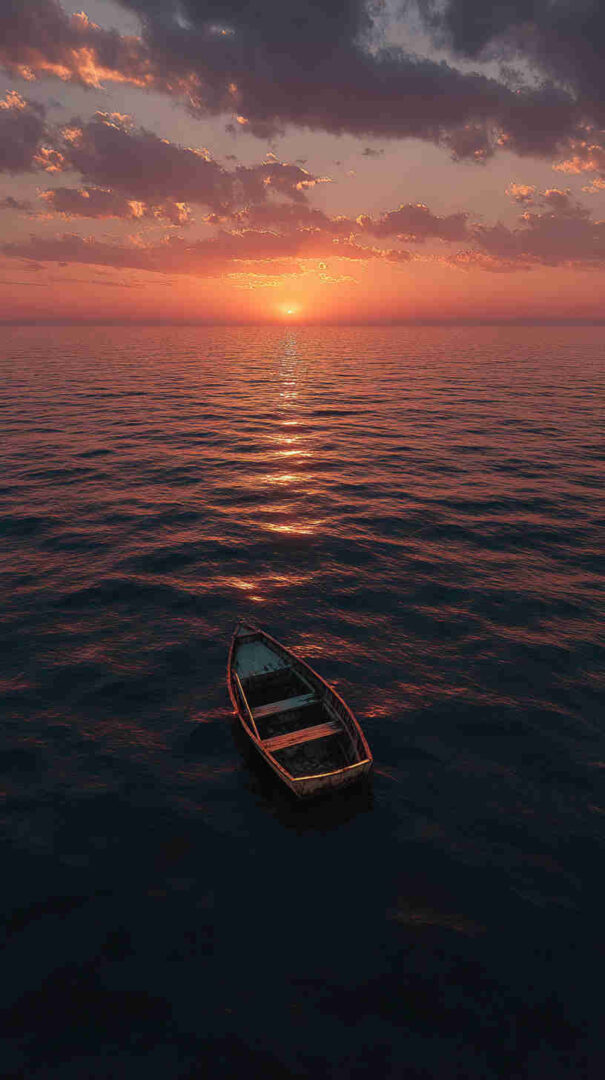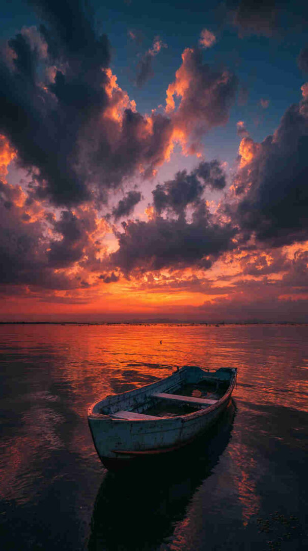- Dynamic Elements: Details like shimmering water reflections, distant horizons, or silhouetted seabirds, emphasizing the boat’s tranquil presence in a fleeting sunset moment.