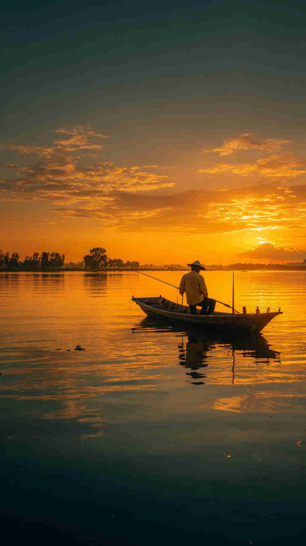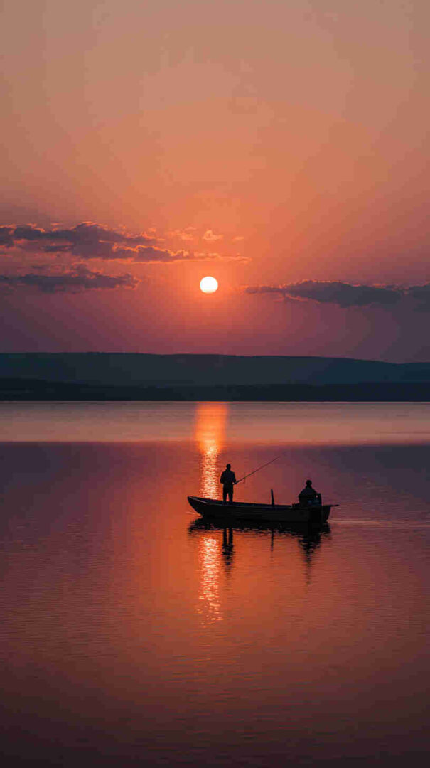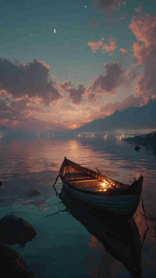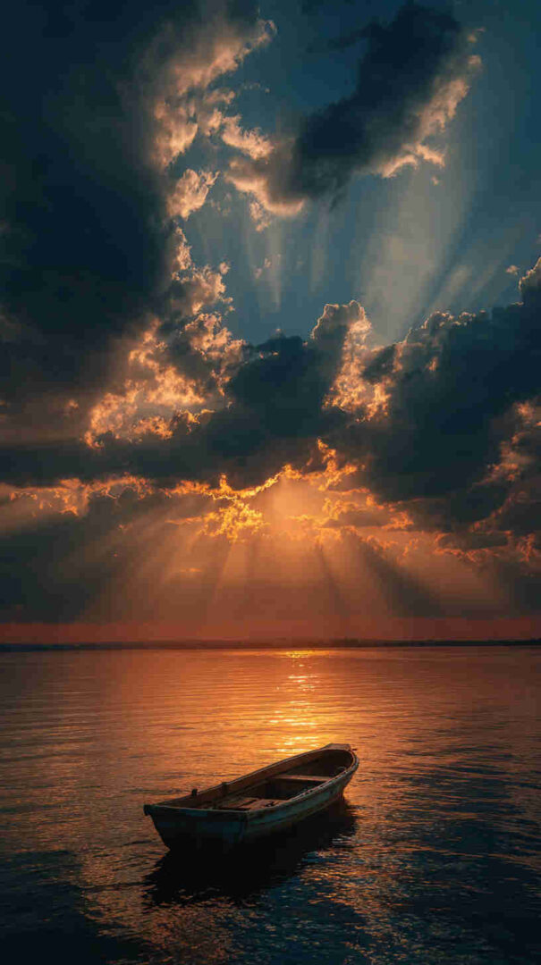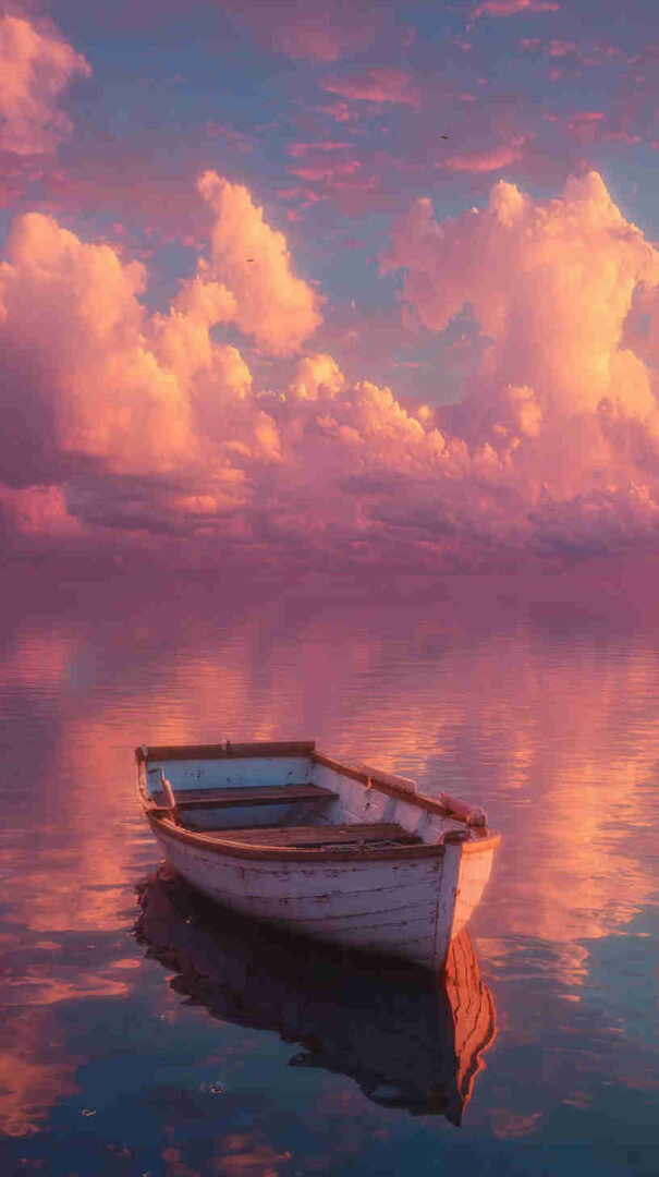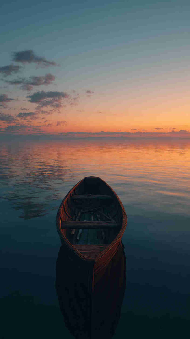 - Dynamic Elements: Details like shimmering water reflections, distant horizons, or silhouetted seabirds, emphasizing the boat’s tranquil presence in a fleeting sunset moment.