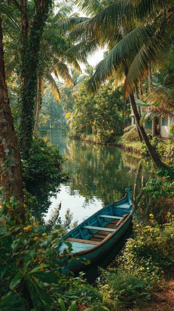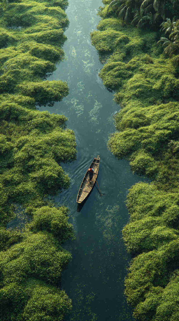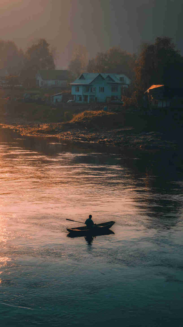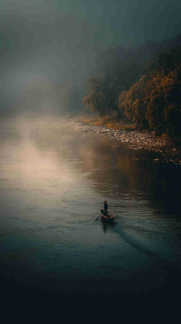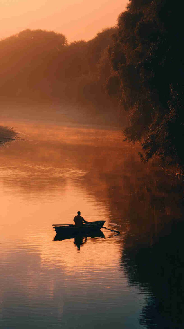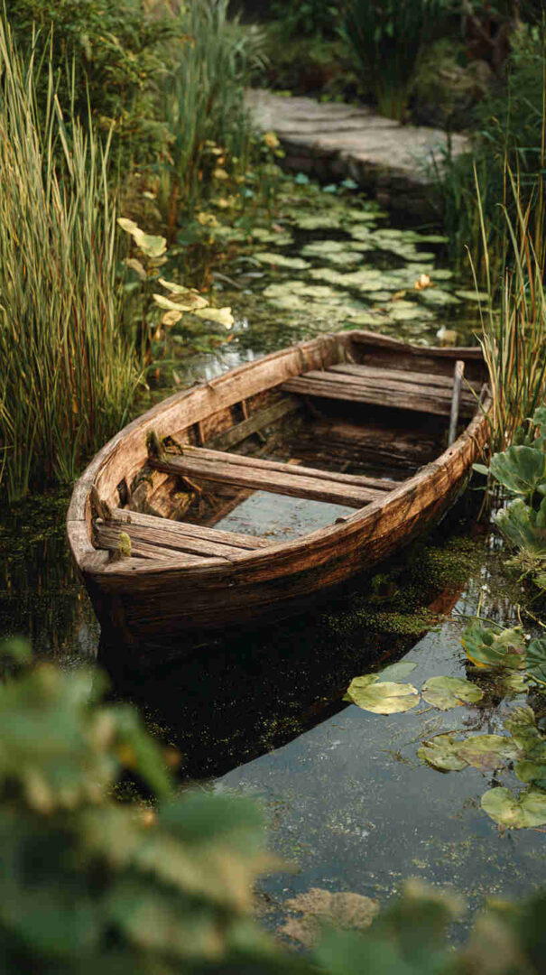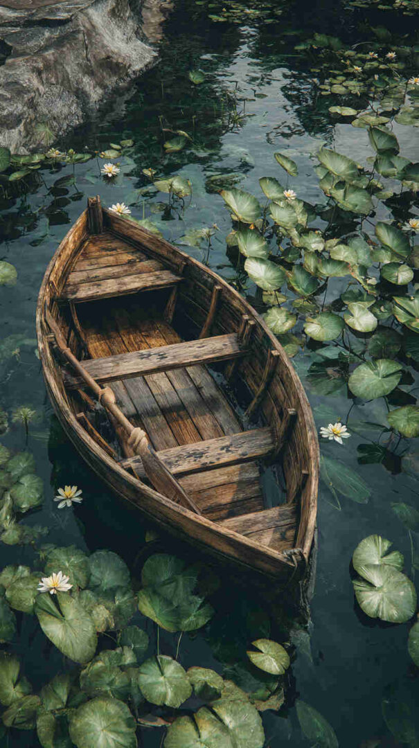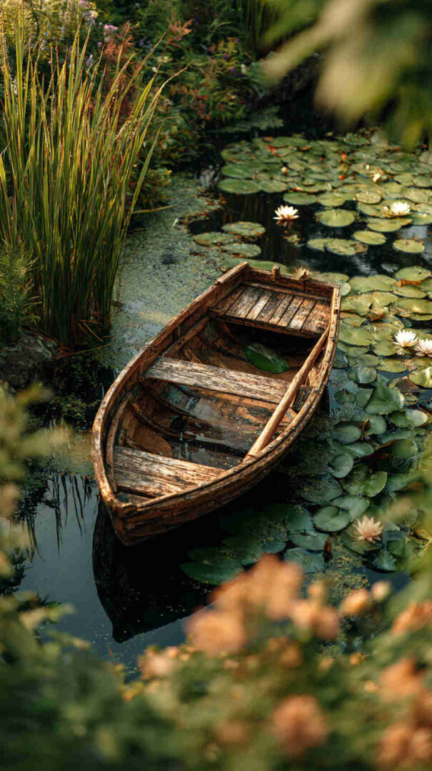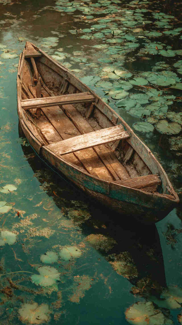 - Rustic Rowboat Vistas: Weathered rowboats on tranquil rivers or lakes with lush green banks, reflecting a simple, pastoral vibe.