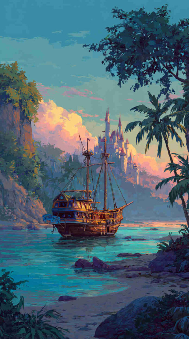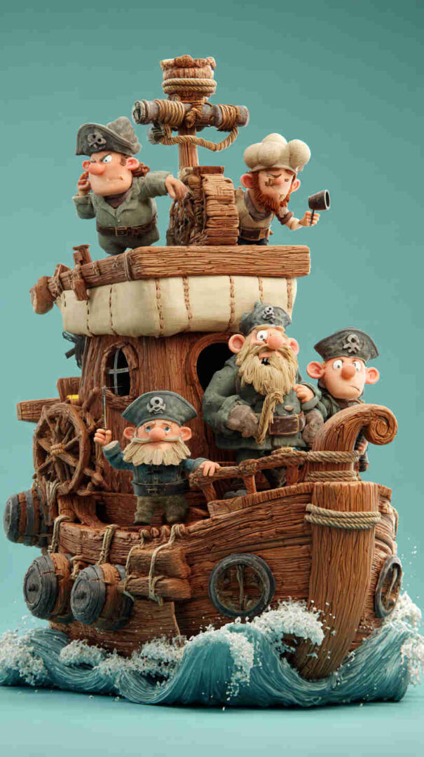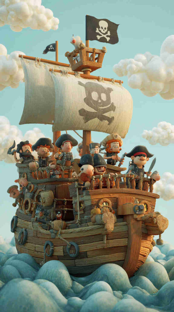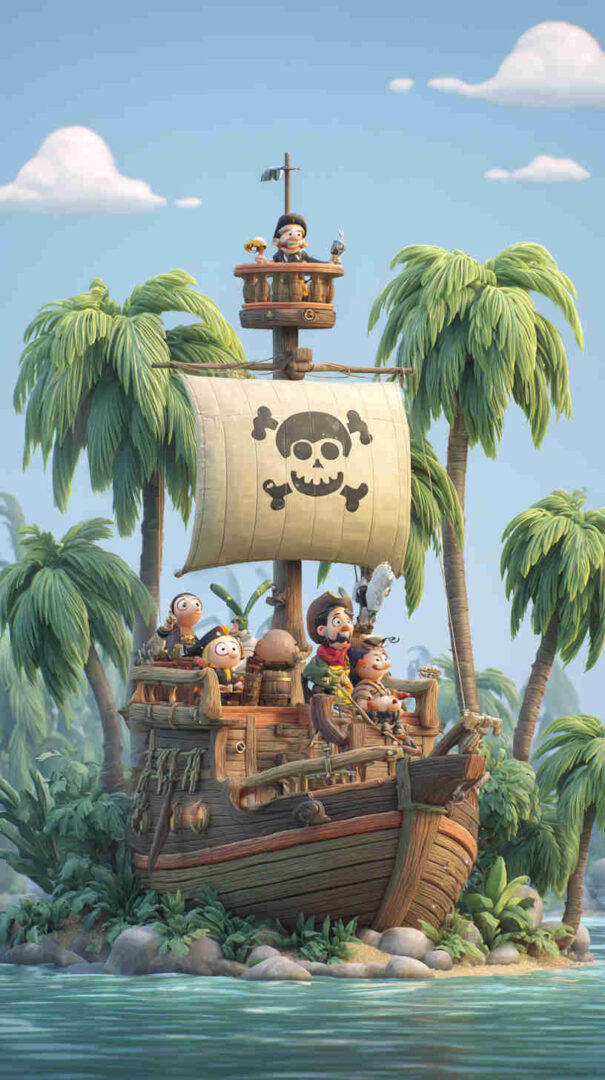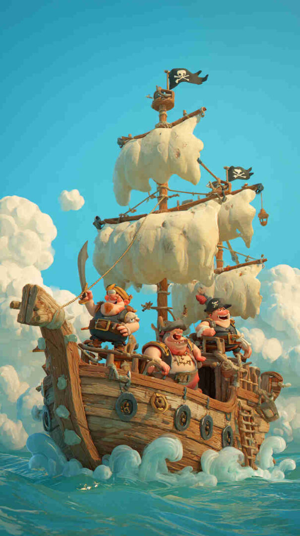 - Pirate Ship Fantasies: Cartoon pirate ships with treasure chests and jolly crew members, set against stormy seas or tropical islands, capturing adventurous fun.