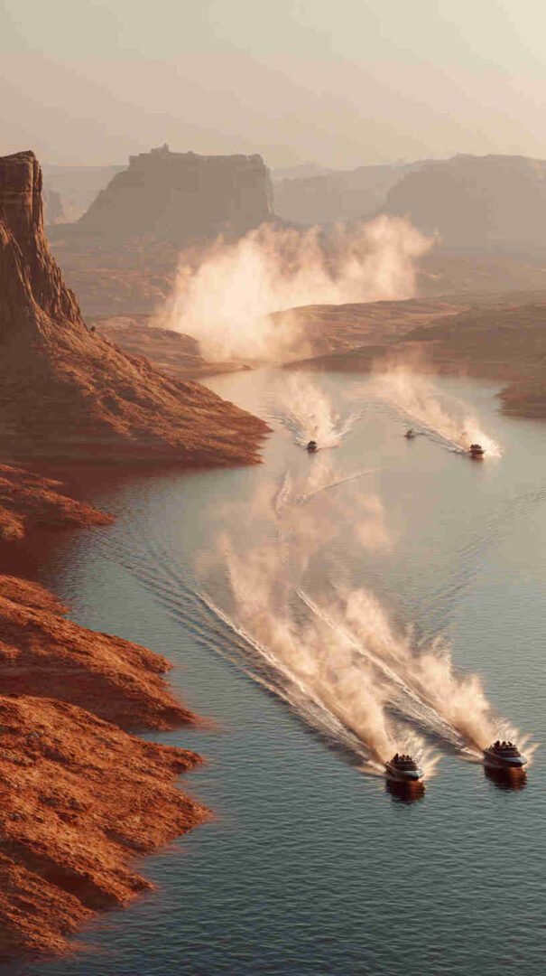Vintage vibes hit fever pitch with the 1930s Miss America X hydroplane, its stepped hull planing across a sepia-toned Lake Michigan, brass fittings aglow – a time machine for old-school enthusiasts dreaming of Gar Wood’s glory days. And for the modern monster fans, the quad-rigged Mystic Powerboats M420 in a blurred-speed abstract against Baja’s dusty cliffs has become the wallpaper of choice for garage wall projections, every rivet and ram etched in 8K glory.
