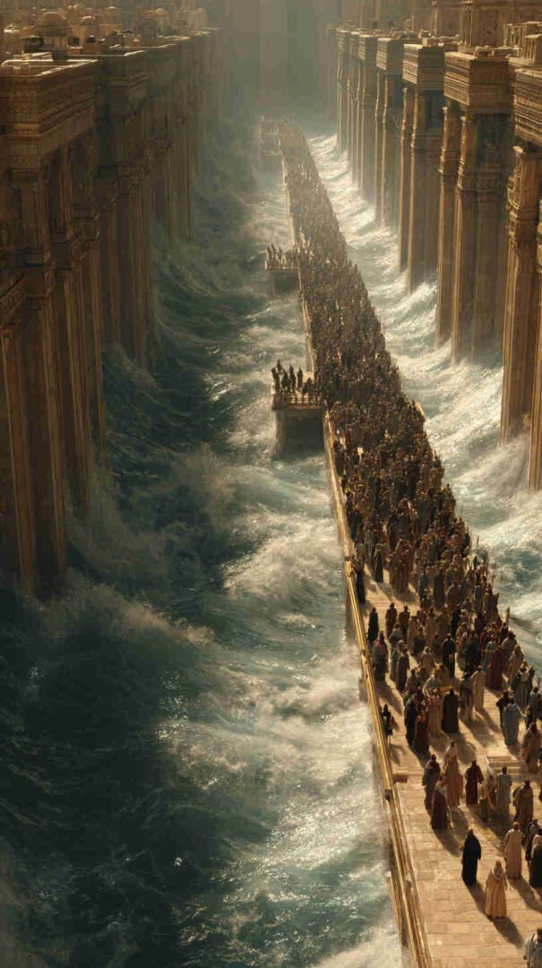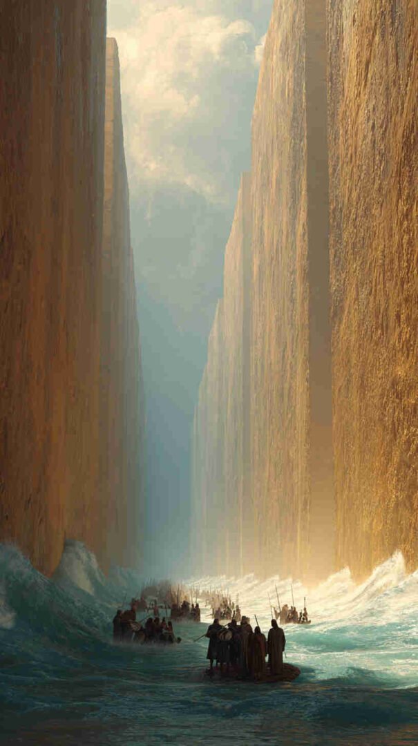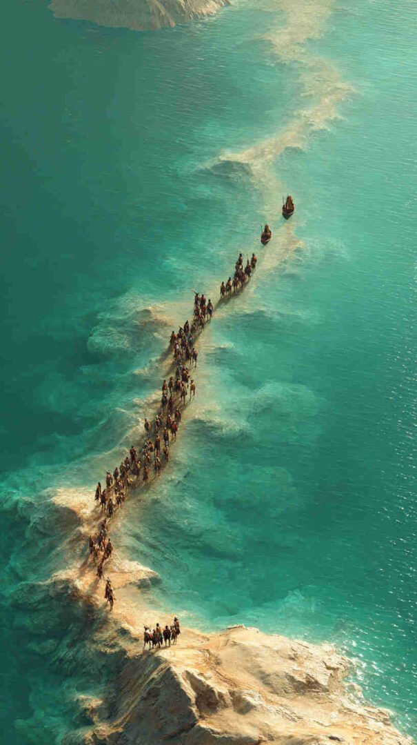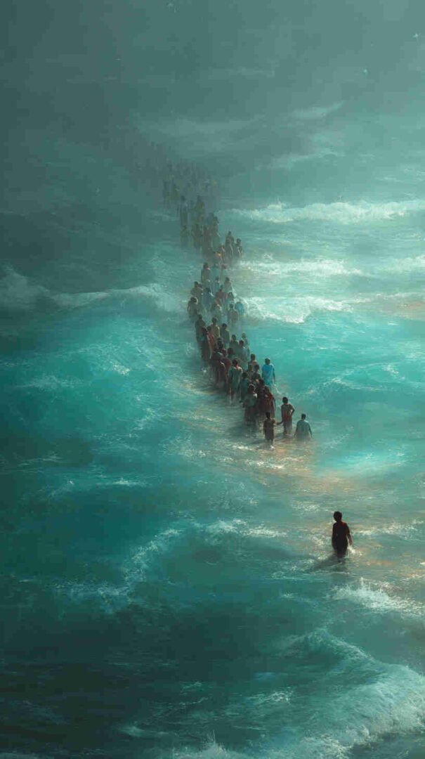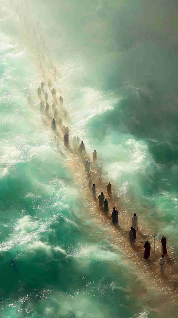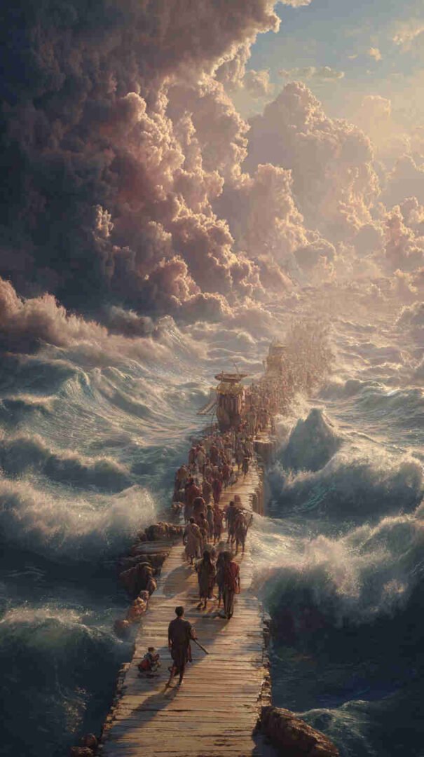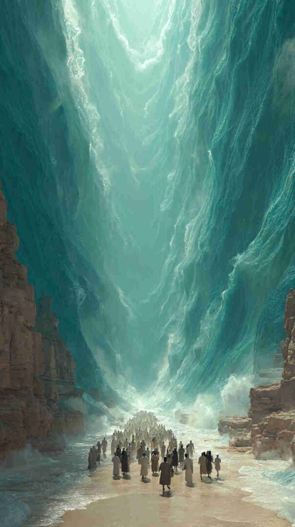 Interpretations vary: Epic realism with roaring waves and resolute refugees, symbolic minimalism focusing on the path of faith, or cinematic spectacles echoing Cecil B. DeMille’s The Ten Commandments (1956) in hyper-high def.
