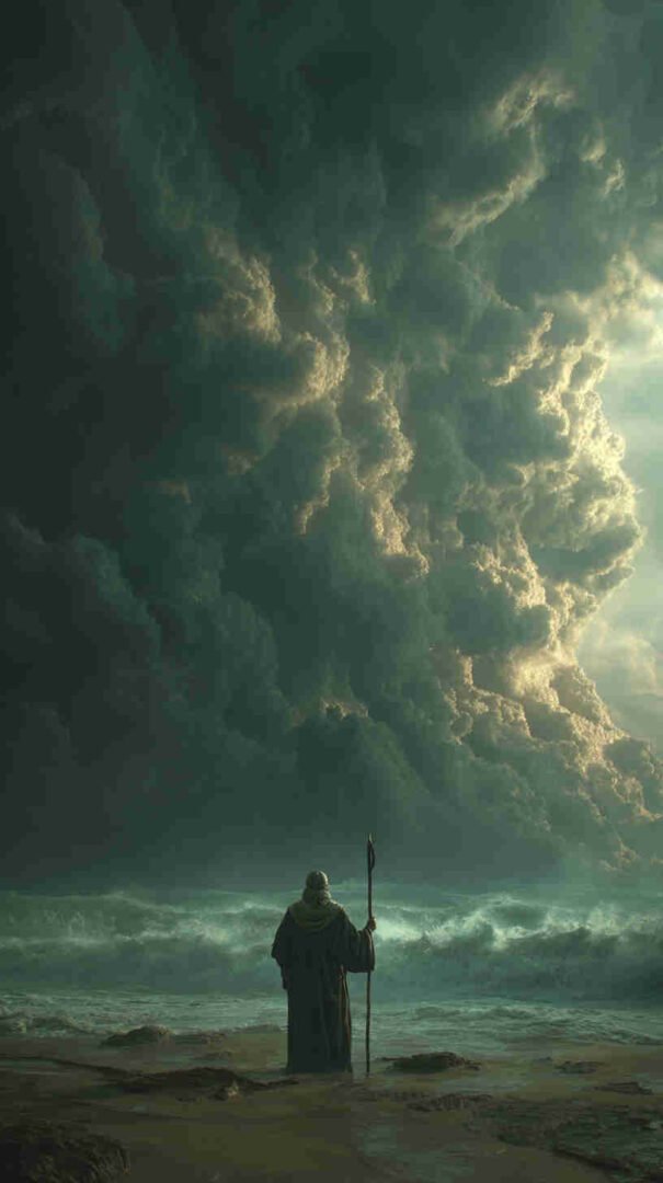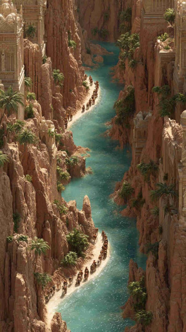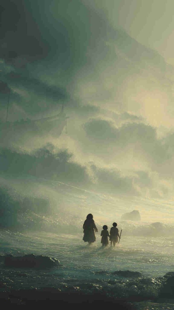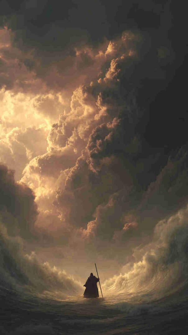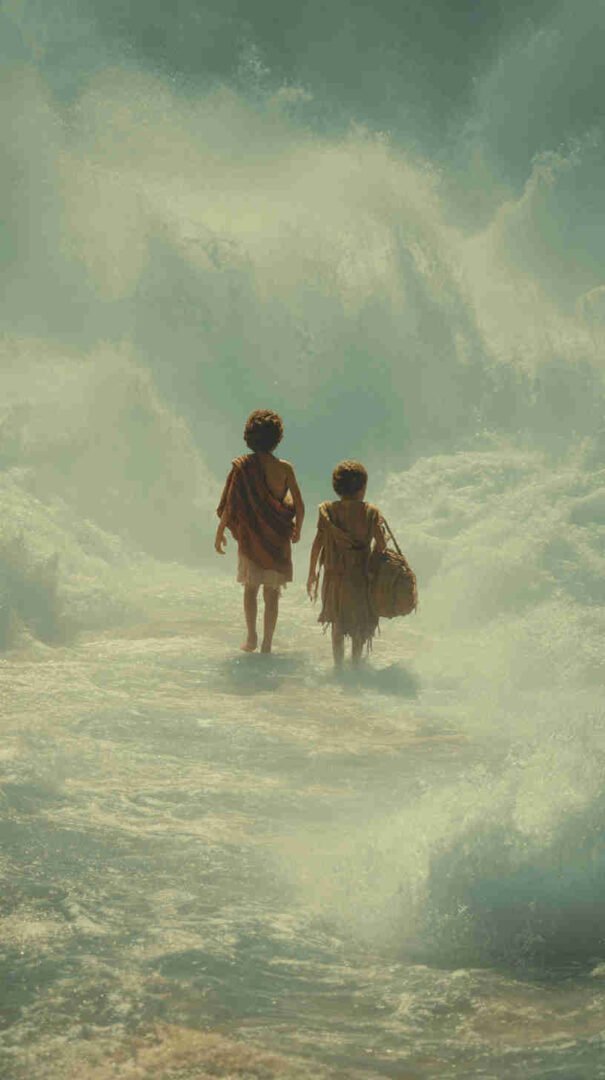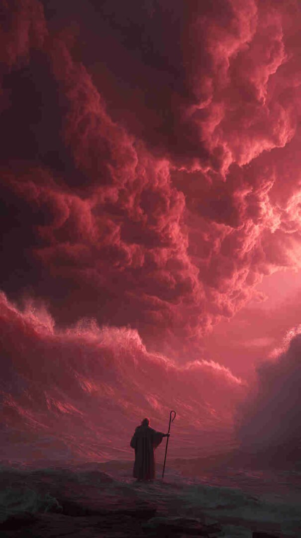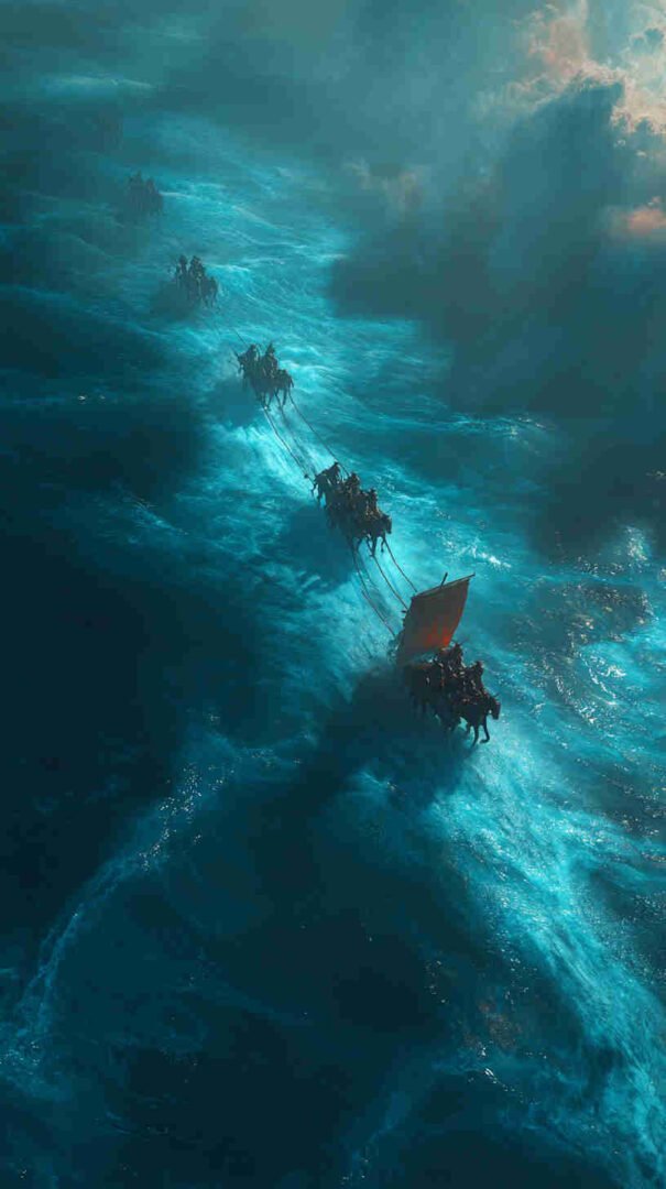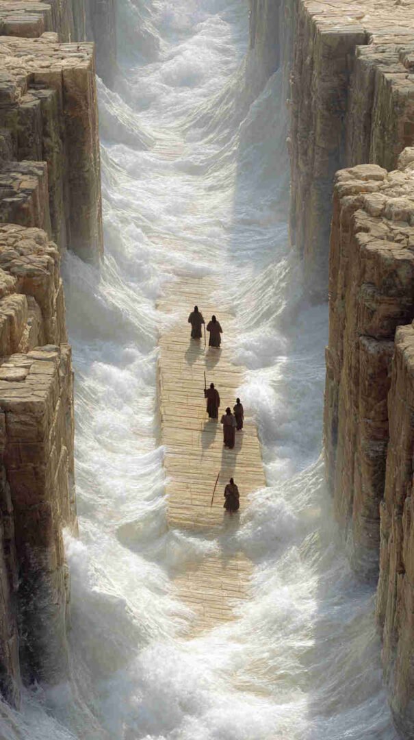 Interpretations vary: Epic realism with roaring waves and resolute refugees, symbolic minimalism focusing on the path of faith, or cinematic spectacles echoing Cecil B. DeMille’s The Ten Commandments (1956) in hyper-high def.