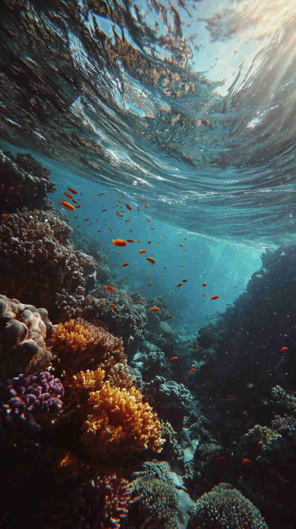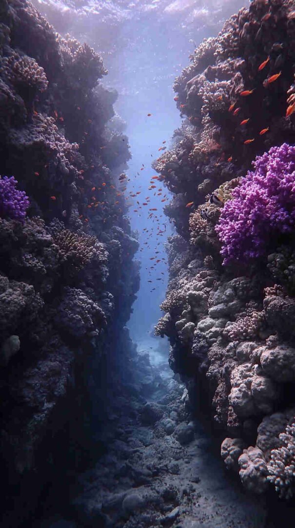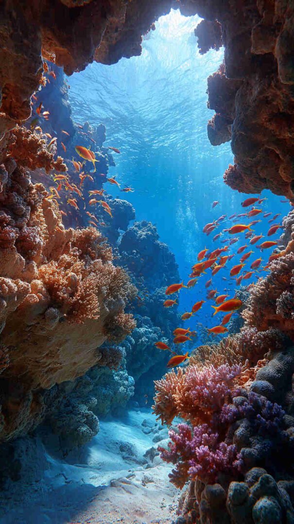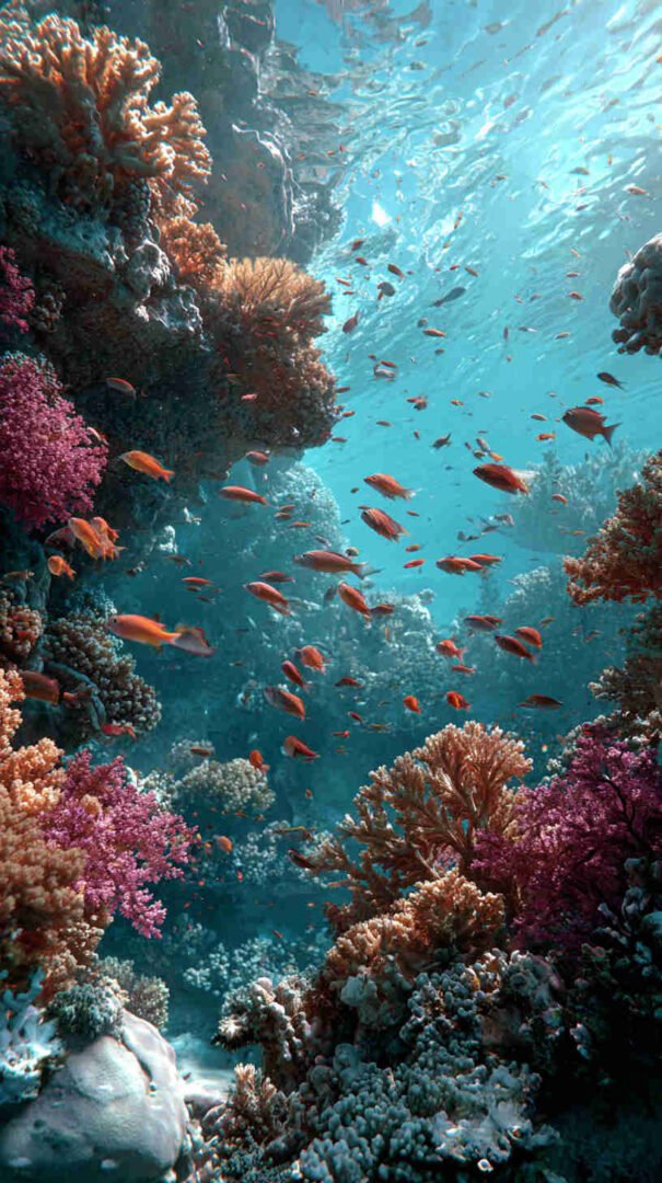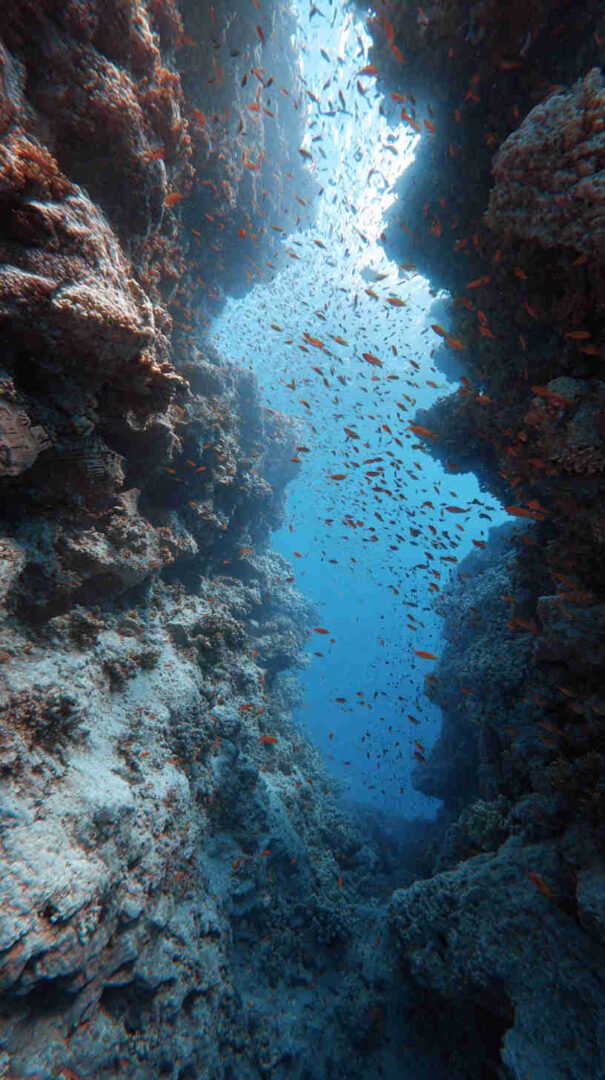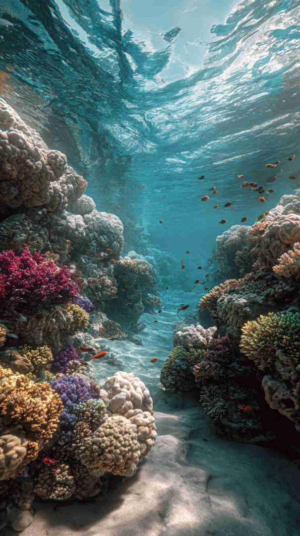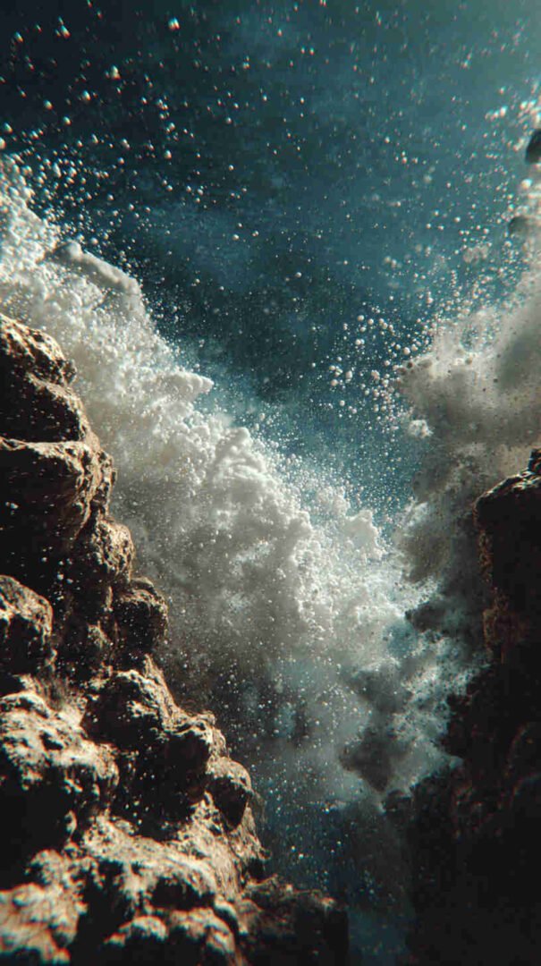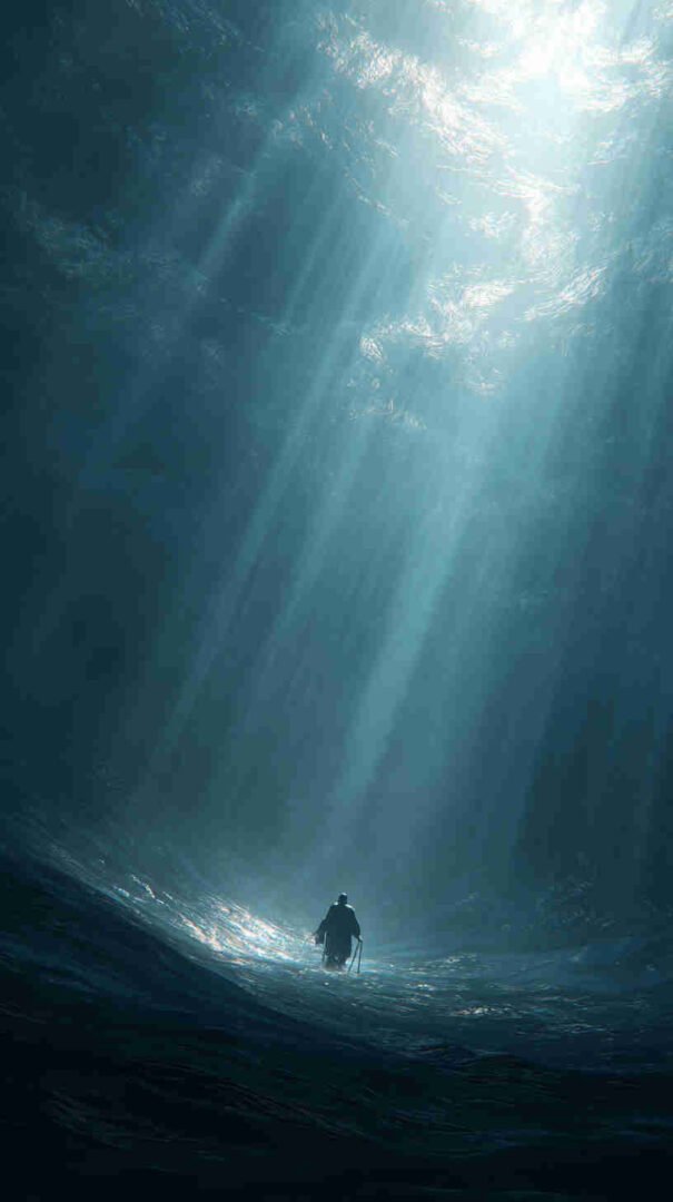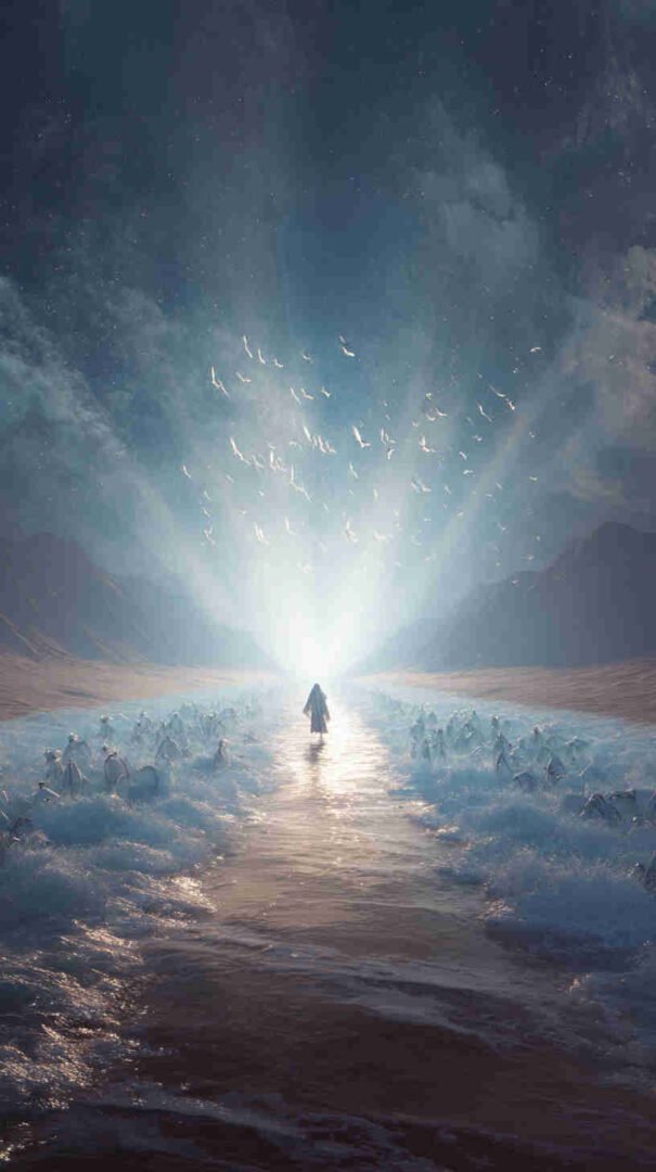 Envision your digital dawn unfolding a divine drama: A hyper-detailed depiction of the sea’s supernatural split, translucent turquoise towers teeming with trapped fish, the faithful flock forging forward on firm seabed under heavenly haze, every droplet and divine ray rendered in resolute realism.