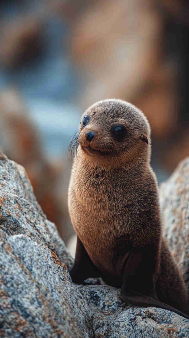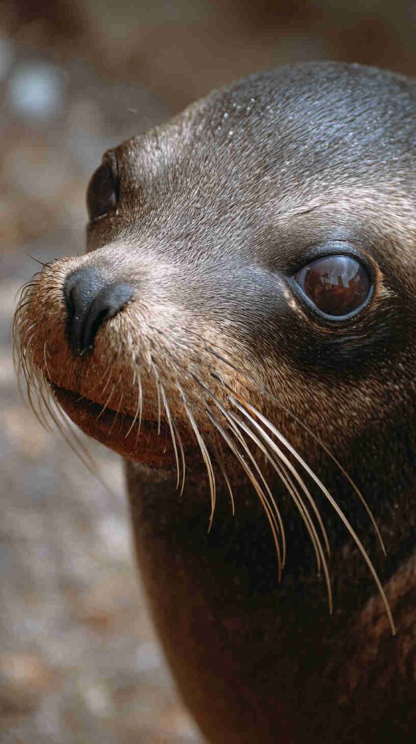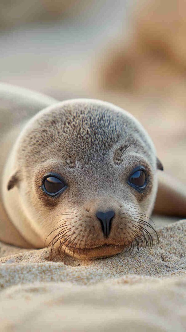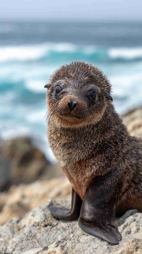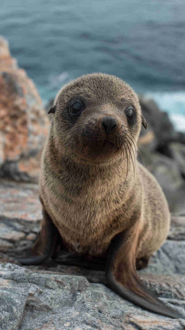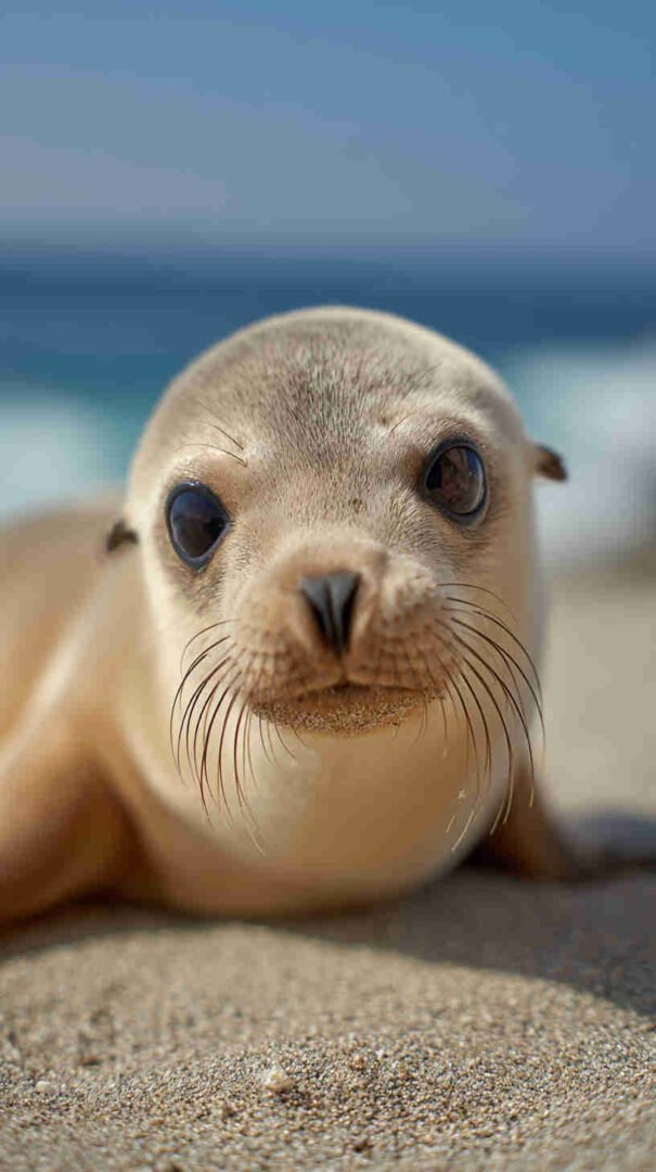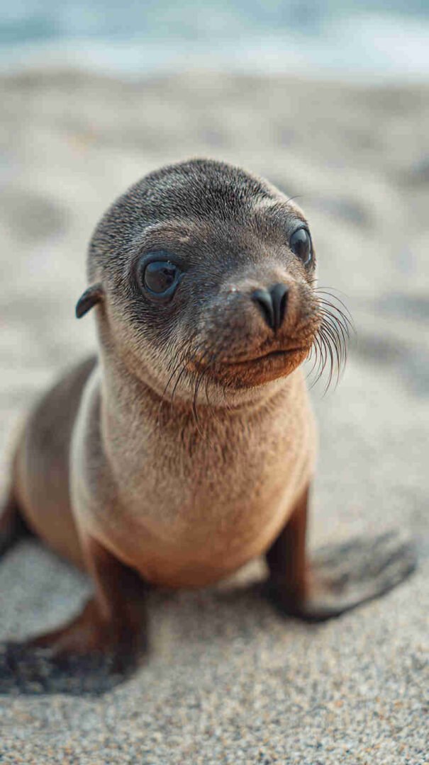 Picture your screen surfacing a sea lion spectacle: A hyper-adorable pup perched on pebbles, big brown eyes beaming curiosity, floppy fins flopped in carefree repose, all against a backdrop of sparkling surf in stunning sharpness.