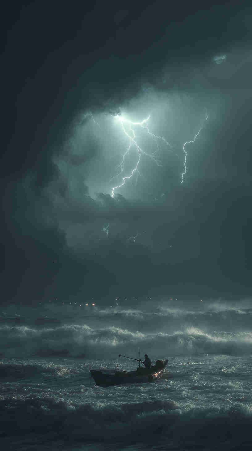 Envision your digital domain descending into dusk: A hyper-dramatic depiction of a lone sailing ship battling billowing black clouds, lightning illuminating its tattered sails in fleeting flashes, waves crashing in chaotic crescendos against a foreboding foreground.