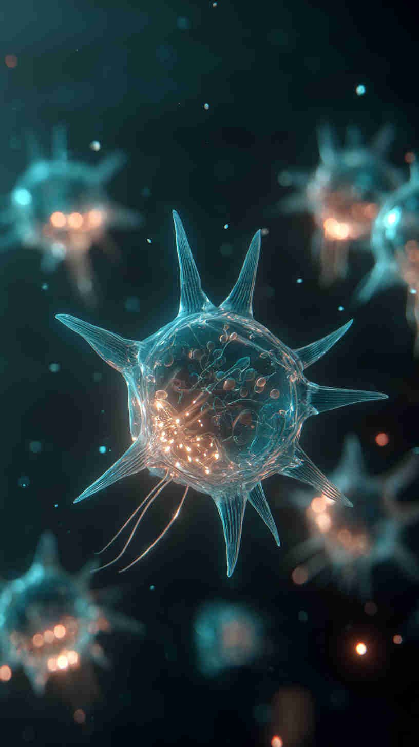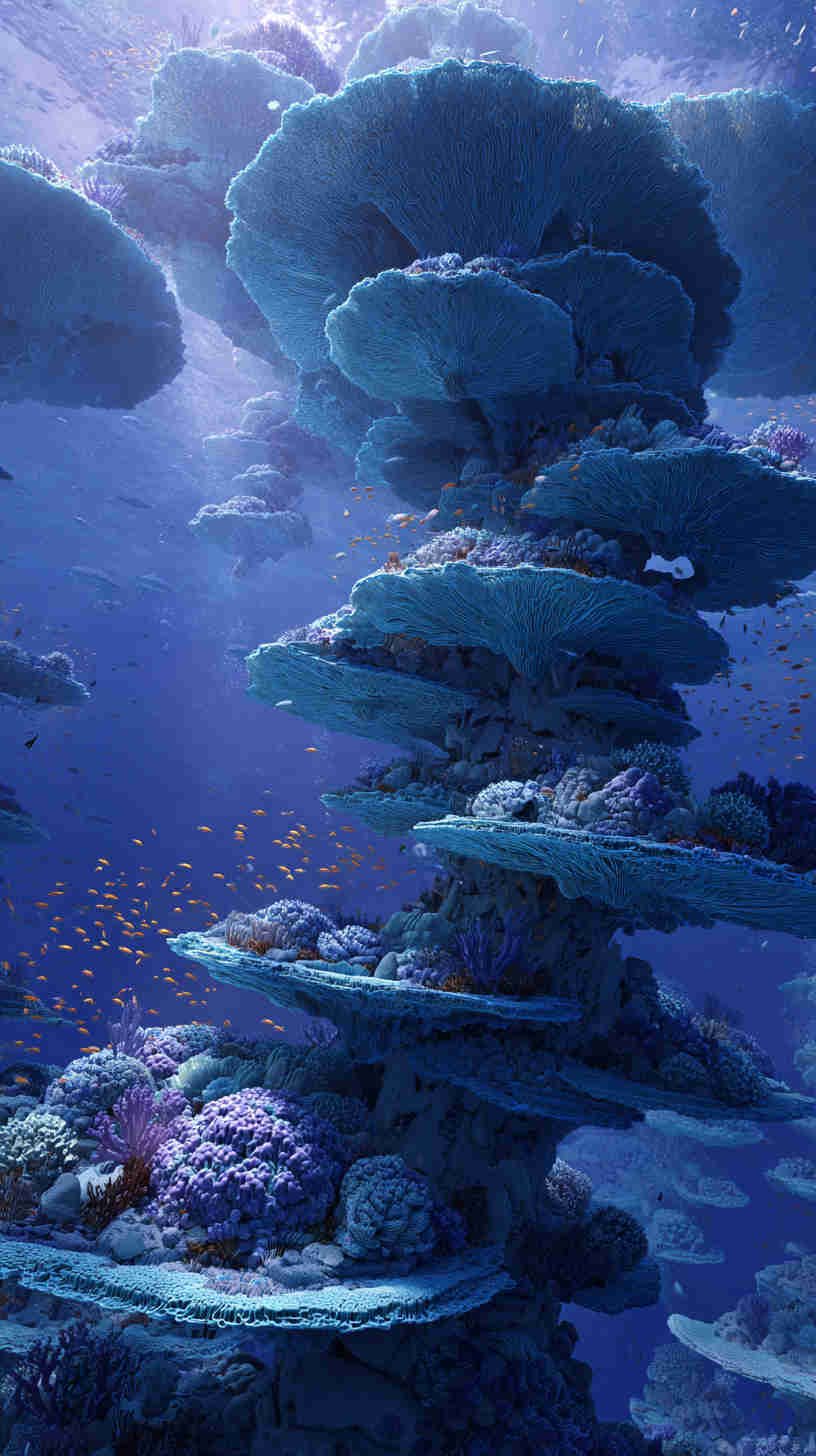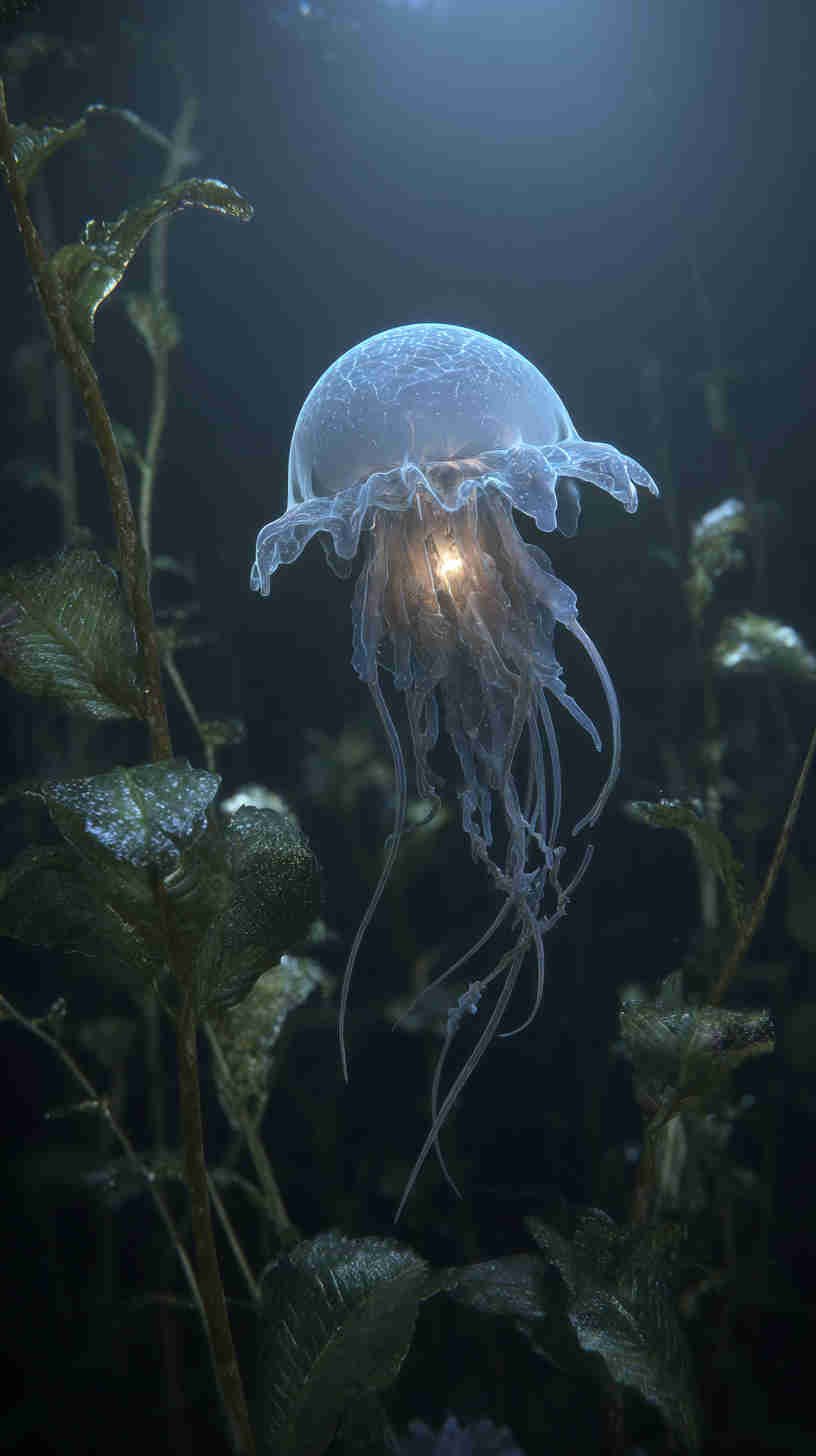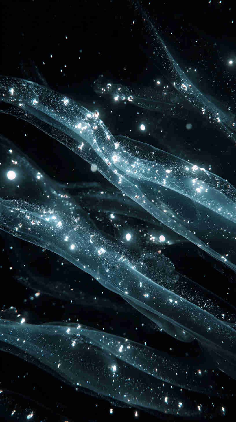 - A giant siphonophore colony stretching vertically like a living chandelier – thousands of glowing feeding polyps and stinging tentacles creating a translucent curtain of light in the bathypelagic zone.