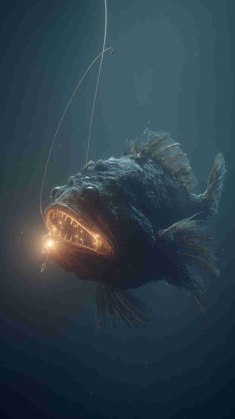 - The female black seadevil anglerfish with her luminous chin barbel and dagger-like teeth – rendered against absolute black with only her own light source, a study in predatory elegance and isolation.