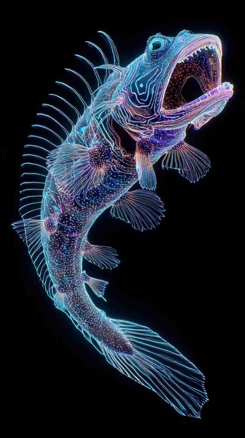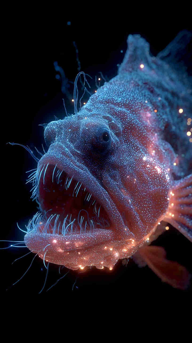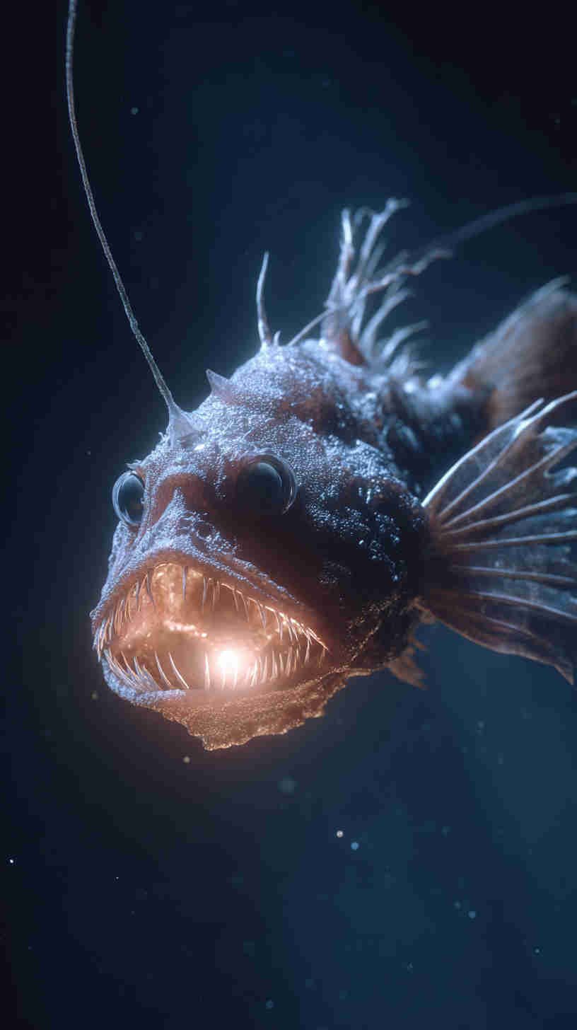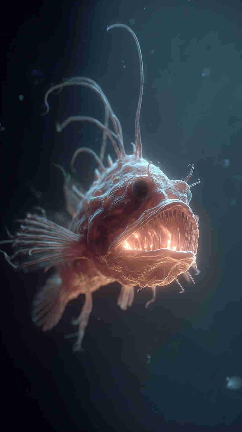 Envision your digital domain descending into depths: A hyper-detailed anglerfish, its bioluminescent lure glowing eerily in pitch-black waters, fangs bared in eternal hunger against an endless expanse of darkness.