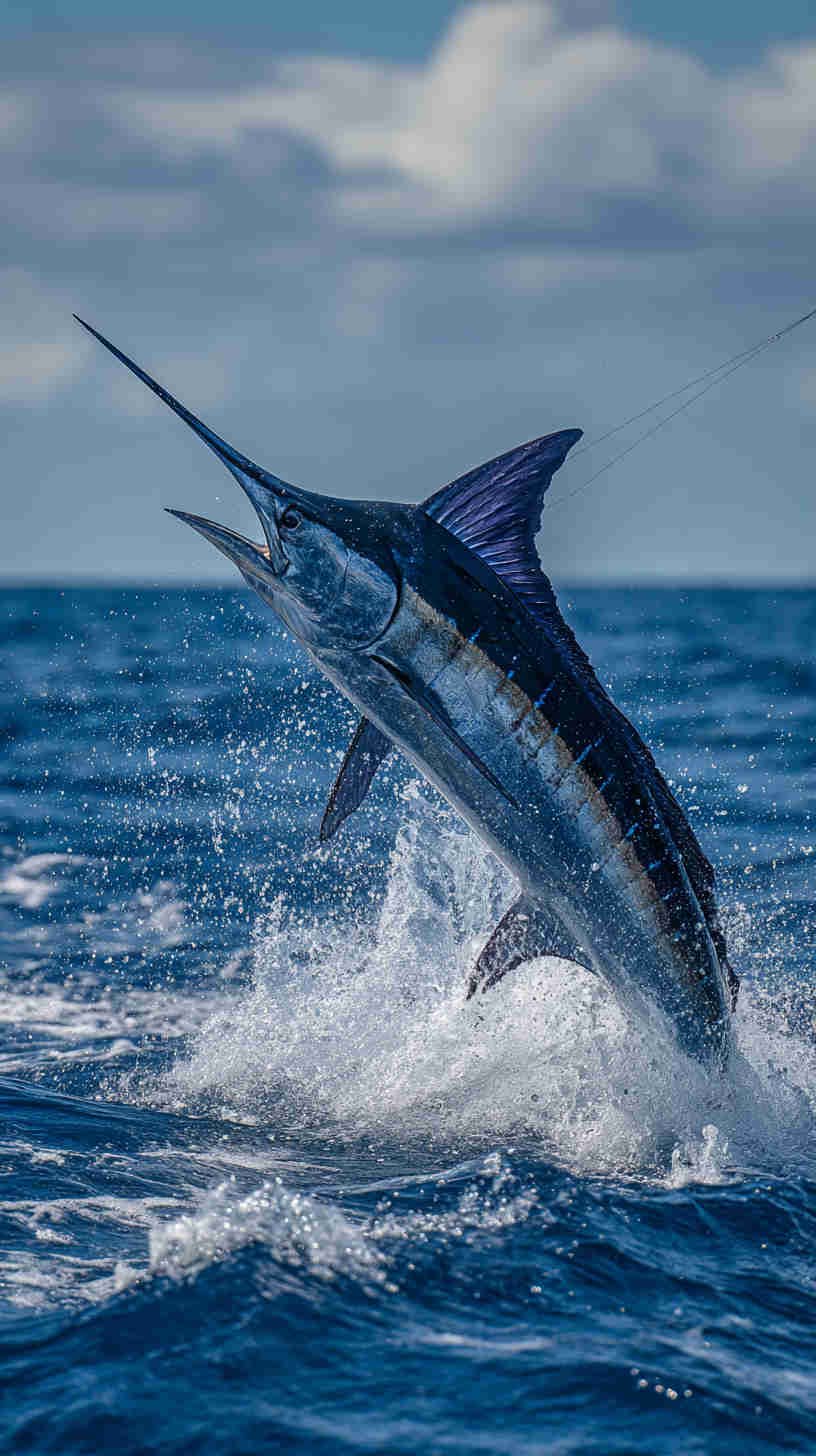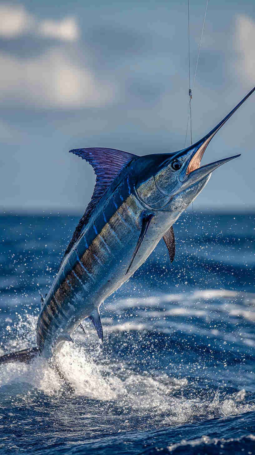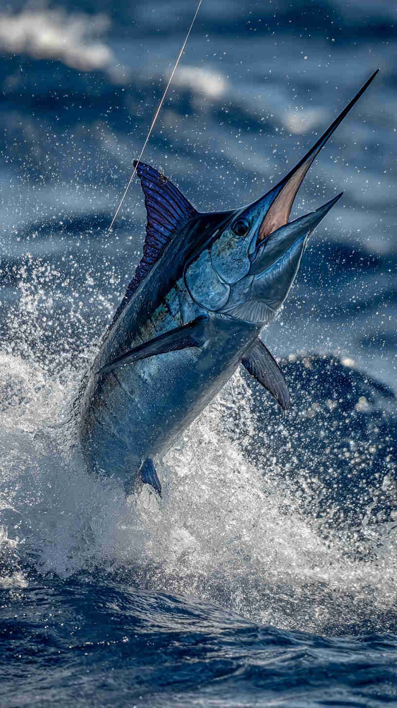 - Iconic blue marlin greyhounding frozen mid-jump – massive fish clearing the surface multiple times, leader tight, angler in the fighting harness, water droplets suspended in air for maximum impact.