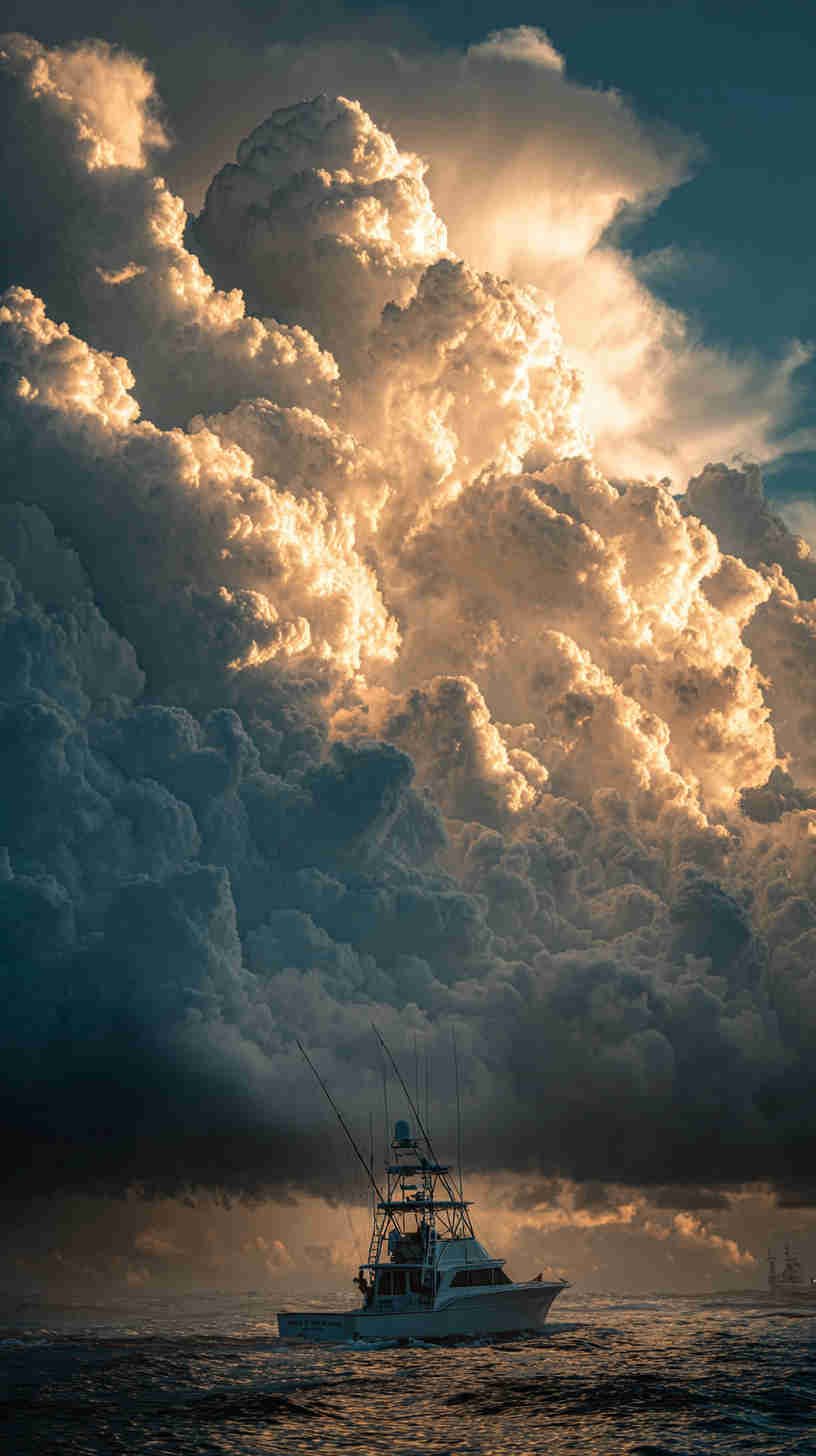 - Lighting is cinematic and purposeful: golden-hour rim lighting on fighting chairs and rod tips, dramatic side-lighting during blue-water runs, moody overcast skies that make white hulls and chrome pop against gunmetal seas.