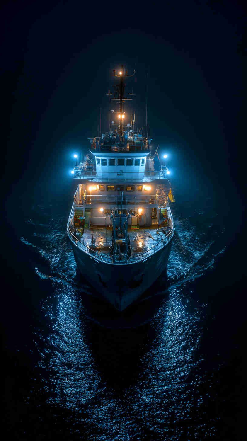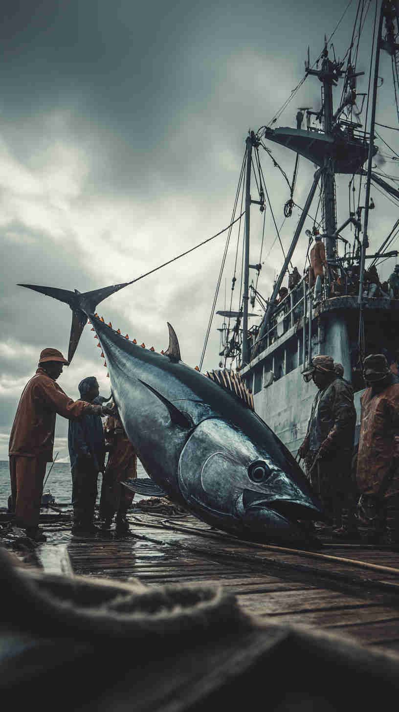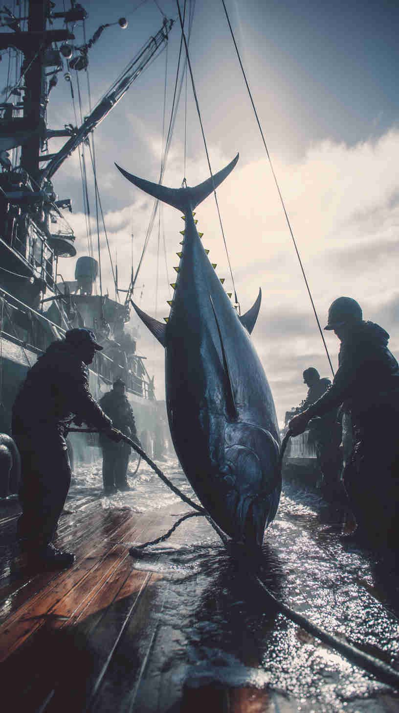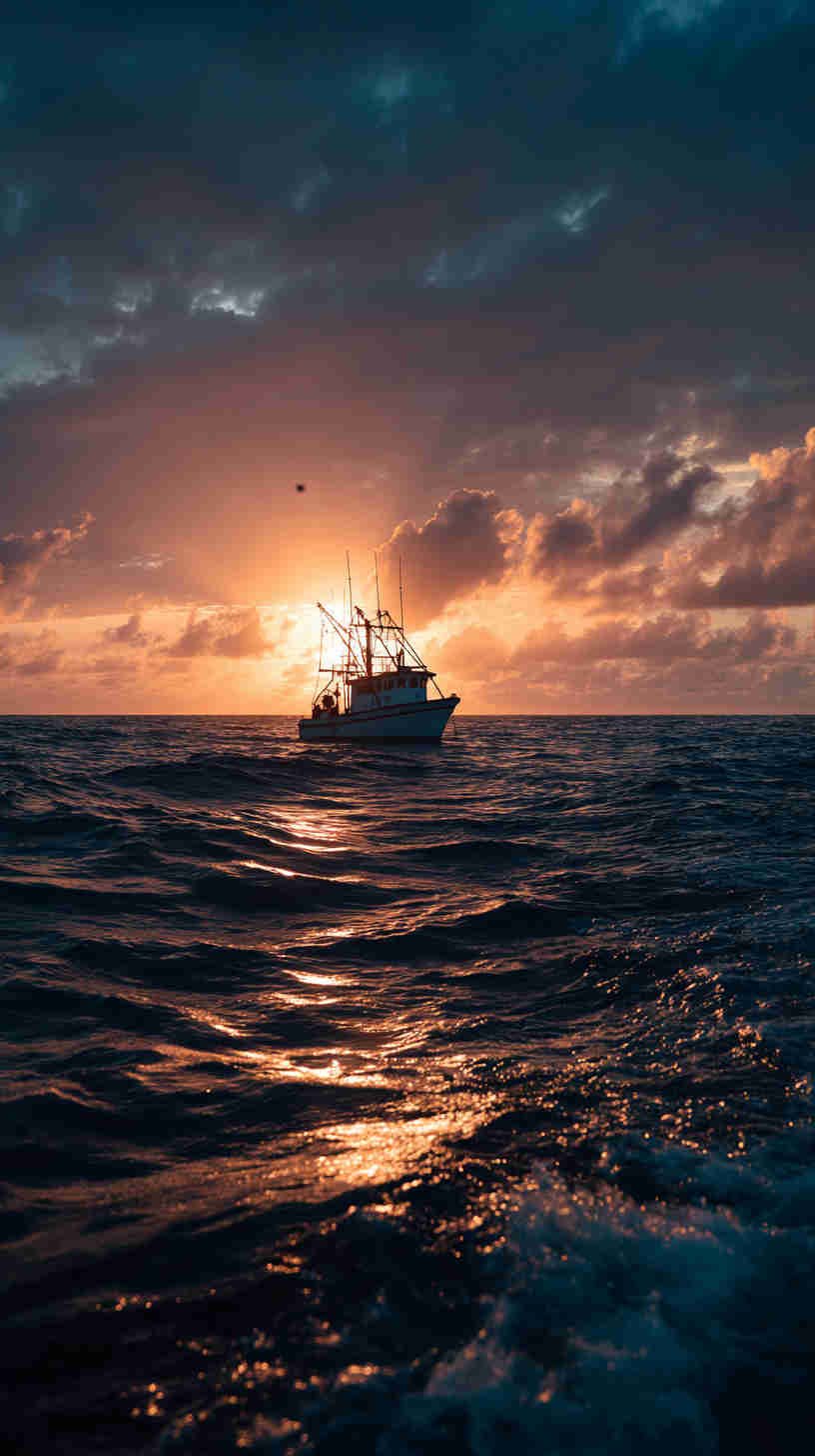 - Dramatic long-range tuna boat disappearing into a fiery sunset – low camera angle emphasizing the towering house and sweeping bow, evoking endless horizons and multi-day adventures.