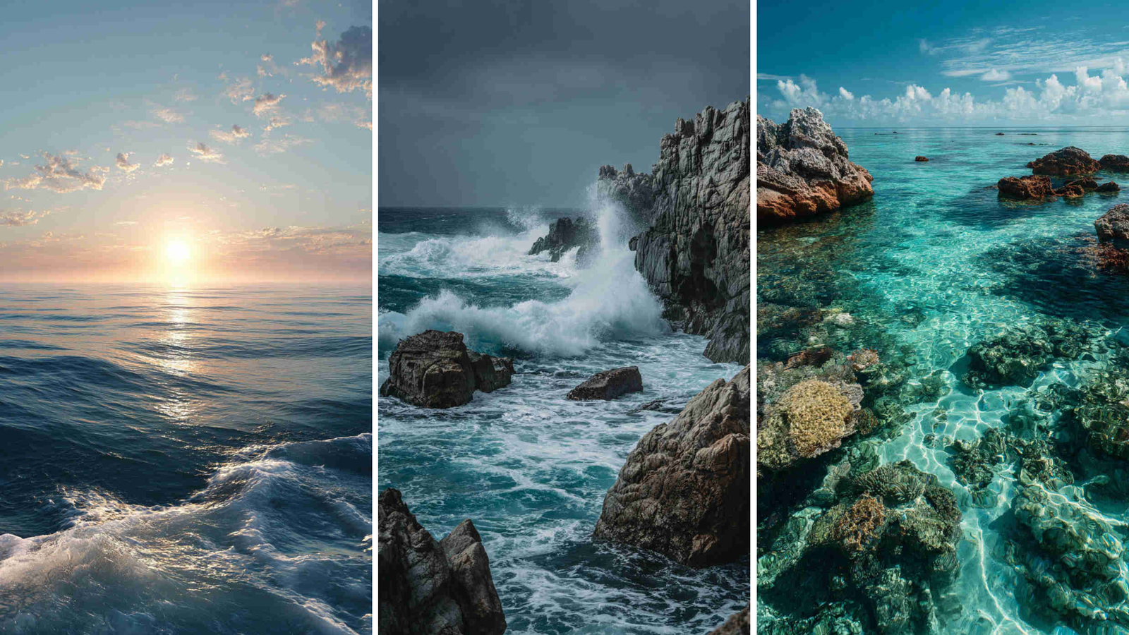 - Color Authenticity — Accurate white balance and subtle gradients: the cool cyan of tropical shallows, the deep steel-blue of open ocean, the milky turquoise of glacial silt water, the soft lavender-gray of overcast days.