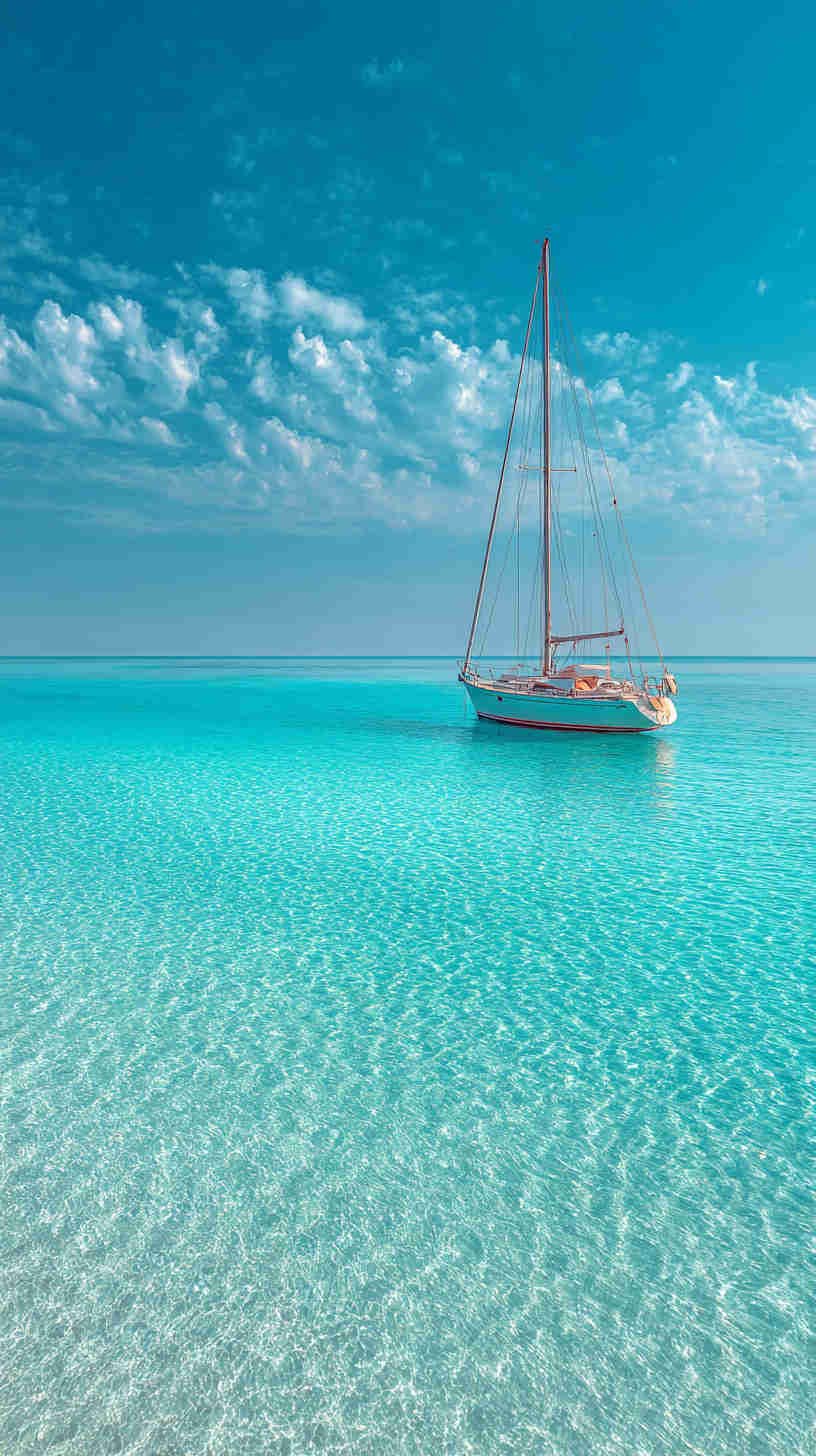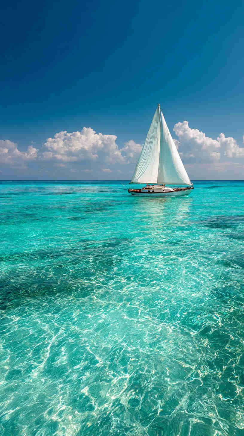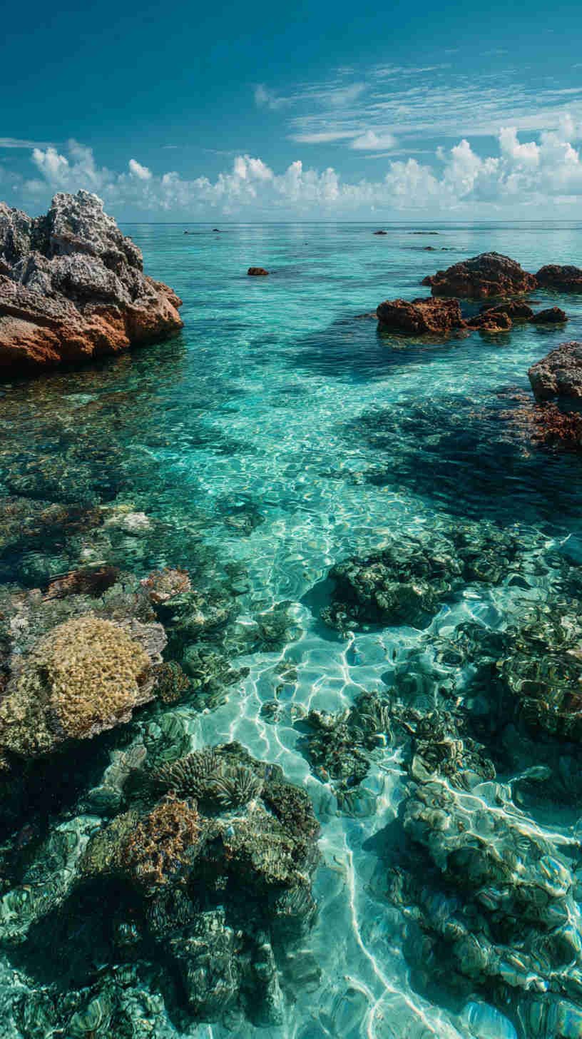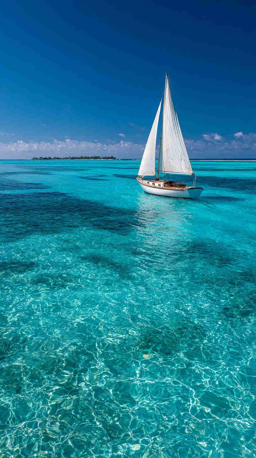 - Turquoise shallows at midday — Crystal-clear water over white sand, faint patterns of light dancing on the seabed, distant reef edge fading into deeper blue.