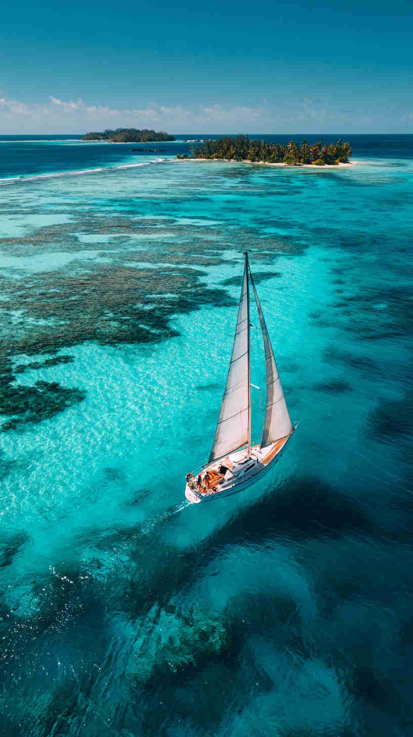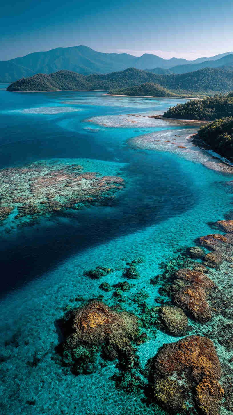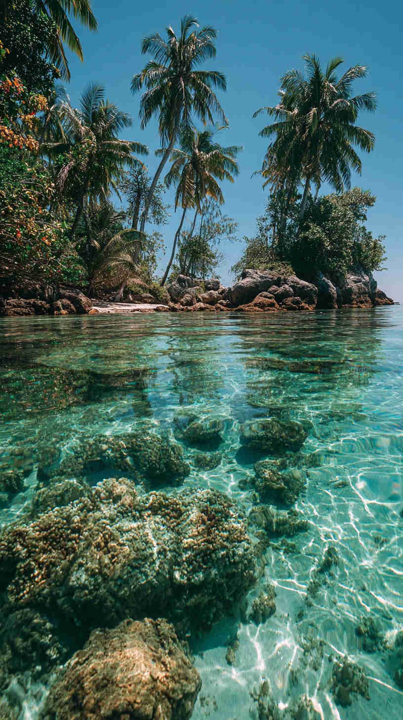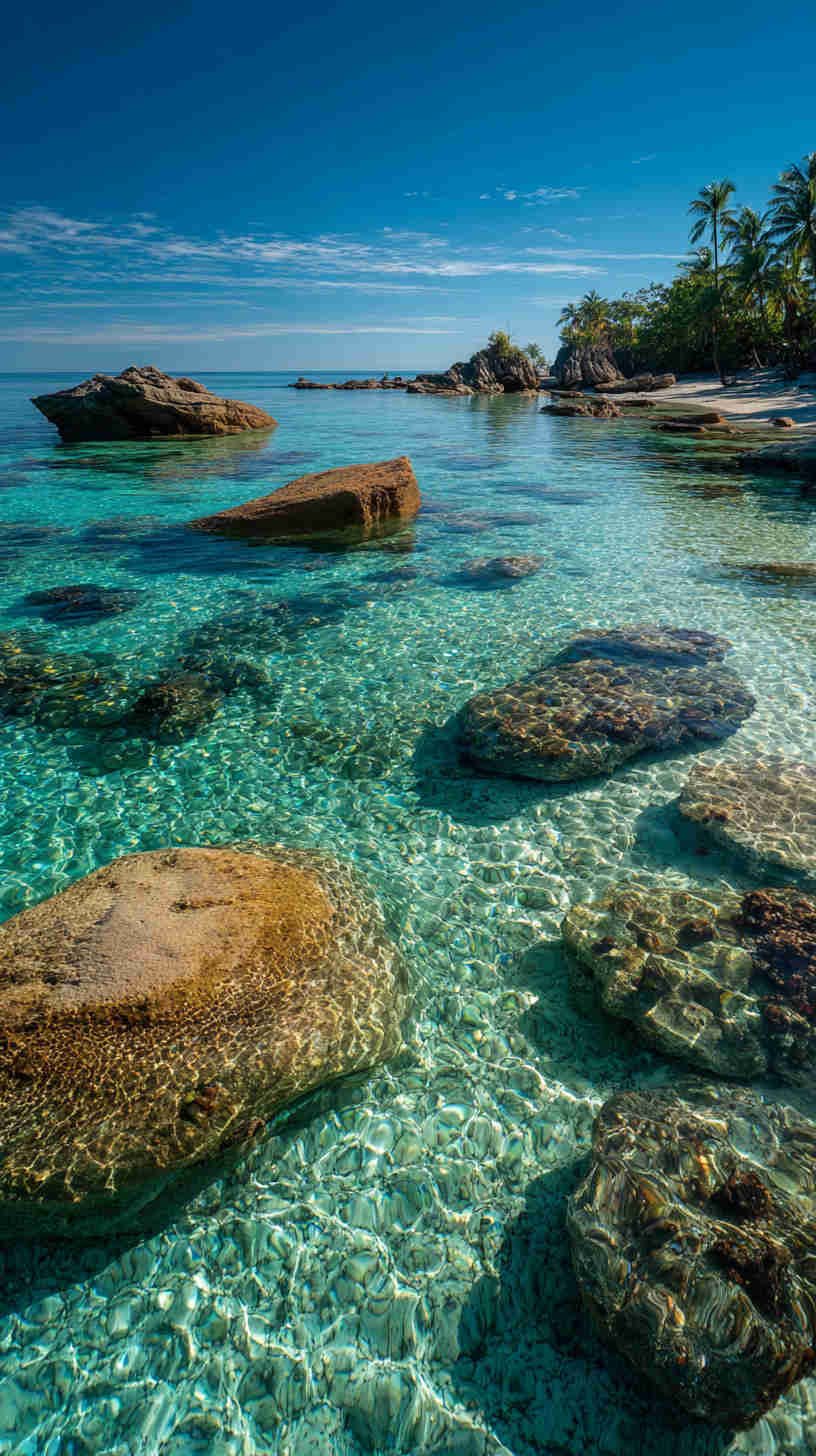- Turquoise shallows at midday — Crystal-clear water over white sand, faint patterns of light dancing on the seabed, distant reef edge fading into deeper blue.