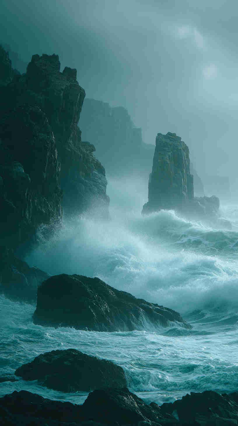 - Misty coastal calm — Low morning fog softening distant headlands, glassy surface reflecting muted greens and grays of nearby forest, quiet and introspective.