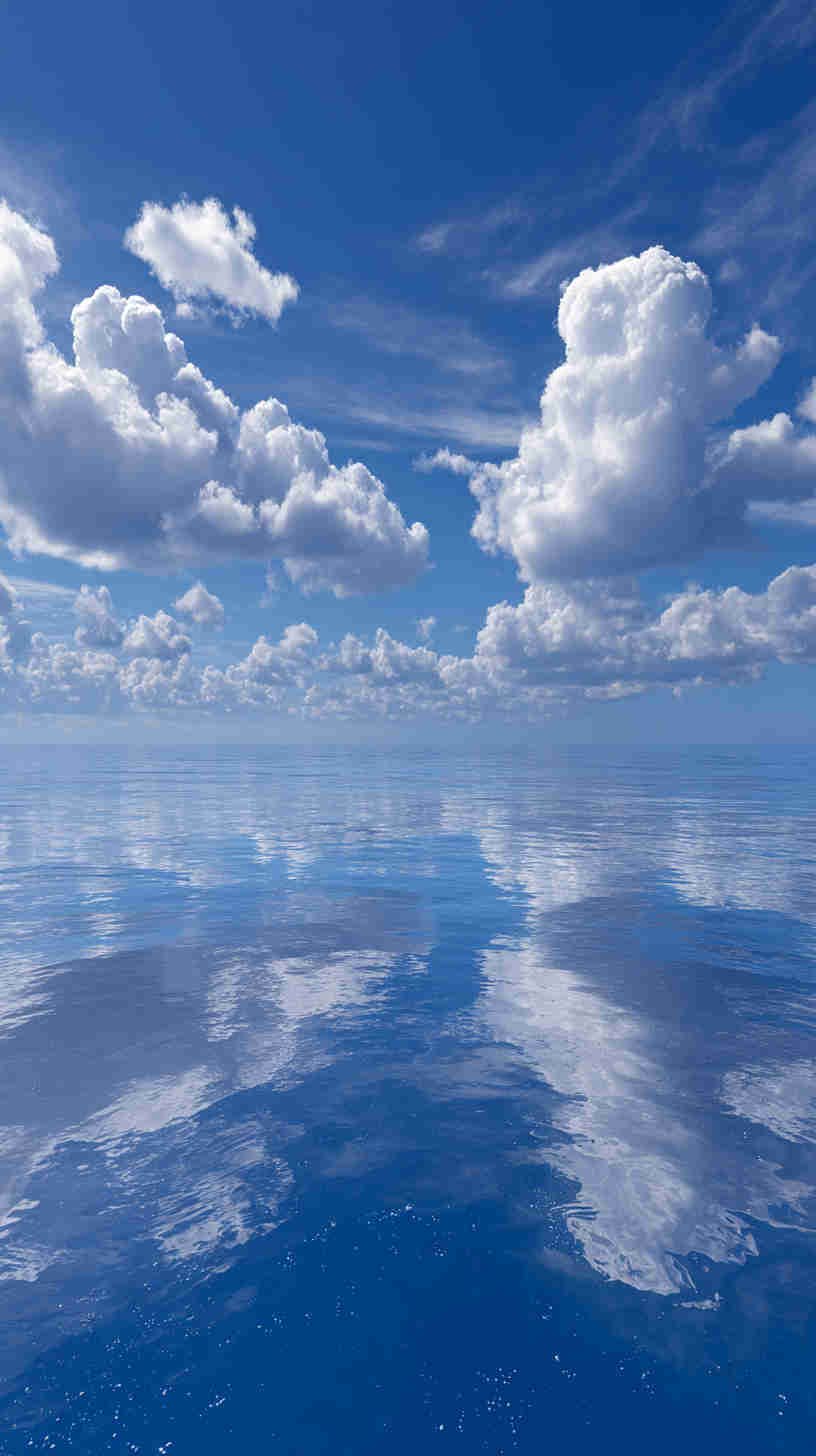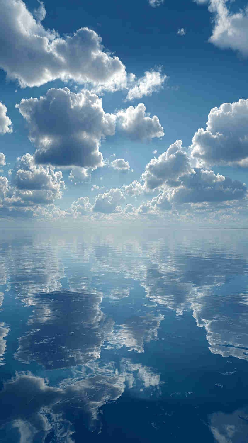 - Overcast steel-blue infinity — Soft gray clouds reflected in mirror-like water, subtle tonal shifts from near-black to pale silver, ultimate minimalist calm.