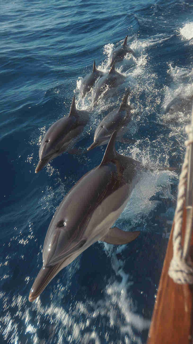 - Super-pod bow-riding — dozens of dolphins surfing the pressure wave of a moving boat, multiple mid-air jumps in one frame, dynamic motion blur on fins and bodies, turquoise water glowing beneath.