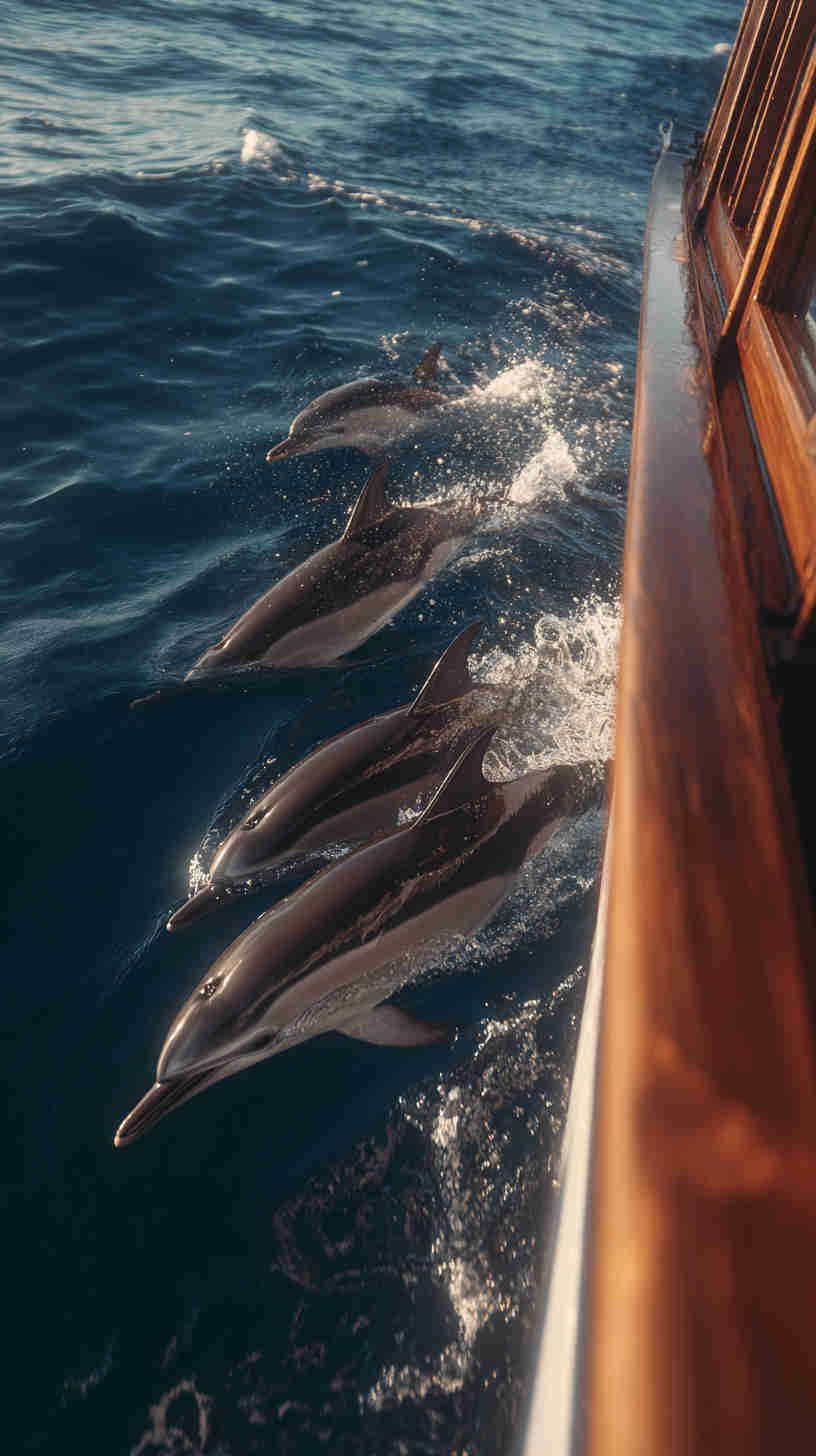 - Golden-hour surface run — small pod cruising in formation at sunset, warm side-lighting turning gray backs into molten gold, long gentle wakes trailing behind, peaceful yet powerful.