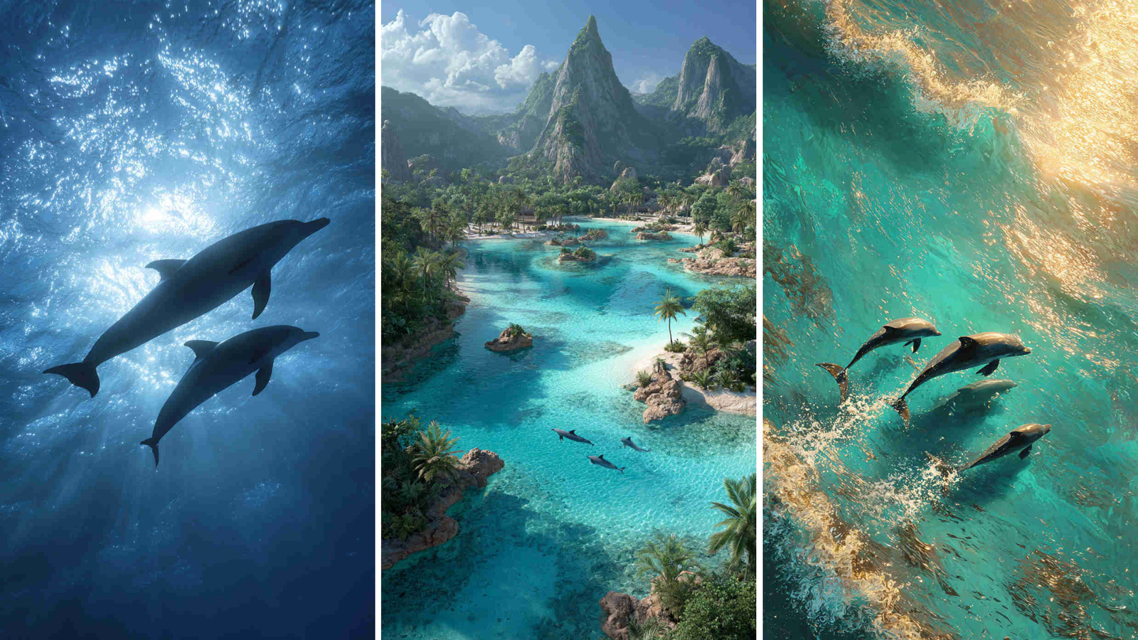 - Natural & cinematic lighting — soft underwater blue-hour glow, golden surface light during leaps, dramatic side-lighting that turns wet skin into liquid silver, sunset rim lighting creating glowing outlines against deep water.