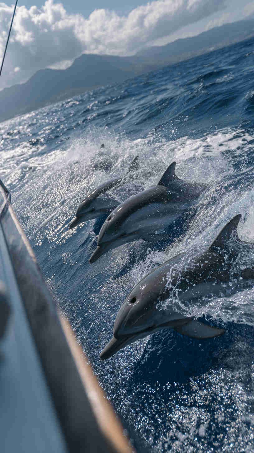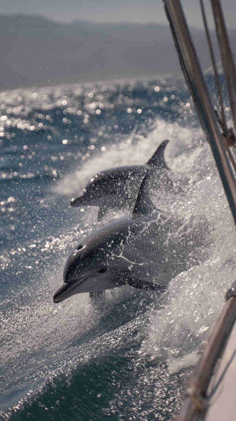 - golden-hour surface runs where dolphins surf the pressure wave of a boat