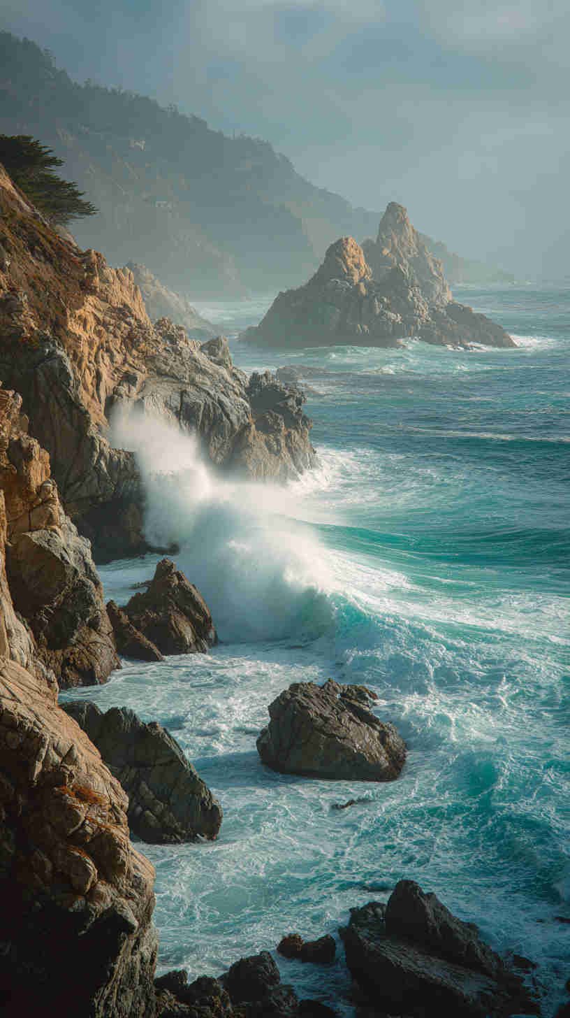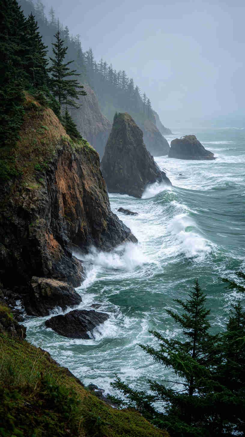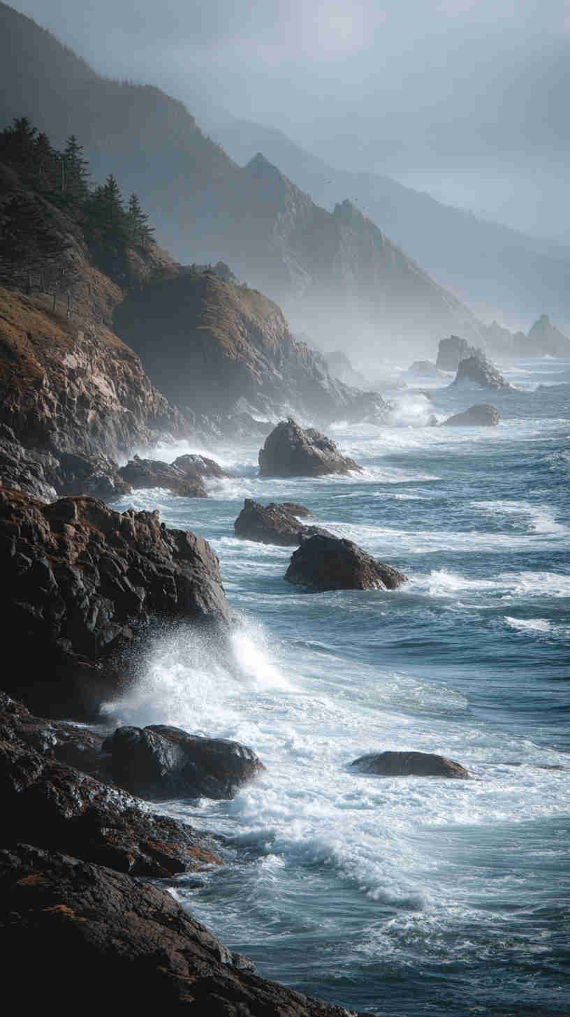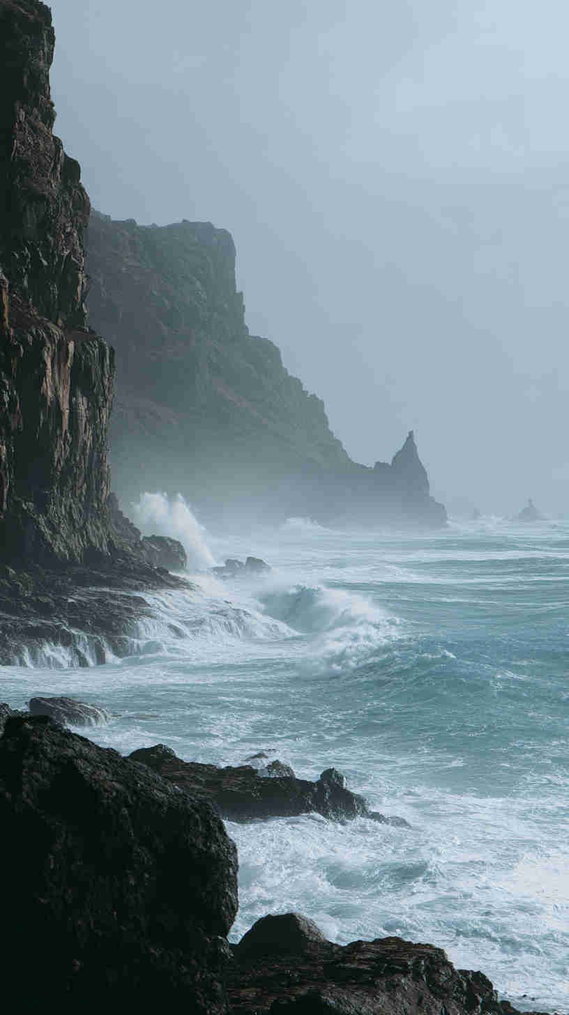 - Moody coastal drama — misty headlands, soft rain on still water, distant fog banks dissolving into sky.