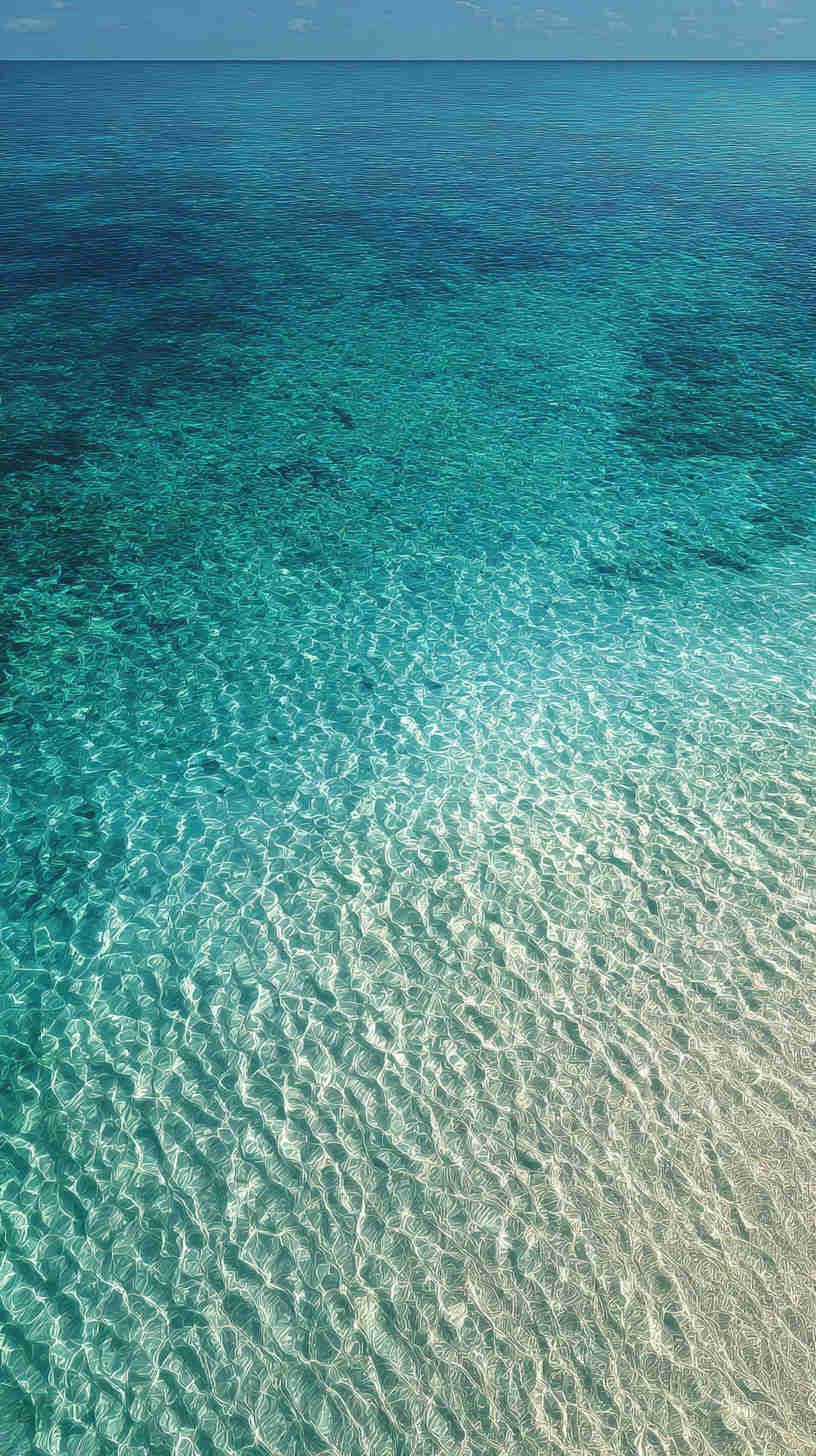 - Turquoise shallows at midday — Crystal-clear water over white sand, faint patterns of light dancing on the seabed, distant reef edge fading into deeper blue.