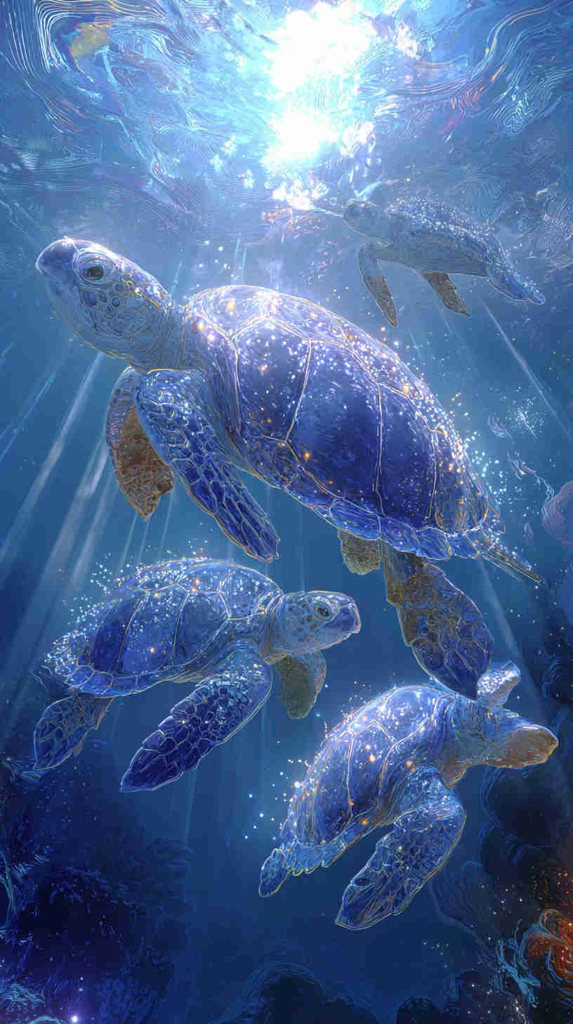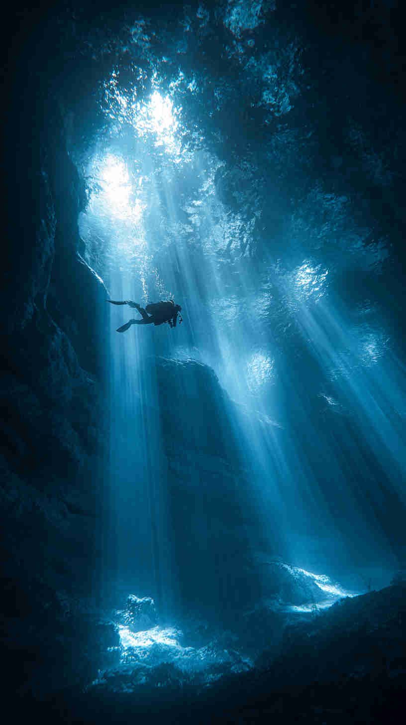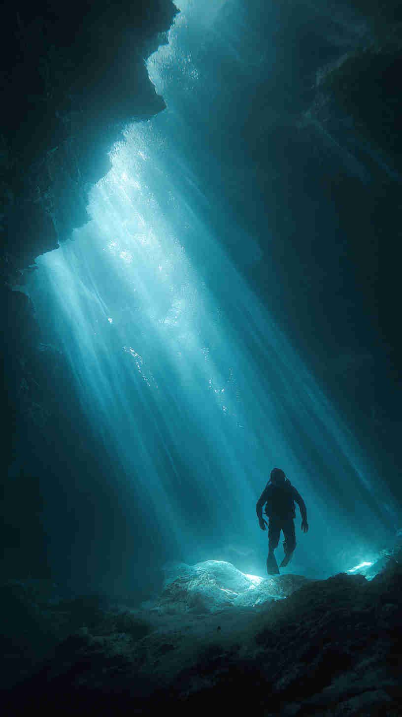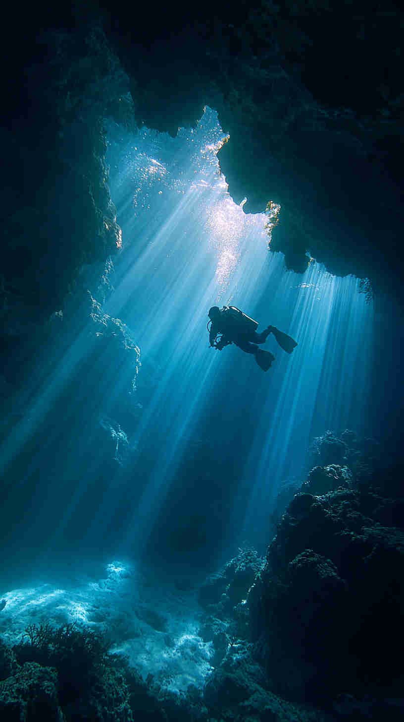 - Natural & cinematic lighting — realistic volumetric god-rays, subtle caustics dancing on sandy bottoms, soft blue-hour diffusion, occasional warm surface glow bleeding down into cooler depths.