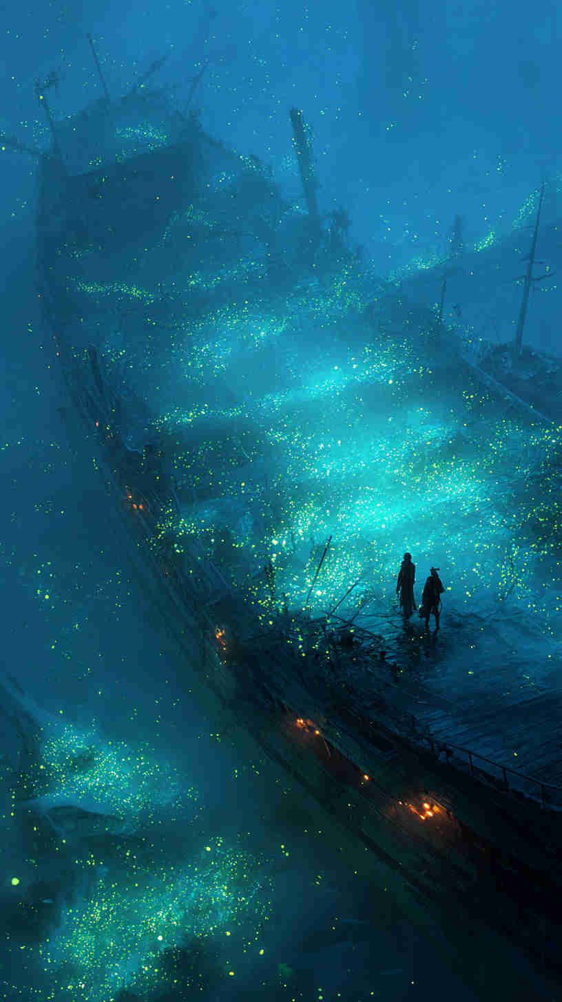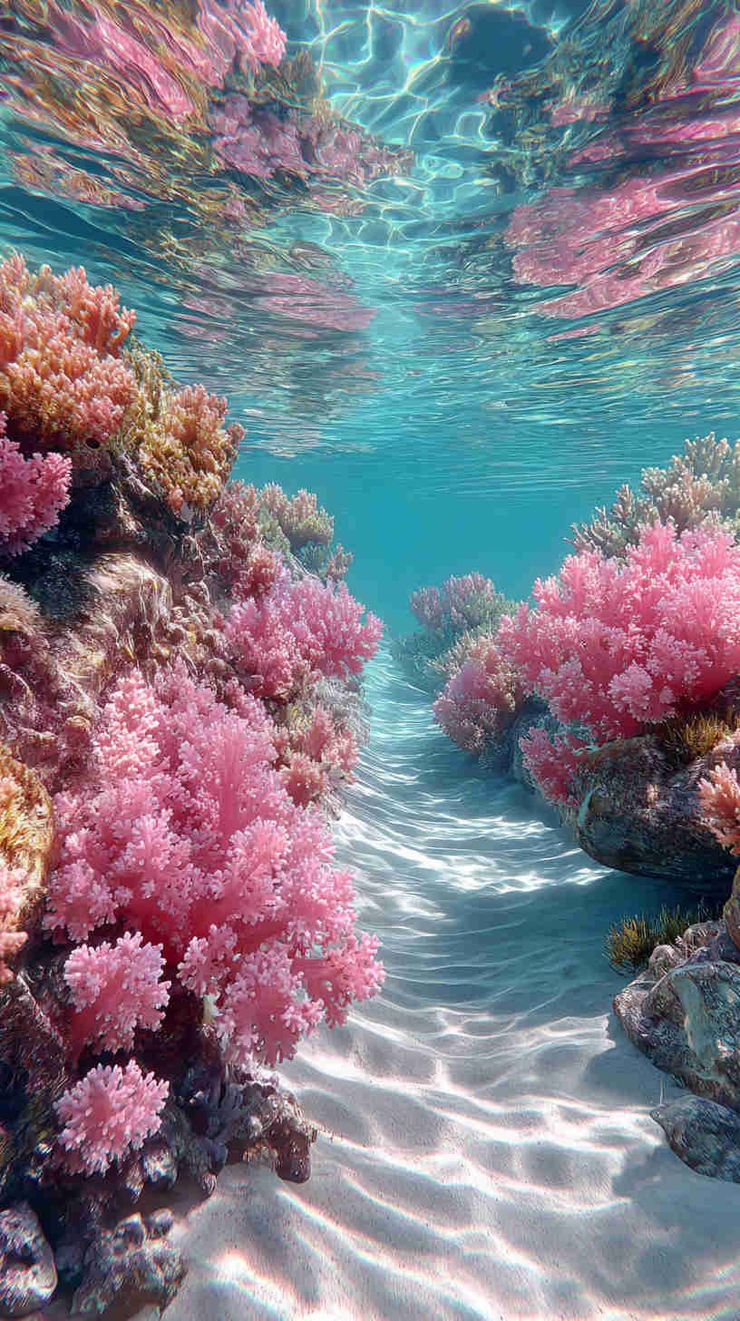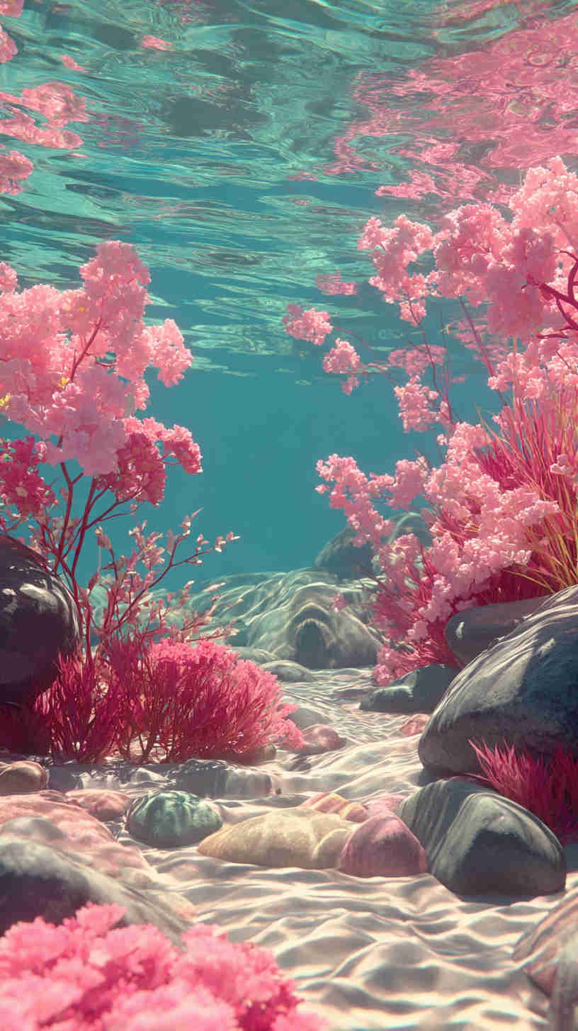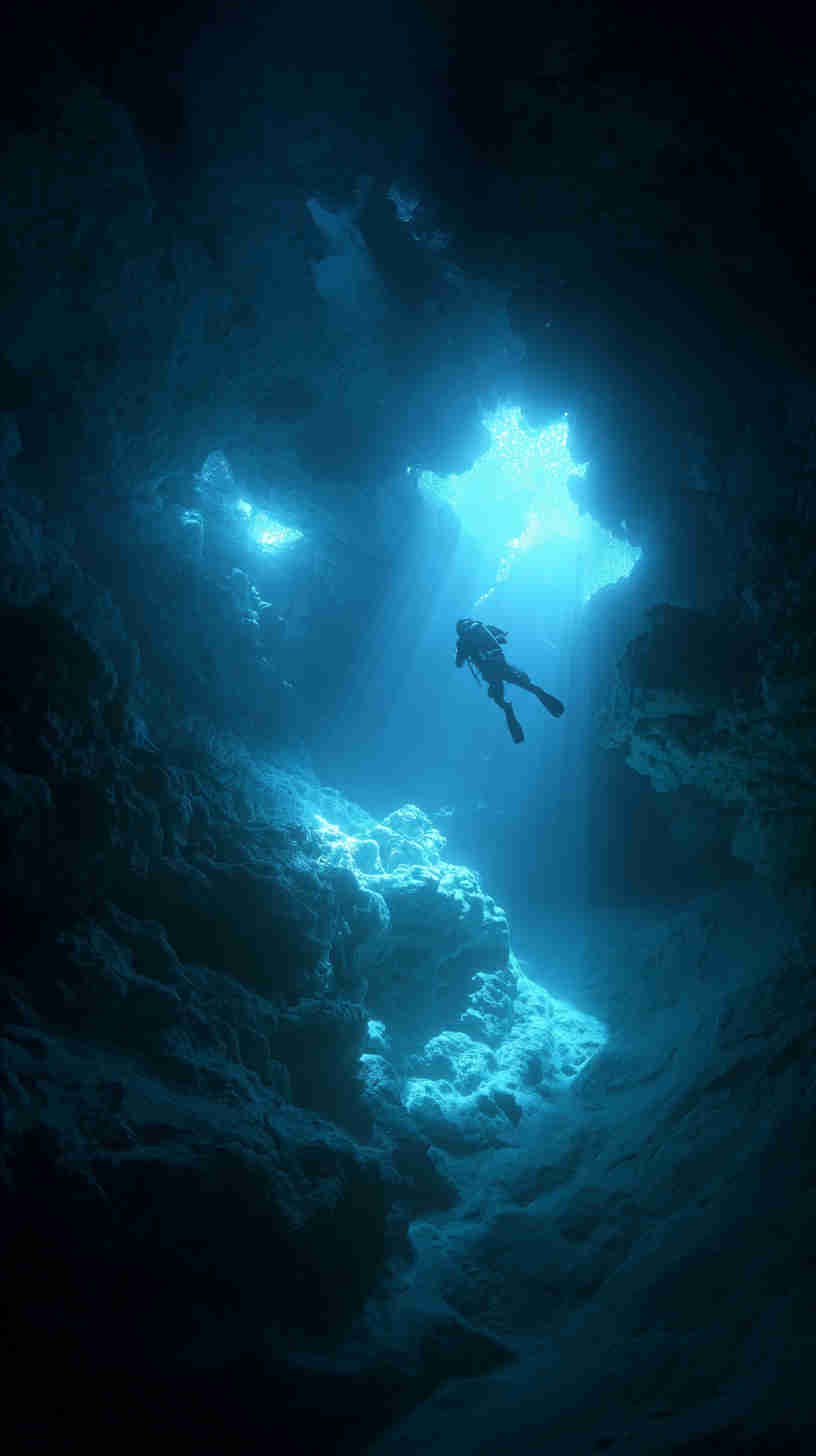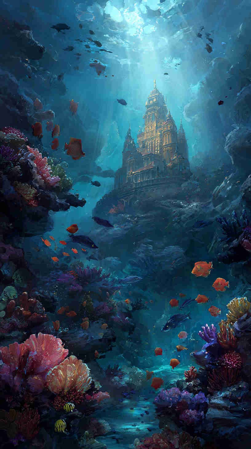 - Natural & cinematic lighting — realistic volumetric god-rays, subtle caustics dancing on sandy bottoms, soft blue-hour diffusion, occasional warm surface glow bleeding down into cooler depths.
