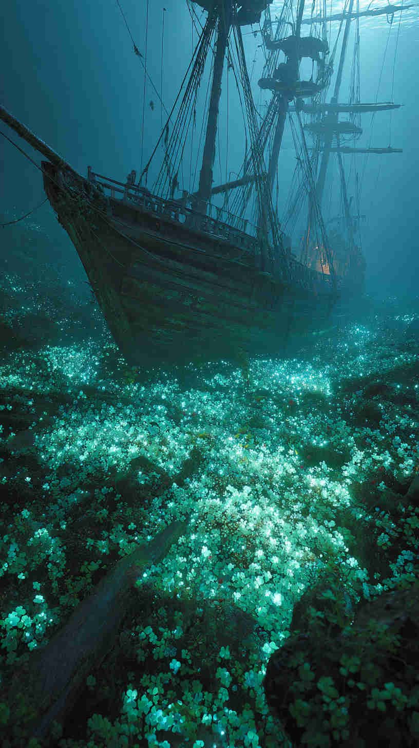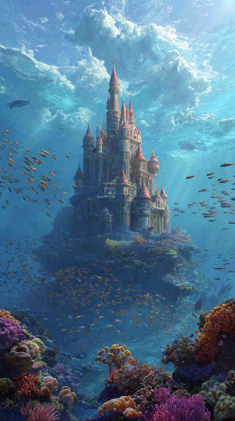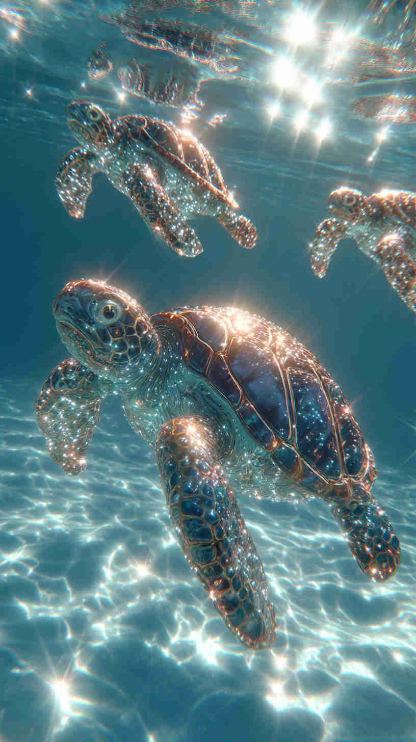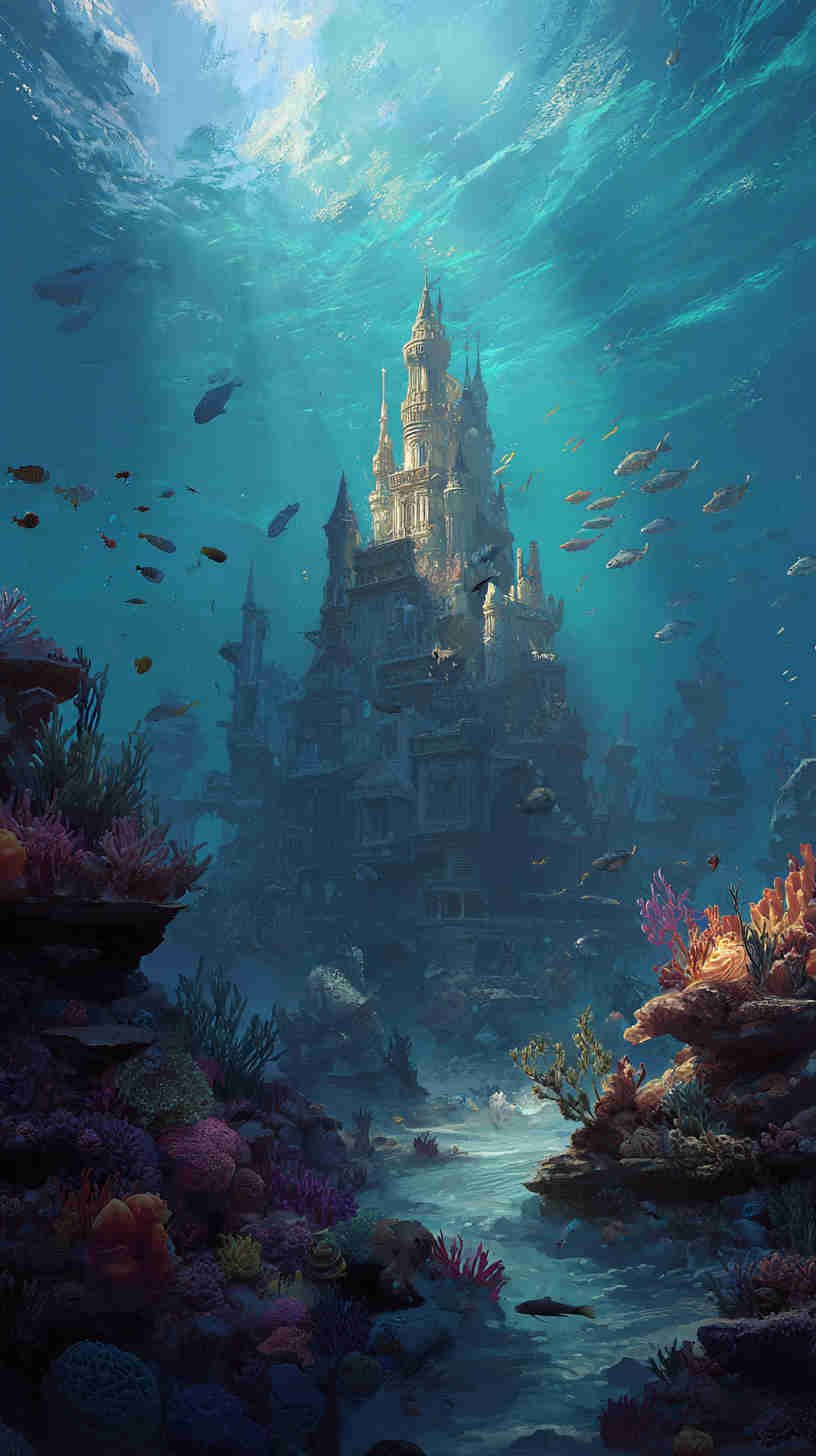 - Natural & cinematic lighting — realistic volumetric god-rays, subtle caustics dancing on sandy bottoms, soft blue-hour diffusion, occasional warm surface glow bleeding down into cooler depths.
