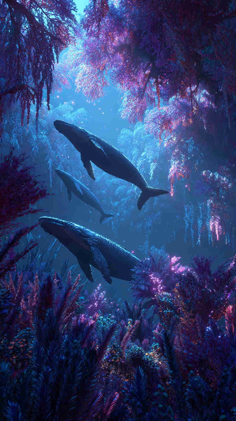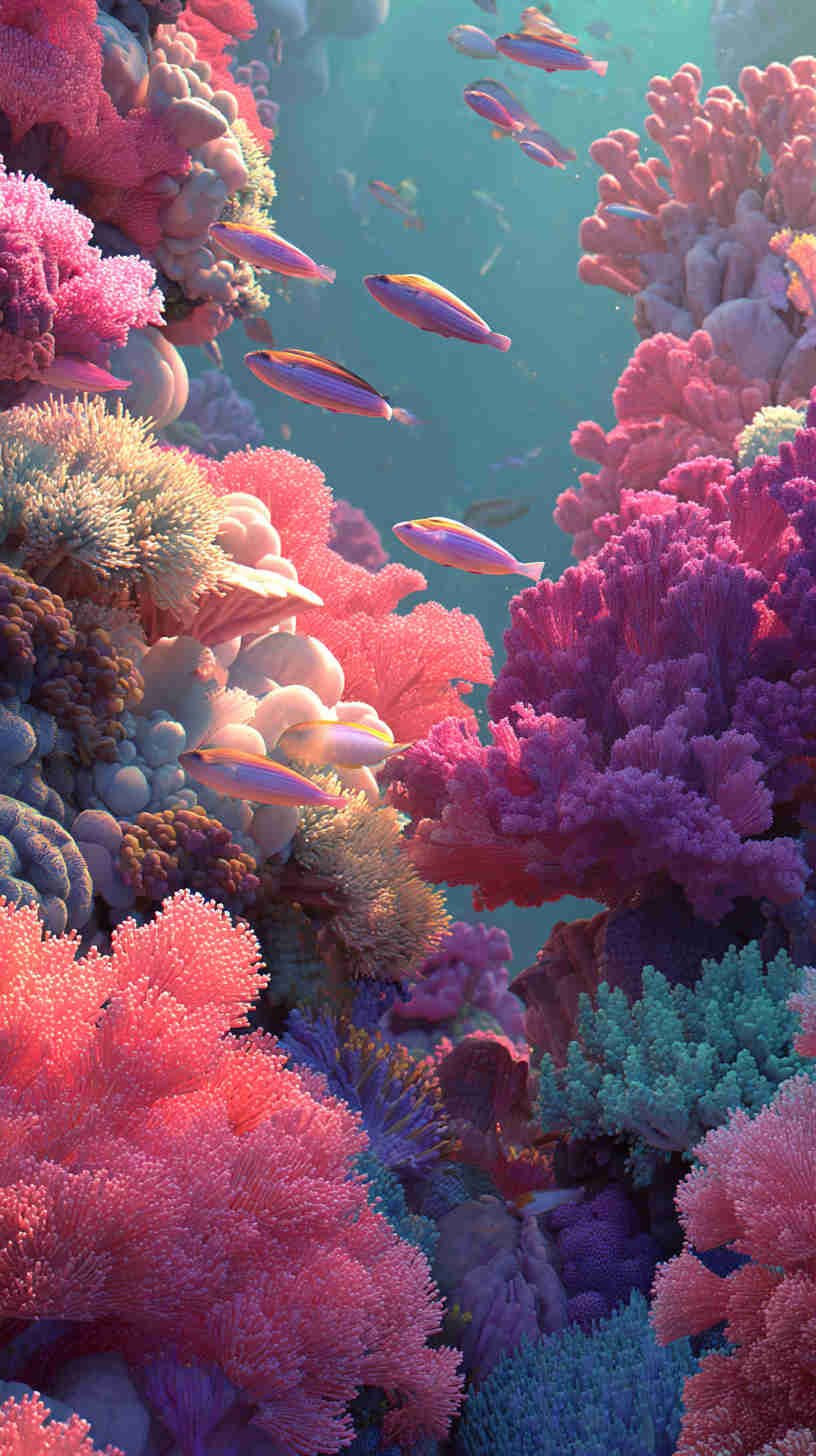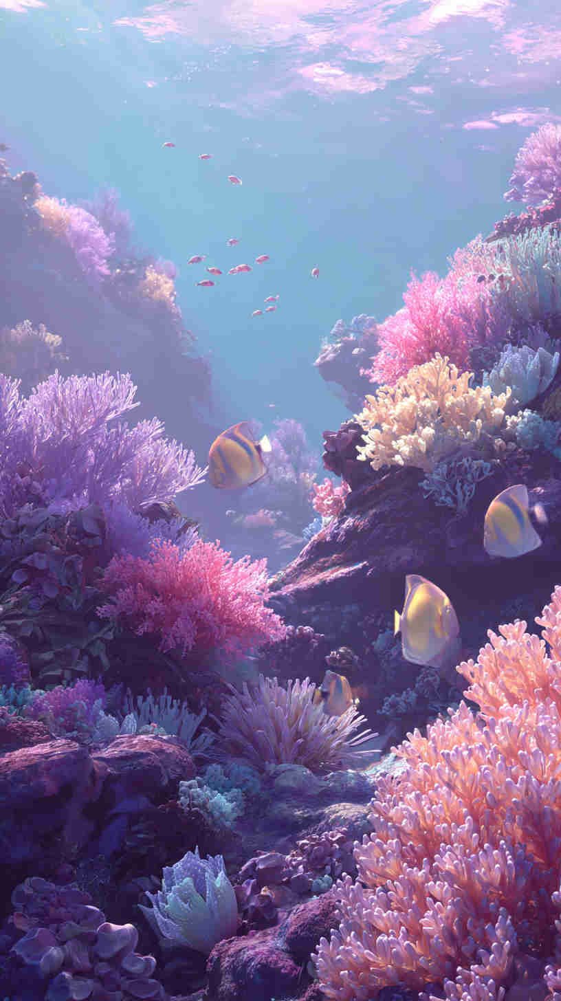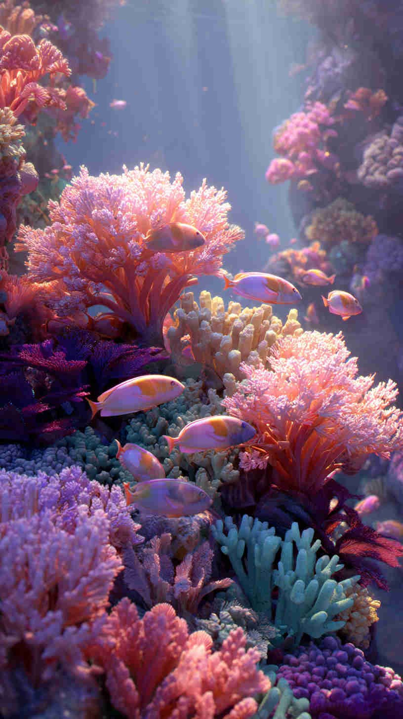 - Misty reef twilight — soft violet-blue tones, distant coral heads fading into haze, faint shafts of fading daylight, dreamlike and slightly melancholic.