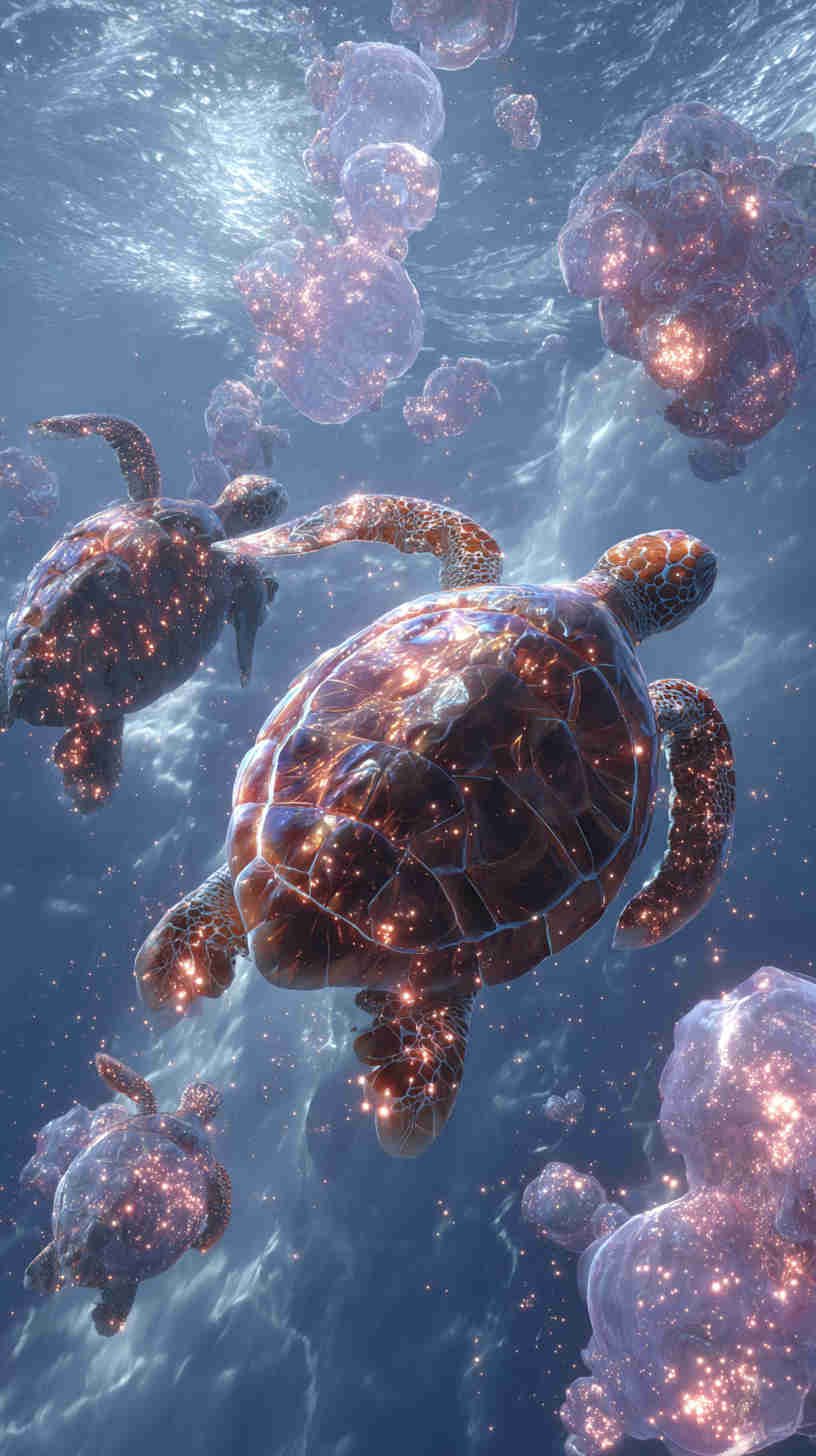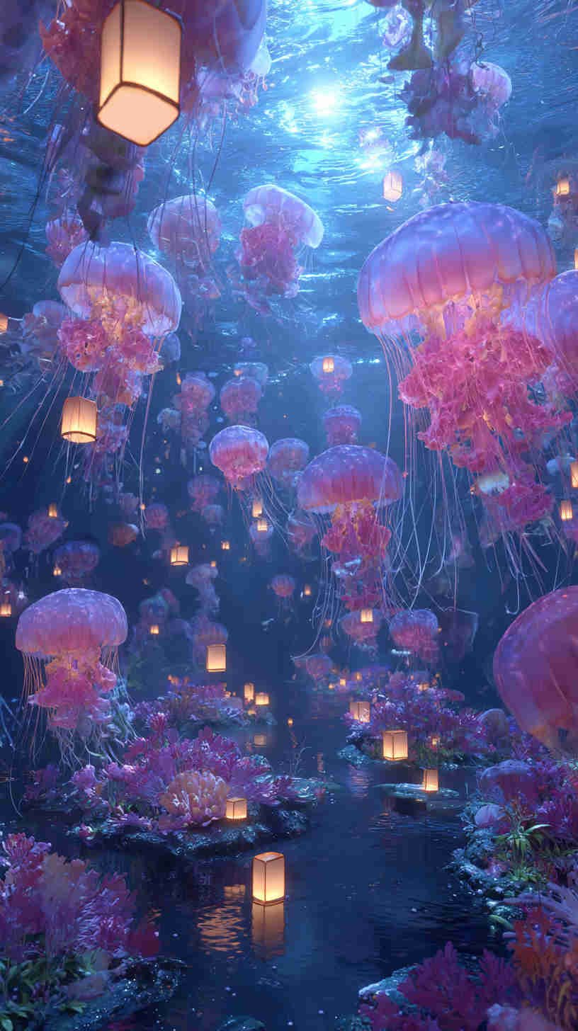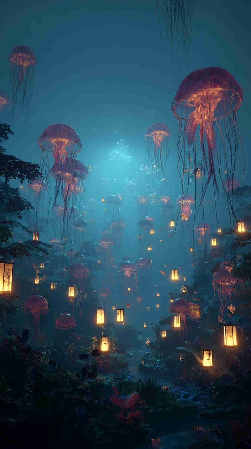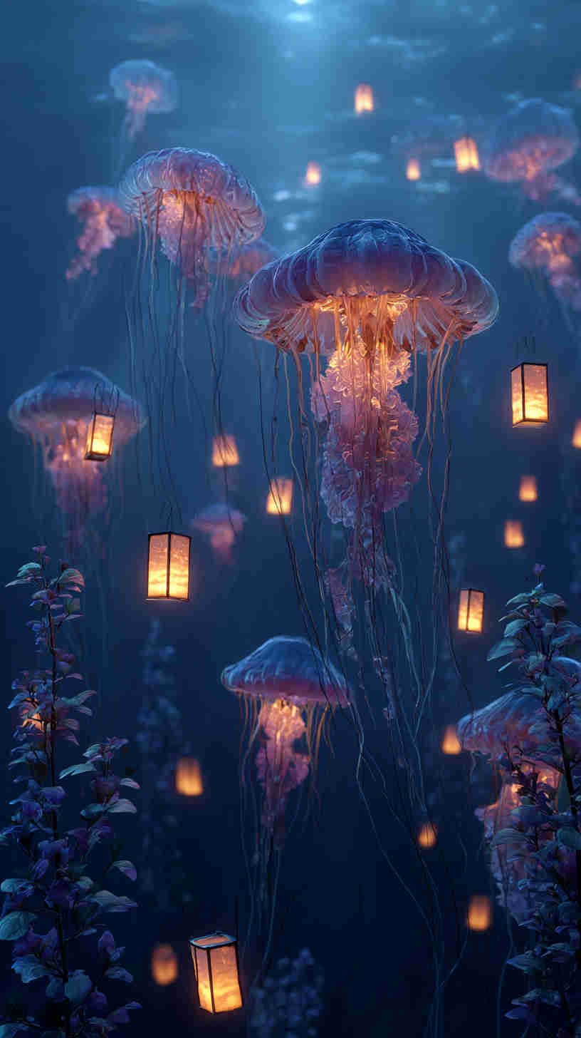- Emotional subtlety — gentle presence of life (single jellyfish, drifting particles, faint fish silhouettes) rather than crowded reef scenes or dramatic predators.