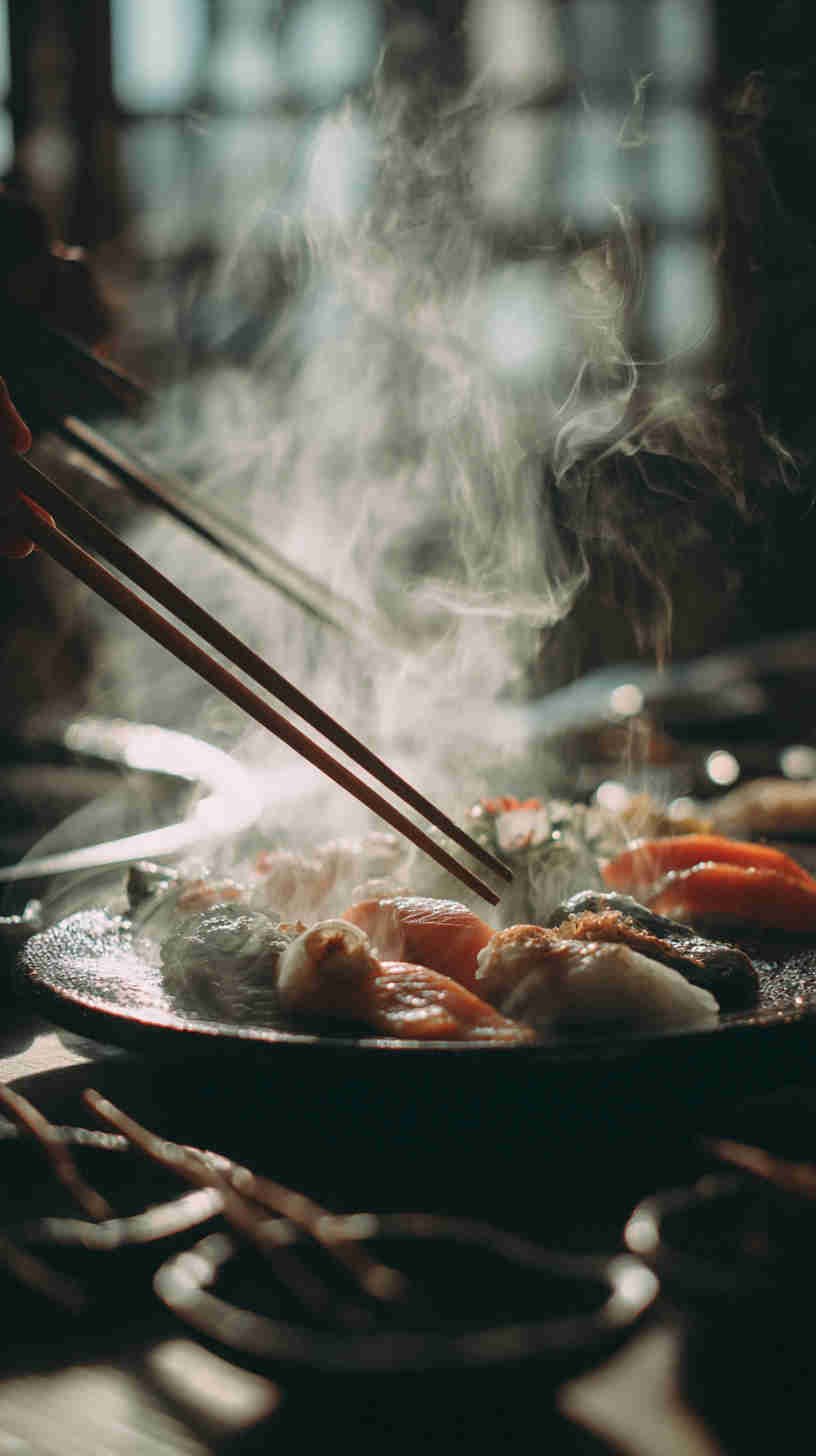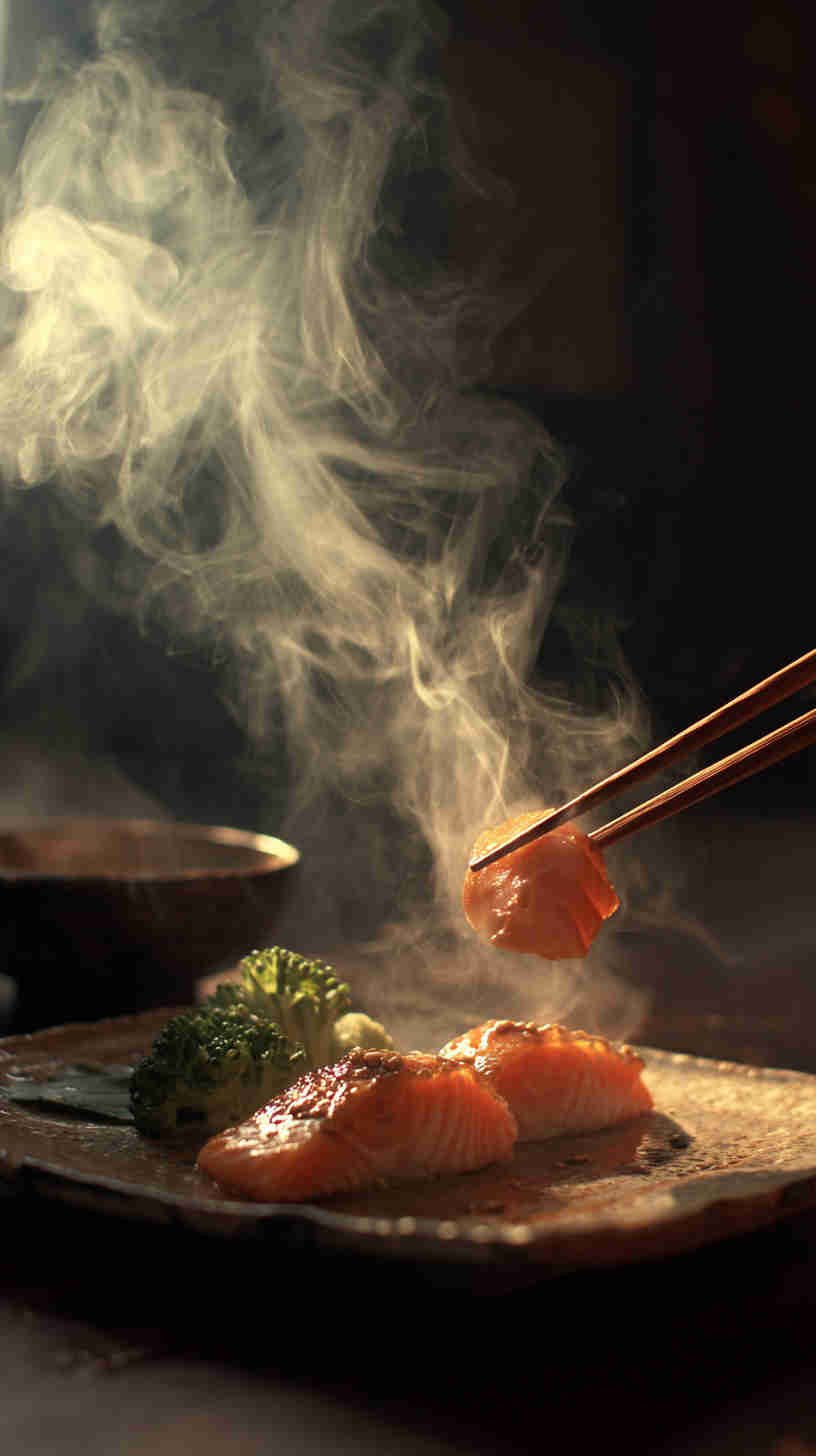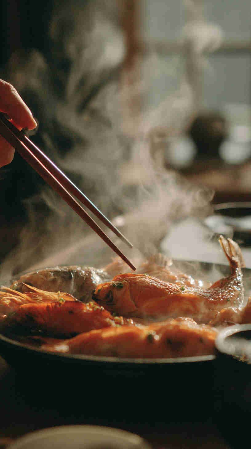 These wallpapers are not generic restaurant menu shots. They celebrate the texture, color, and emotional warmth of real meals: the subtle char marks on grilled mackerel skin, the translucent pearl-like sheen of raw scallops, the buttery yellow of perfectly poached cod, the deep crimson of seared salmon against dark slate plates, steam rising in soft wisps from hot fish soup, and the small human touches (a half-squeezed lemon wedge, chopsticks resting on a ceramic holder, a linen napkin with faint sauce stain, sea salt flakes catching light) that make each scene feel genuinely enjoyed.