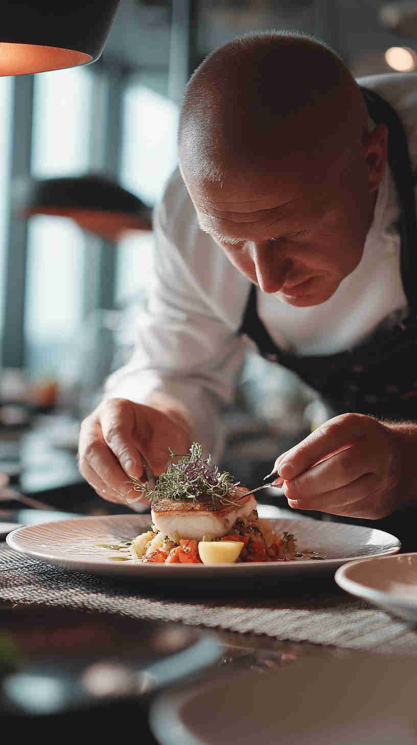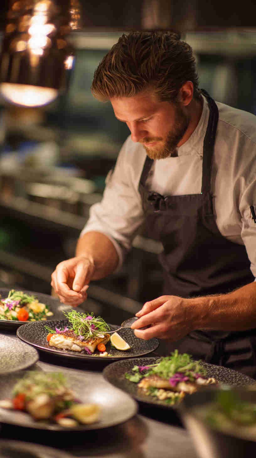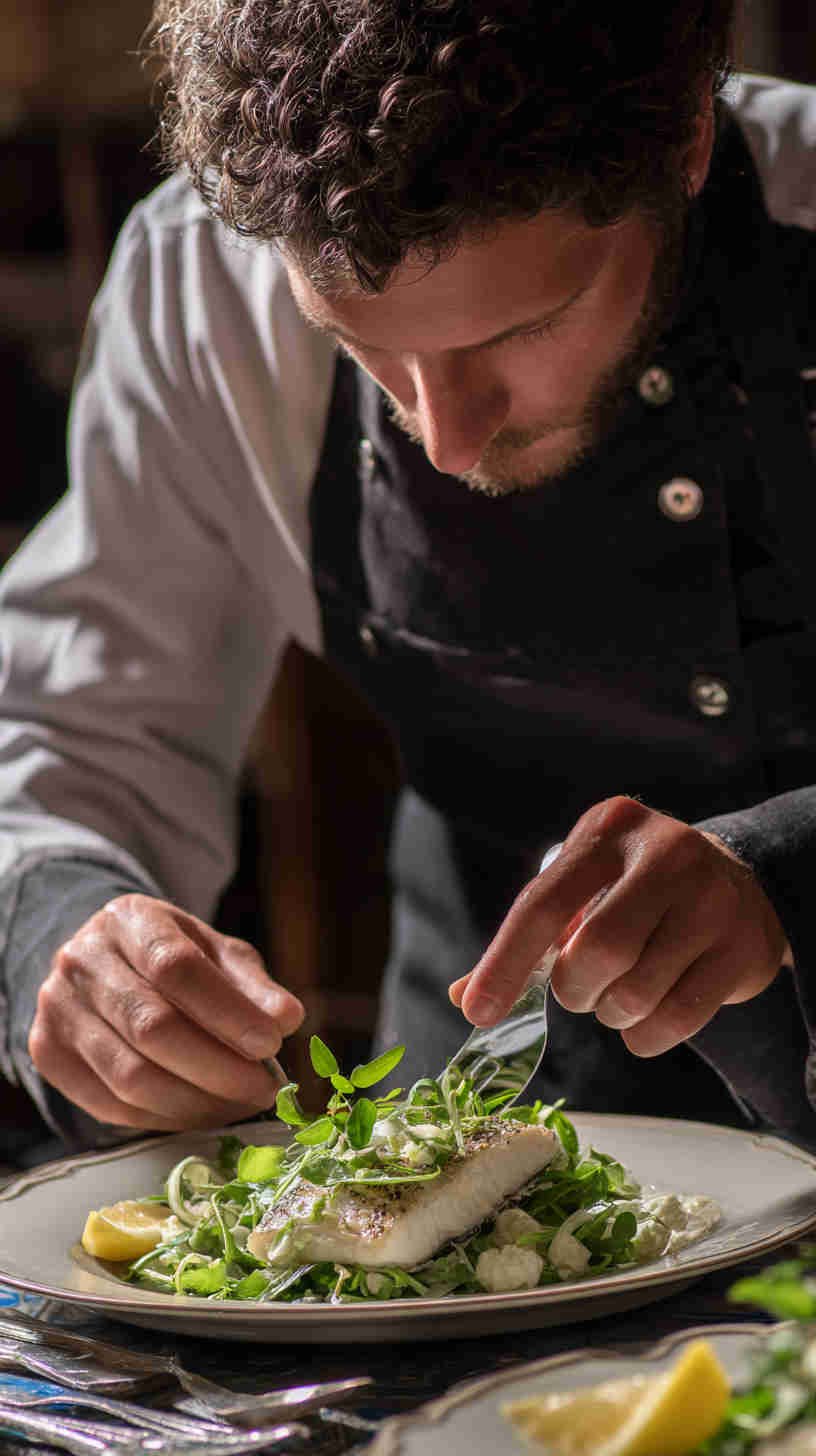 - Natural & cinematic lighting – Soft diffused window light for morning brunch fish, warm golden-hour side-lighting for grilled dishes, cool blue-hour tones for raw preparations, dramatic single-source rim lighting that makes seafood glow.