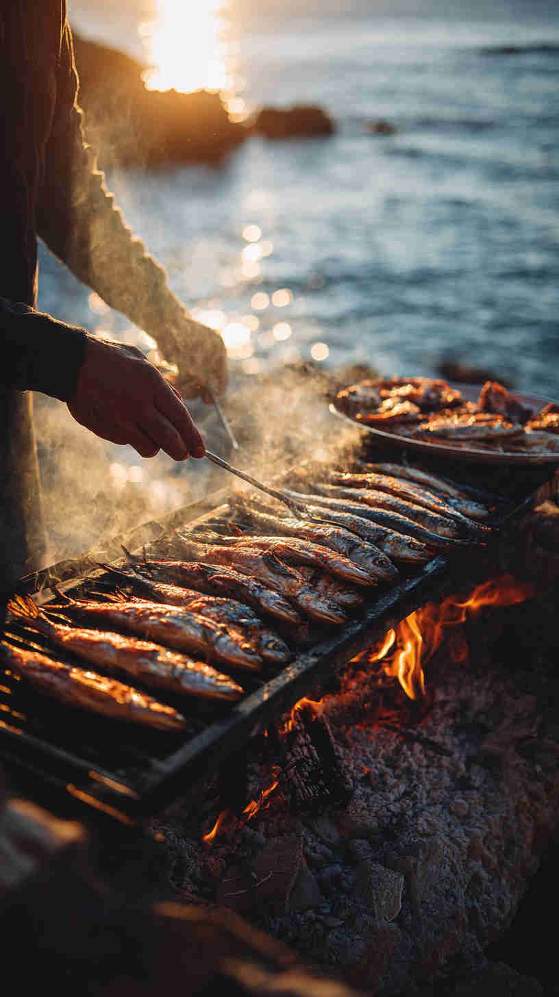 - Family-style grilled sardines — multiple small fish on large platter, charred skin, lemon wedges, rustic linen cloth, golden late-afternoon light, inviting and communal.