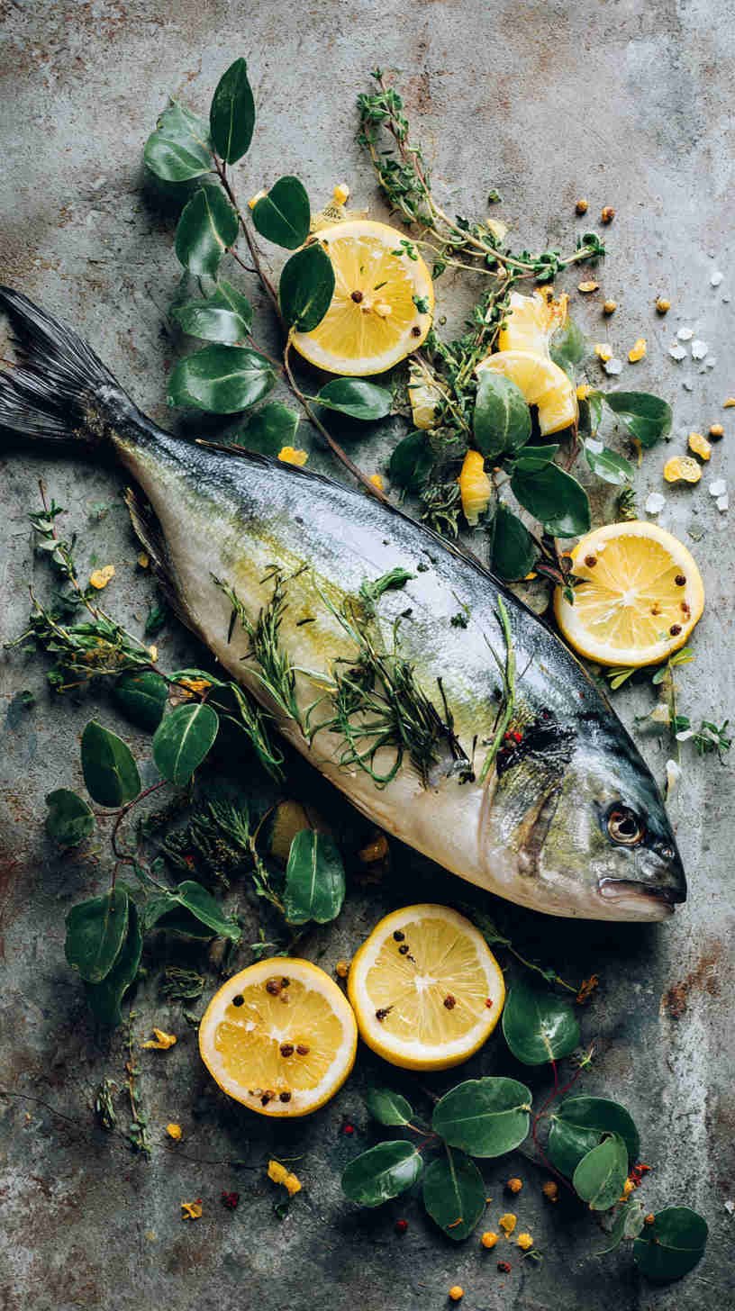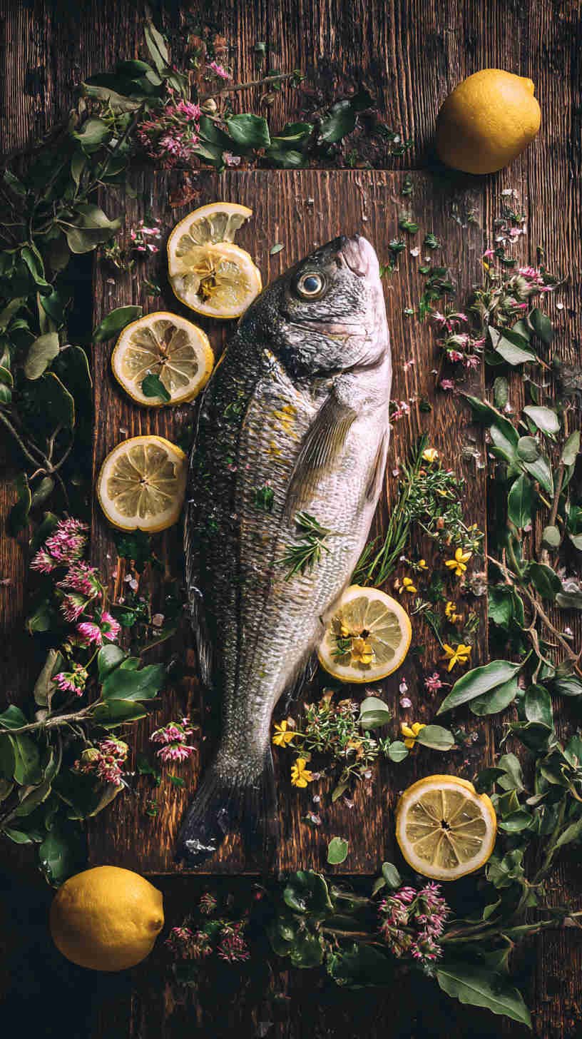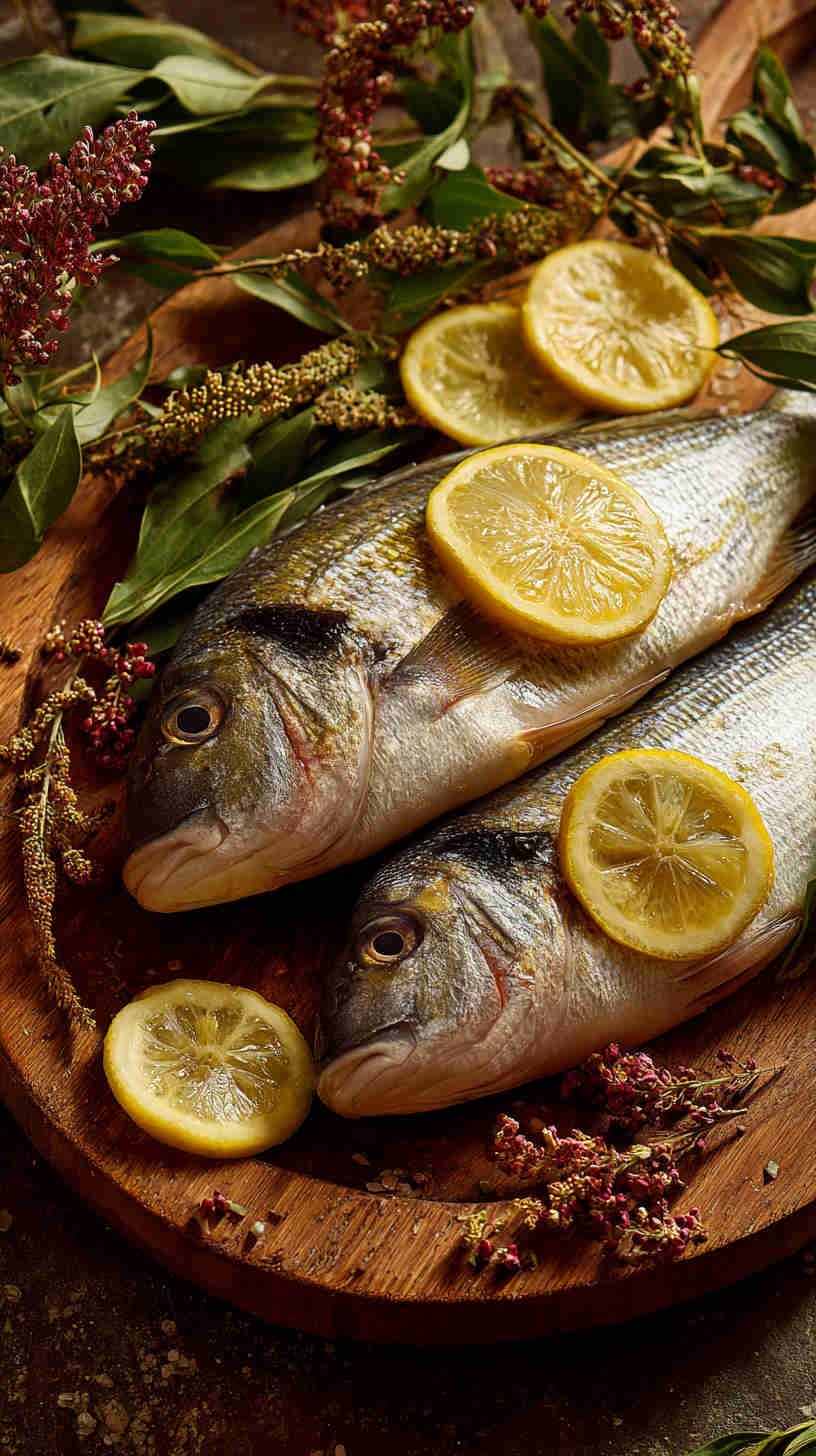 - Golden-hour grilled sea bass — whole fish on slate plate, charred lemon halves, fresh herbs, soft warm side-lighting creating glossy highlights on crispy skin, Mediterranean coastal feel.