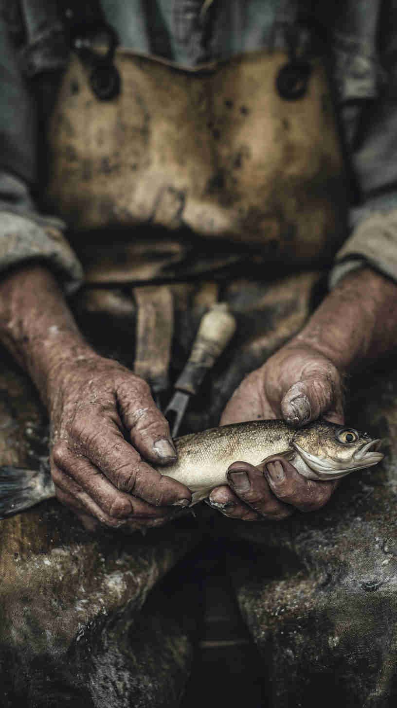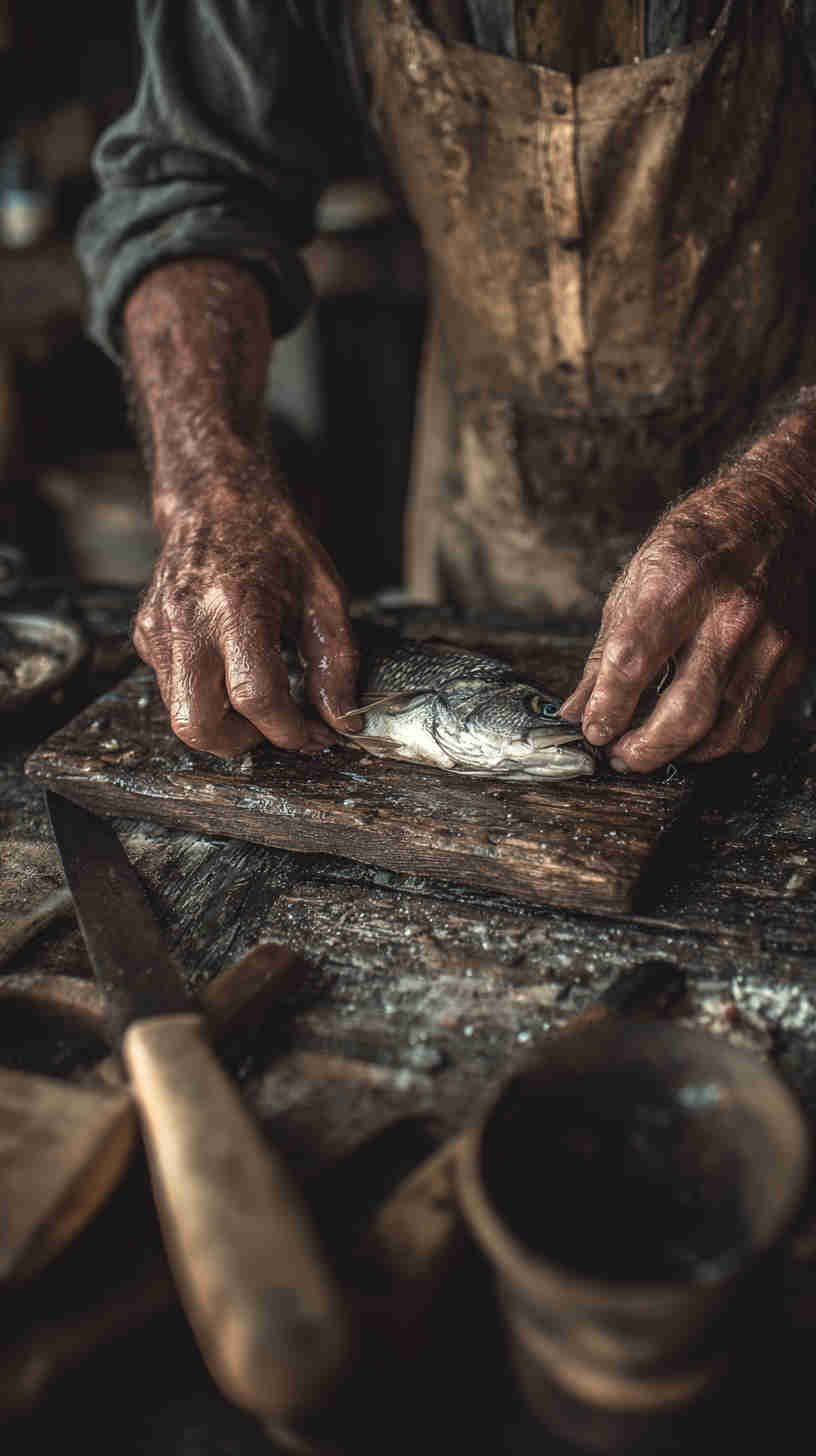 - Food-as-art minimalism — Photographers are treating fish like fine ceramics or geological specimens: clean white or slate plates, neutral backgrounds, natural window light, single-source shadows, and subtle color grading that emphasizes natural tones (silvery skin, coral flesh, golden char, deep red tuna).