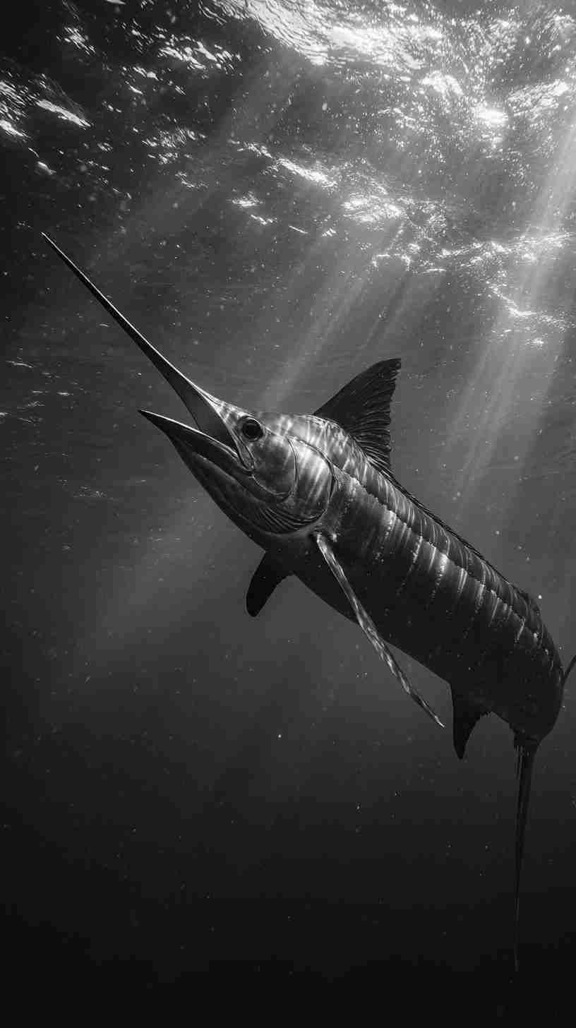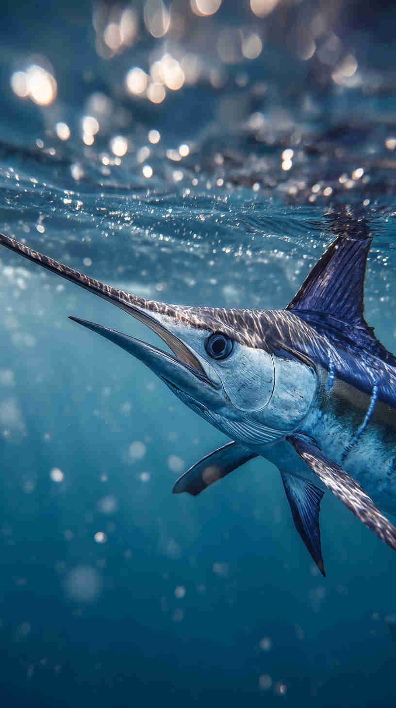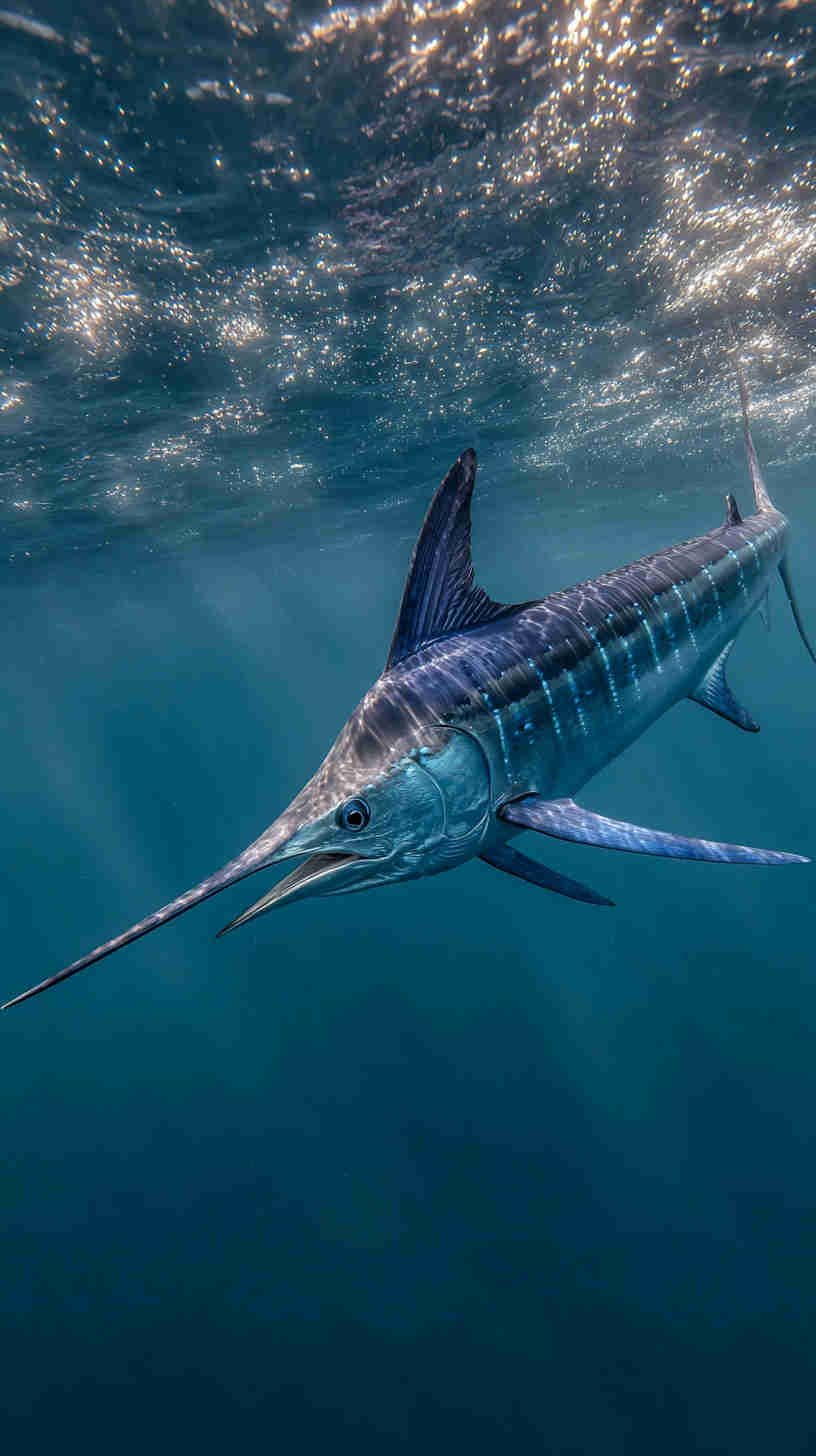 - Silver barracuda open-water run — Sleek silver predator cutting through clear blue, faint motion blur on fins, sunlight catching scales in flashes, powerful yet graceful.