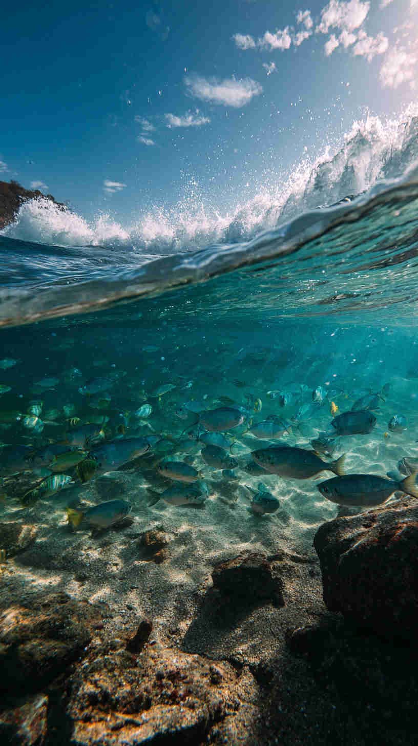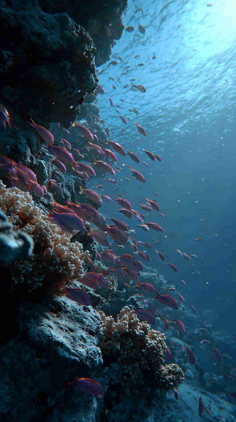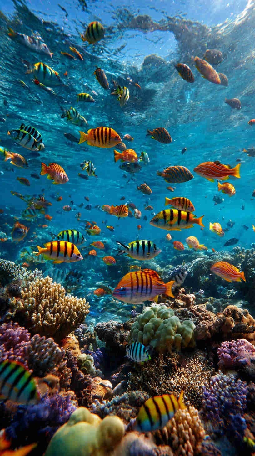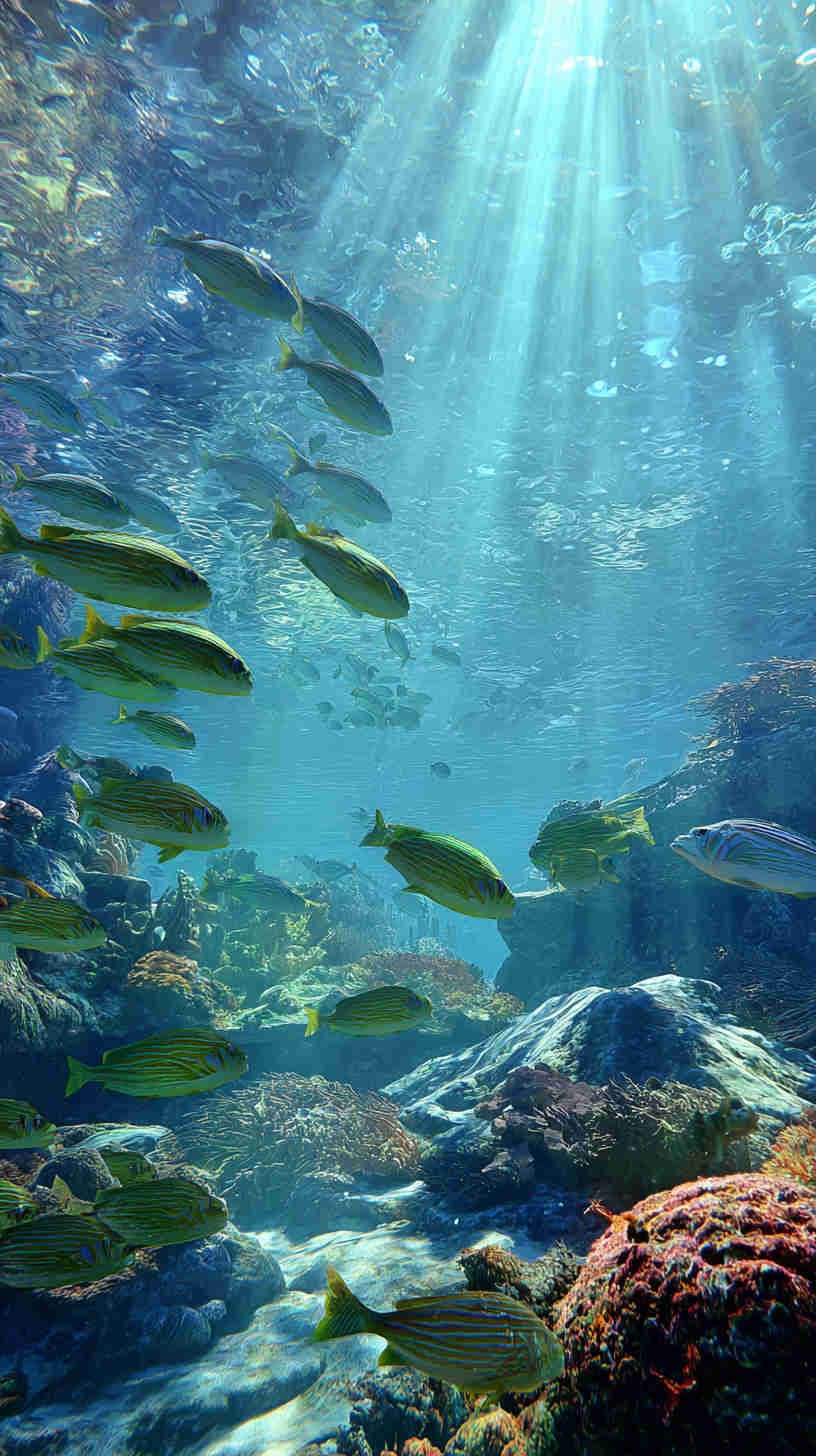 - Unsplash — search “underwater fish,” “coral reef school,” “marine life natural”