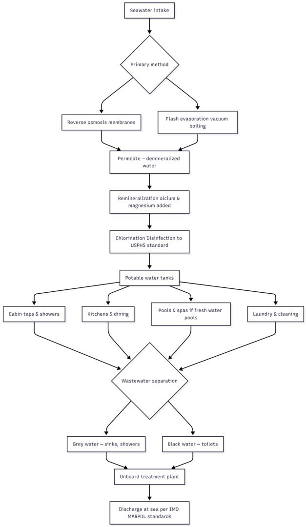Cruise ships generate the vast majority of their fresh water at sea using reverse osmosis and thermal evaporation. Seawater enters the system, salt and impurities are removed, minerals and disinfectant are added, and the result is clean potable water that meets international health standards. Port bunkering supplements this supply but is not the primary source. All wastewater is treated and discharged under strict international regulations. The tap water on your cruise ship is safe to drink.