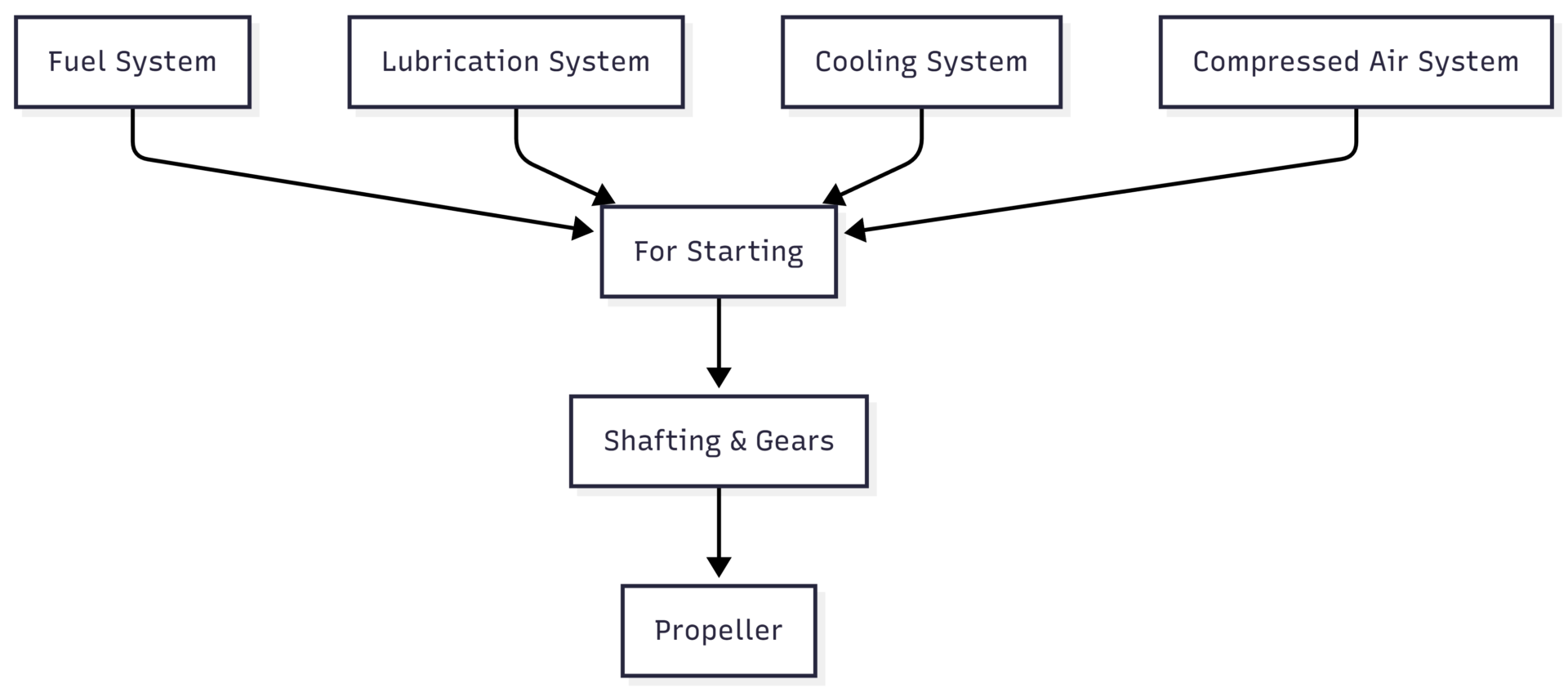 This Mermaid diagram illustrates the flow of the propulsion system, showing how supporting systems feed into the main engine.