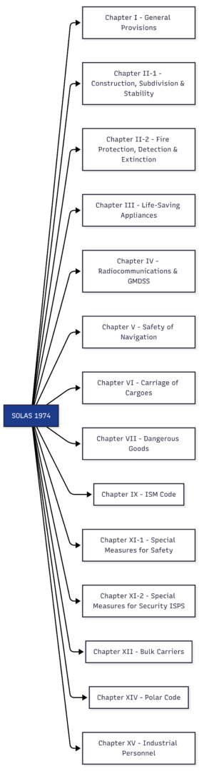 SOLAS 1974 consists of Articles (general obligations) and an Annex divided into 15 Chapters. The most important technical requirements are found in Chapters II-1 to XIV.