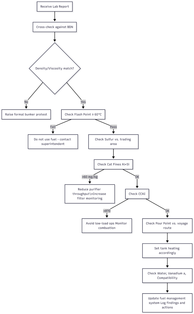 Always verify fuel parameters against ISO 8217 and applicable flag state/classification society requirements. Consult your technical superintendent before taking action on out-of-spec results.