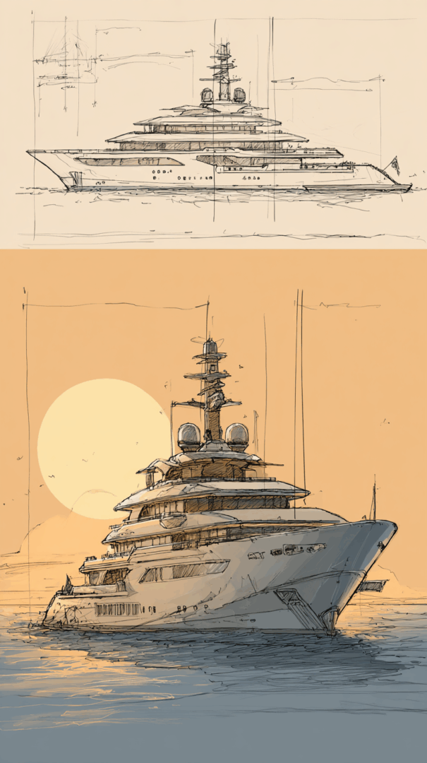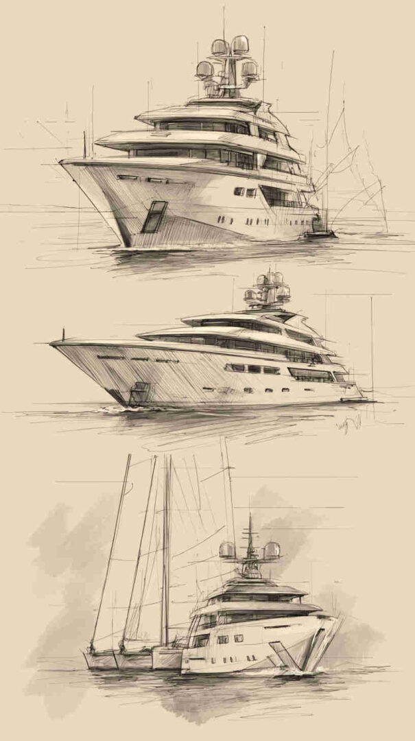 - Luxury Yacht Details: Intricate yacht designs with polished decks and sleek lines, set against open oceans, perfect for detailed technical drawings or luxurious compositions.