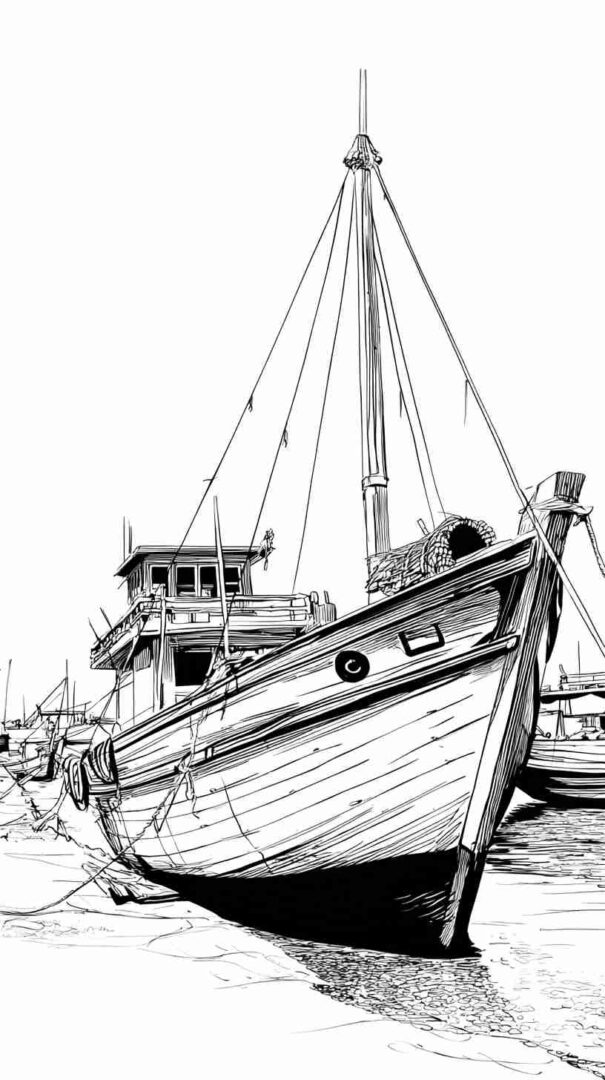 - Rustic Fishing Boat Textures: Weathered fishing boats with textured hulls and ropes, set in rugged harbors, offering rich details for realistic or impressionistic drawings.